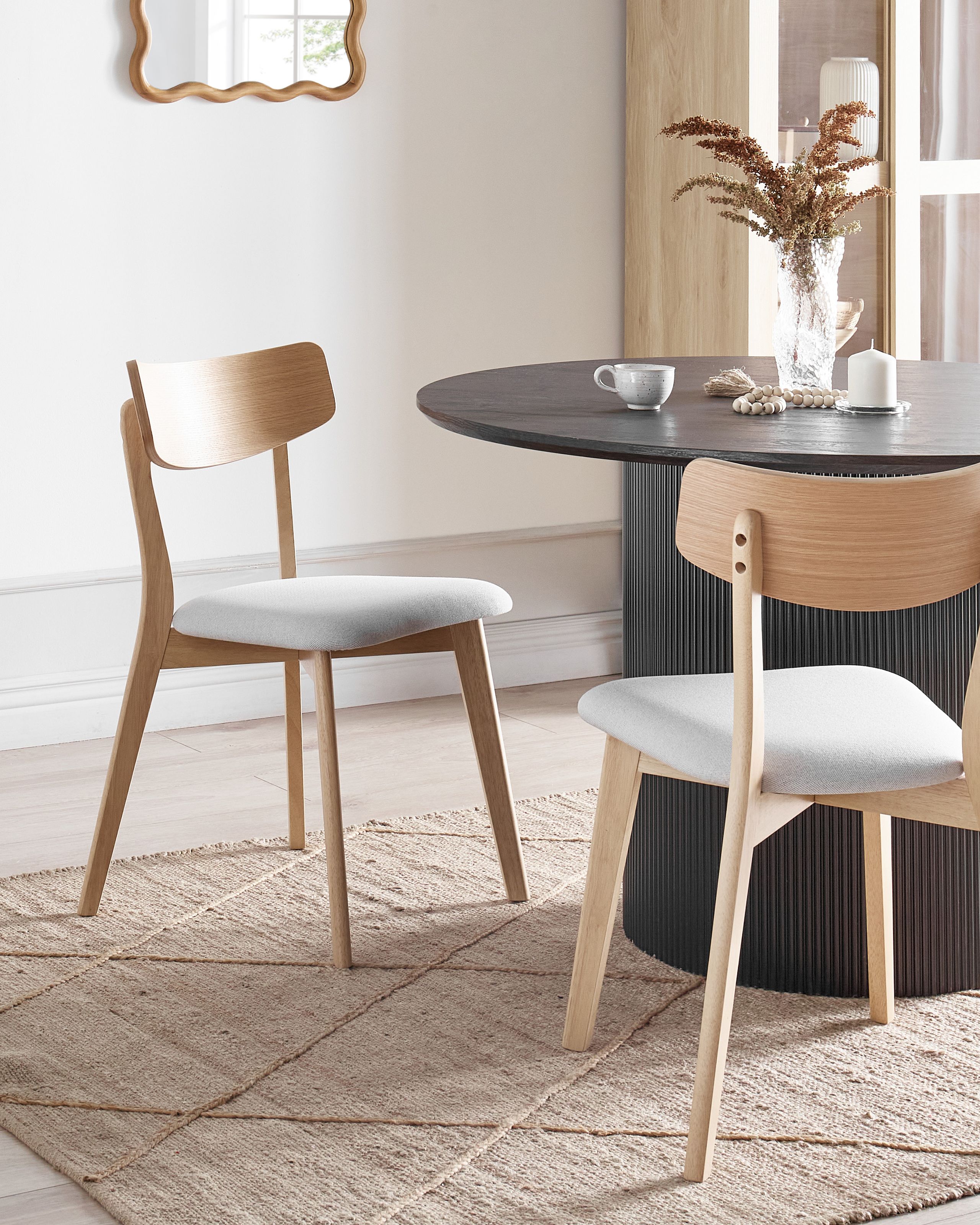 Retrotyylinen tuolisetti. Lisää kotiin ajatonta viehätystä tällä kahden retrotyylisen ruokatuolin setillä. Vankat, luonnollisesta kumipuusta valmistetut rungot tarjoavat kestävää tukea, ja puun näkyvät syyt ja solmut lisäävät ripauksen rustiikkista eleganssia. Istuimet on verhoiltu kestävällä polyesterikankaalla, joka tarjoaa mukavuutta ja tyyliä sekä sointuu täydellisesti vintage-tyylin inspiroimaan muotoiluun. Tuolit sopivat erinomaisesti ruokailuun tai korostustuoleiksi, yhdistäen saumattomasti esteettisen ulkonäön ja toiminnallisuuden.