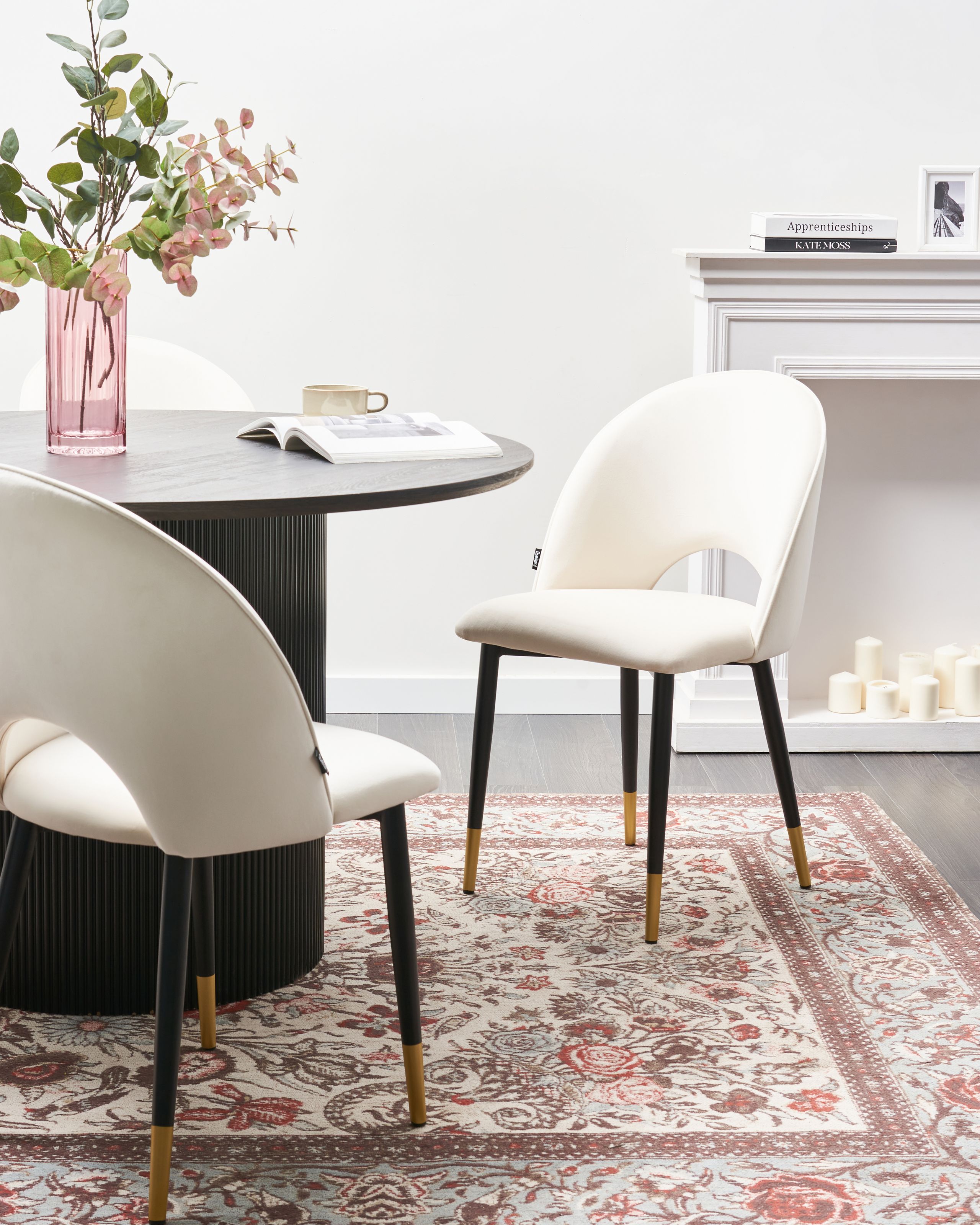 Glamour-tyyliset verhoillut tuolit. Tuo kotiisi retrotunnelmaa näillä erittäin hienostuneilla tuoleilla. Tuolien rungot on verhoiltu miellyttävän tuntuisella sametilla, kun taas kullanvärisillä korosteilla viimeistellyt jalat ovat metallia. Paksusti pehmustetut istuimet ja tyylikkäästi kaartuvat selkänojat takaavat istumamukavuuden ja oikeanlaisen tuen. Tuolit näyttävät erittäin hyviltä etenkin perinteisissä, vintage- tai glamour-tyylisissä sisustuksissa, toimien ruokailutilan käytännöllisinä istuimina ja korostuskappaleina.