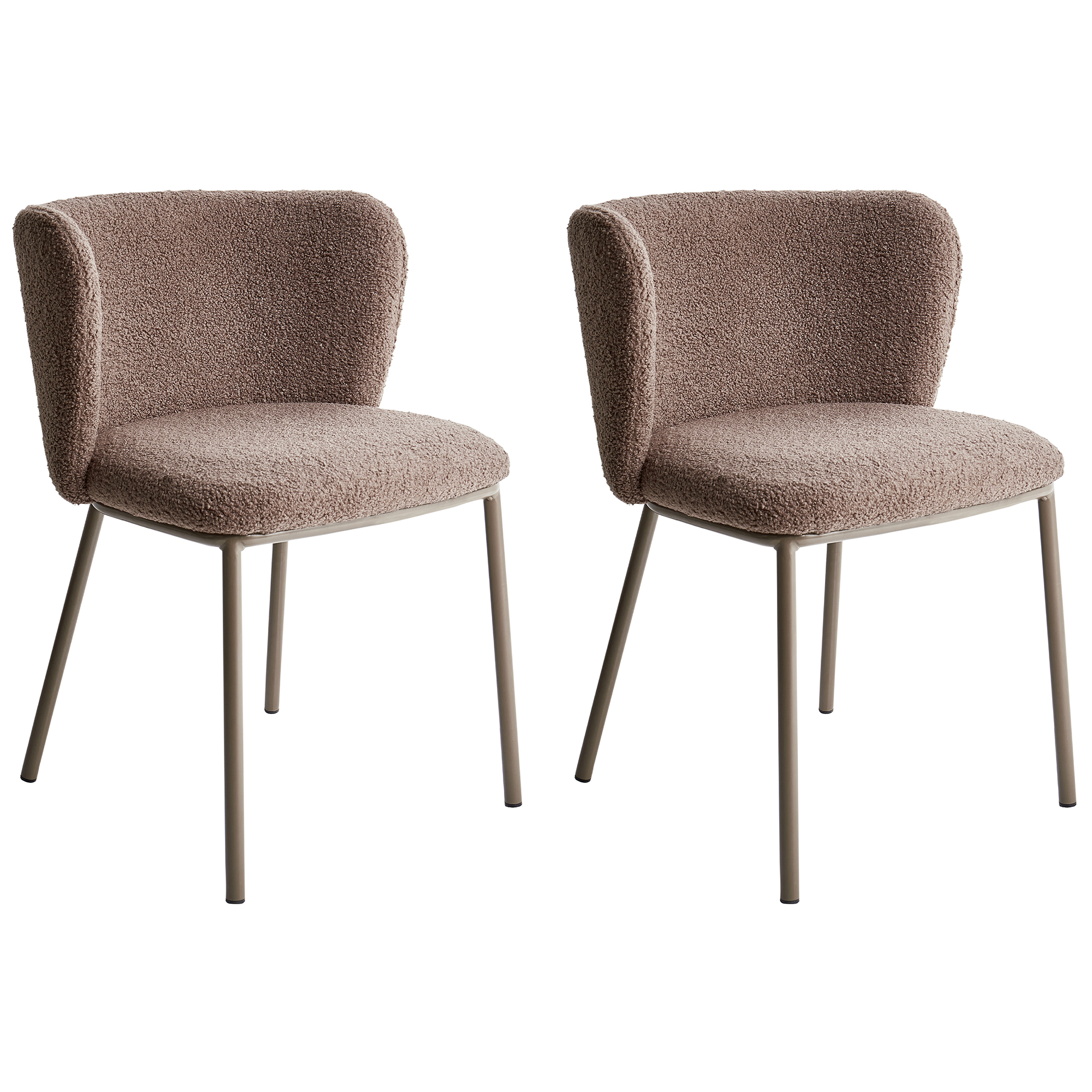 Moderni käsinojaton tuolisetti. Tee ruokailutilasta erottuva tällä tyylikkäällä kahden ruokatuolin setillä. Kestävällä vaaleanruskealla bukleekankaalla verhoiltujen tuolien jalat on valmistettu saman sävyisestä jauhemaalatusta raudasta. Materiaaliensa ansiosta ne kestävät vuosien käytön, kun taas värimaailma nostaa huoneen sisustuksen uusiin korkeuksiin. Kussakin tuolissa on kauniisti kaartuva selkänoja, joka takaa mukavuuden. Käsinojattoman muotoilun ansiosta ne on helppo työntää pöydän alle silloin, kun niitä ei tarvita.