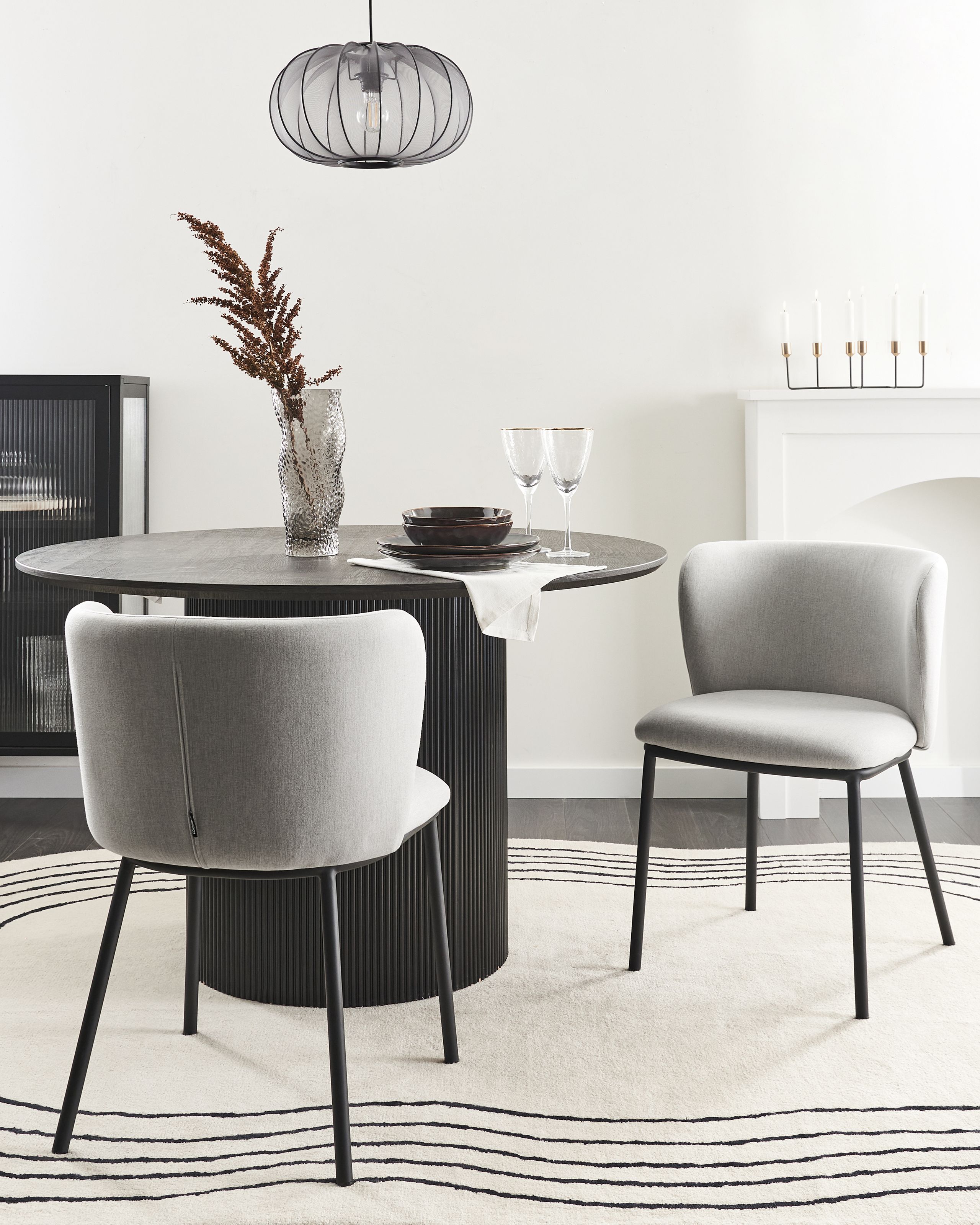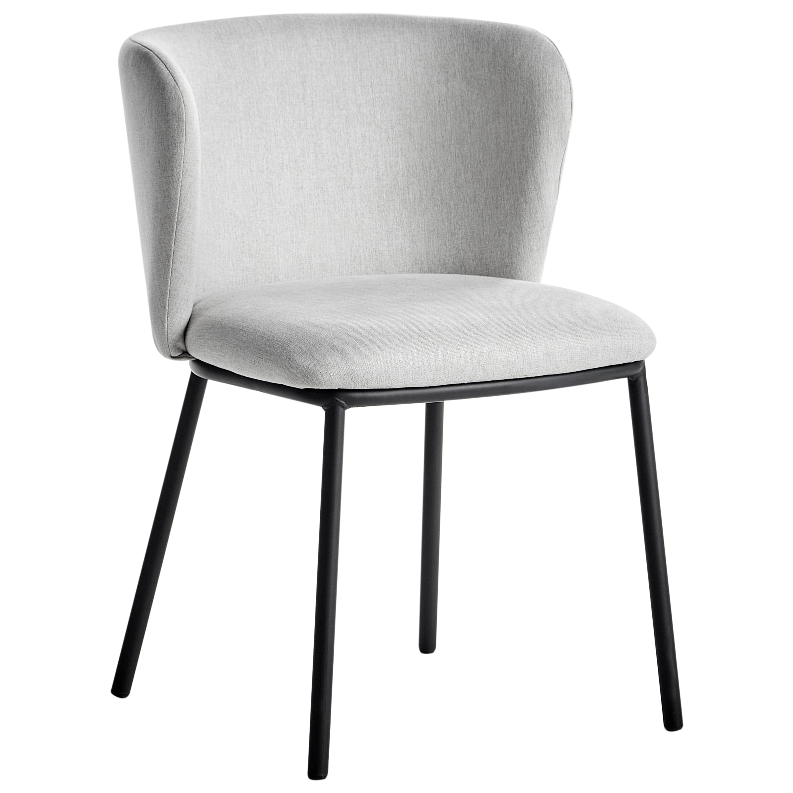 Moderni käsinojaton tuolisetti. Tee ruokailutilasta erottuva tällä tyylikkäällä kahden ruokatuolin setillä. Kestävällä vaaleanharmaalla polyesterikankaalla verhoiltujen tuolien jalat on valmistettu mustaksi jauhemaalatusta raudasta. Materiaaliensa ansiosta ne kestävät vuosien käytön, kun taas värimaailma nostaa huoneen sisustuksen uusiin korkeuksiin. Kussakin tuolissa on kauniisti kaartuva selkänoja, joka takaa mukavuuden. Käsinojattoman muotoilun ansiosta ne on helppo työntää pöydän alle silloin, kun niitä ei tarvita.