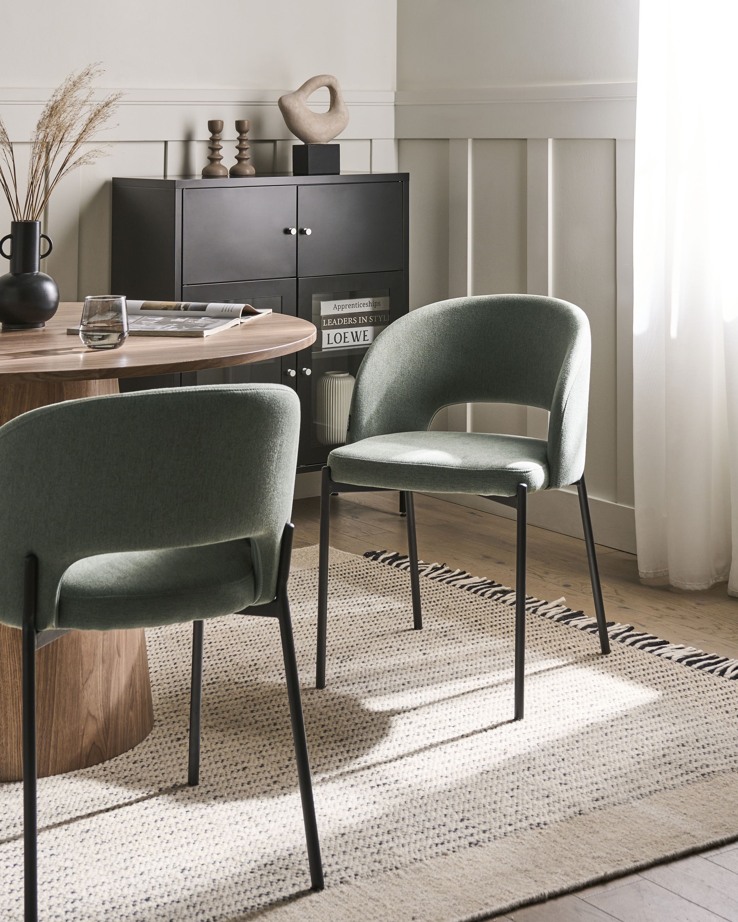 Retrotyyliset keittiön tuolit. Päivitä ruokailutila tällä kahden modernin tuolin setillä, joka on verhoiltu korkealaatuisella, kestävällä kankaalla. Leikatut selkänojat lisäävät ripauksen retrohenkeä, kun taas mustat metallijalat ja suojaavat jalkatapit tarjoavat tukevan tuen sekä tyylikkään viimeistelyn vahingoittamatta lattiaa. Tuolit sopivat täydellisesti sekä rentoihin aterioihin että muodollisiin tilaisuuksiin, yhdistäen vaivattomasti mukavuuden ja tyylin.