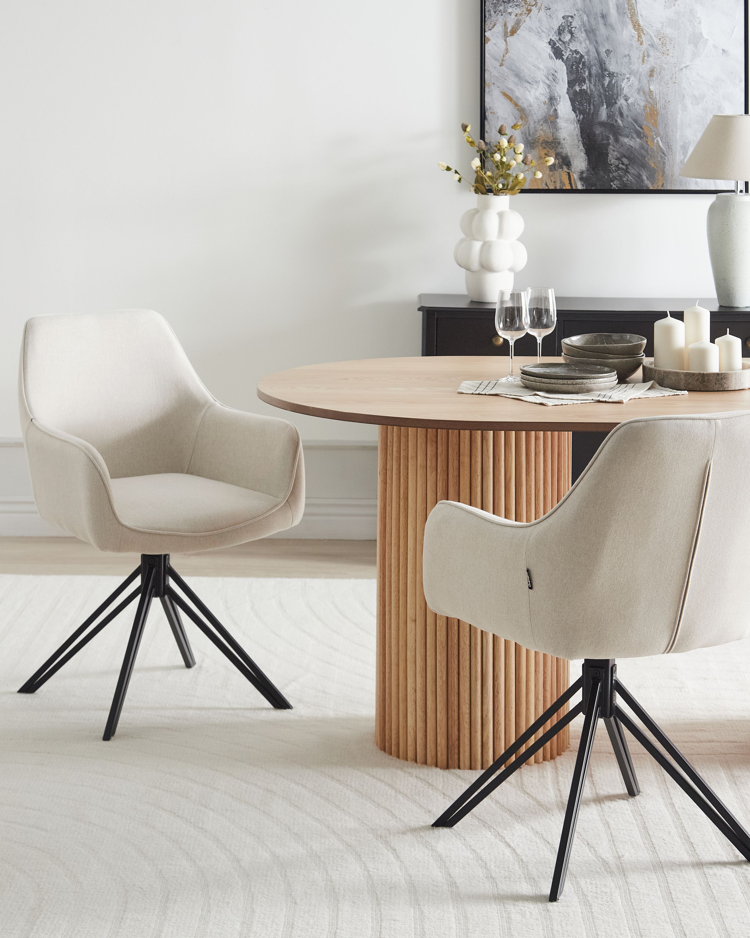 Kääntyvä verhoiltu tuolisetti. Kohota kotiasi tällä elegantilla ja monikäyttöisellä tuolisetillä. Sulava 180 asteen kääntötoiminto, laadukas vaaleanbeige polyesterikangasverhoilu ja vankat mustat rautajalat takaavat toimivuuden sekä tyylikkyyden. Tämä kahden tuolin setti sopii täydellisesti viihtyisän mutta modernin tunnelman luomiseen, tarjoten sekä mukavuutta että kestävyyttä jokaisessa tilaisuudessa.