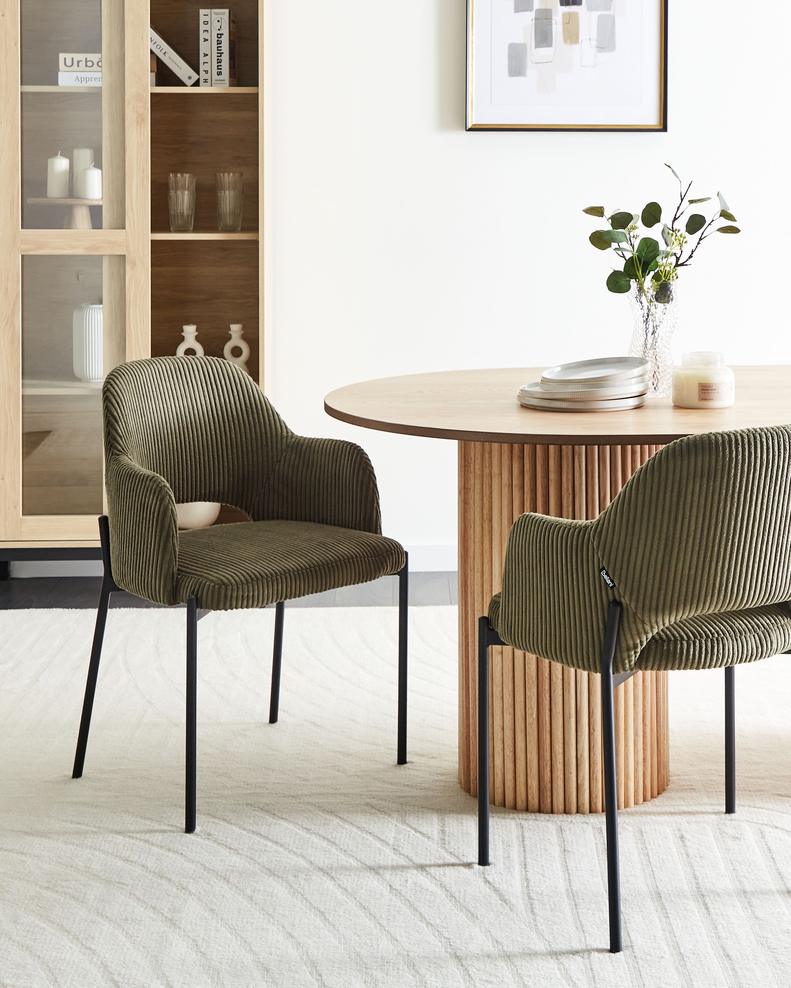Retrotyylinen käsinojallinen tuolisetti. Tämä kahden ruokatuolin setti on näyttävä valinta mihin tahansa kotiin. Pehmeä, teksturoitu vakosamettiverhoilu korostaa retrohenkistä ilmettä, kun taas siro, tukeva runko pitää muotoilun kevyenä ja ilmavana. Tukevat ja tyylikkäät mustat rautajalat takaavat vakauden. Tuolit sopivat täydellisesti vintage-tyylisen yksityiskohdan lisäämiseen moderniin tai perinteiseen sisustukseen, tarjoten vaivattoman yhdistelmän mukavuutta ja luonnetta.