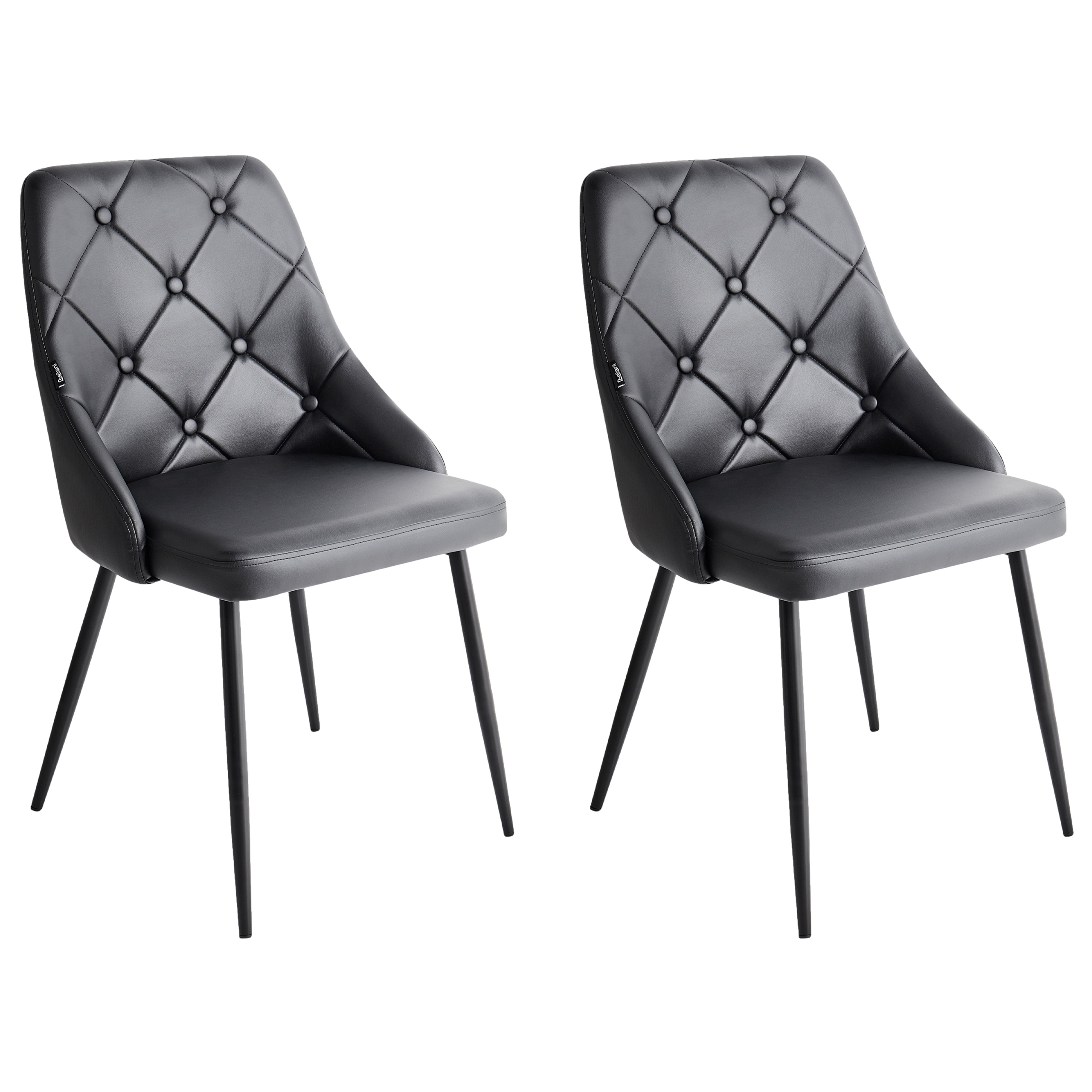 Hurmaava tuolisetti koristenapeilla. Lisää ripaus glamouria mihin tahansa moderniin ruokailutilaan tällä upealla tuolisetillä. Klassisesti muotoillut ruokatuolit tarjoavat hienostuneen ilmeen ajattoman mustalla keinonahkaverhoilullaan ja timanttitikatuilla, nappikoristeluilla selkänojillaan. Ylellisen pehmeät istuimet luovat mukavan istumapaikan ruokailun ajaksi. Verhoilua täydentävät sirot, mustaksi jauhemaalatut rautajalat, jotka tarjoavat vakautta ja kohottavat tuolien yleisilmettä.