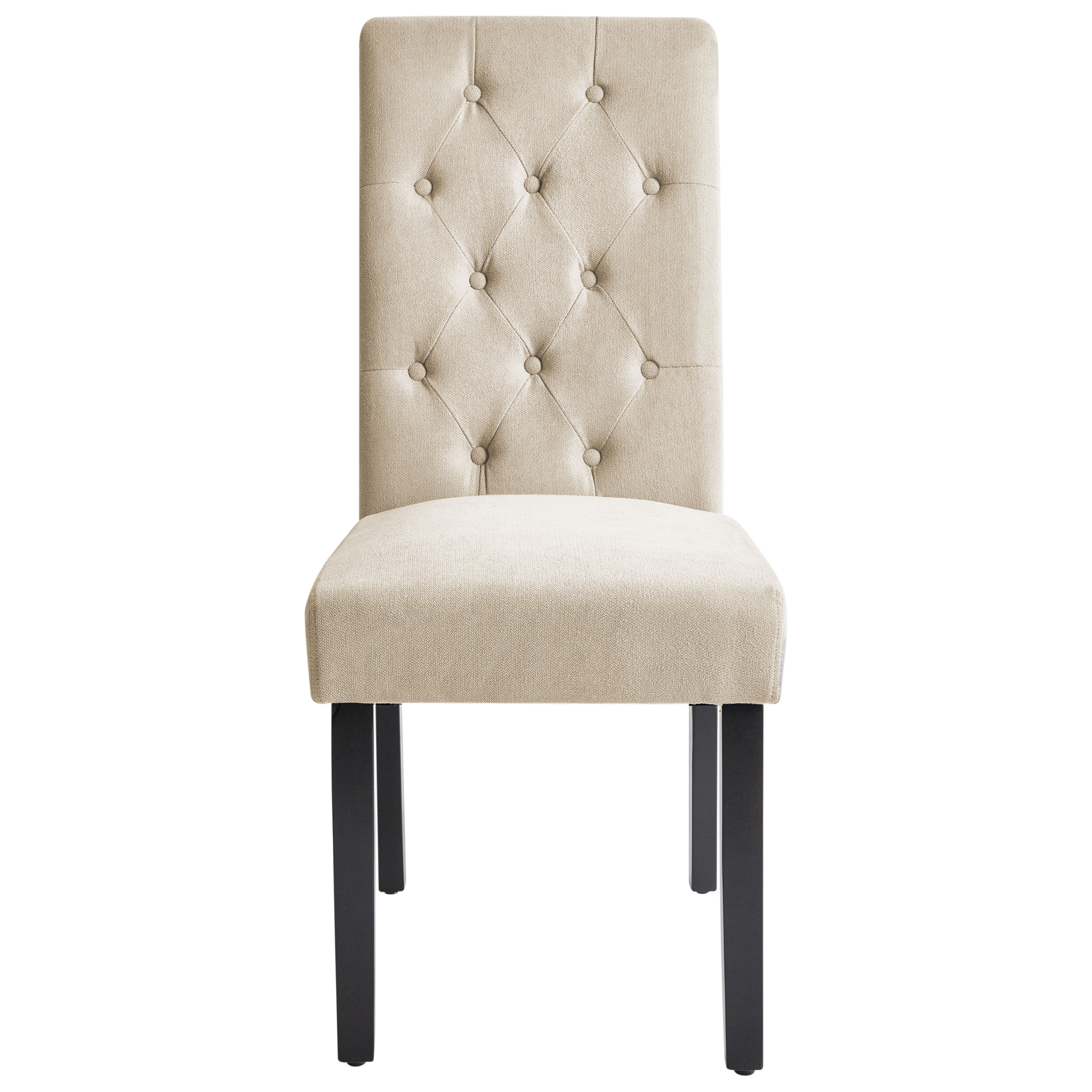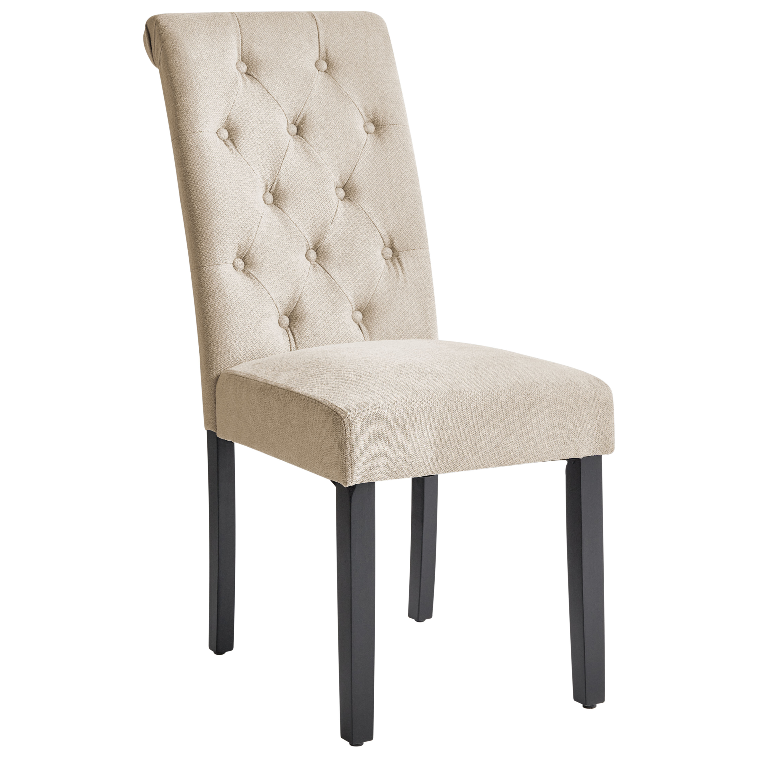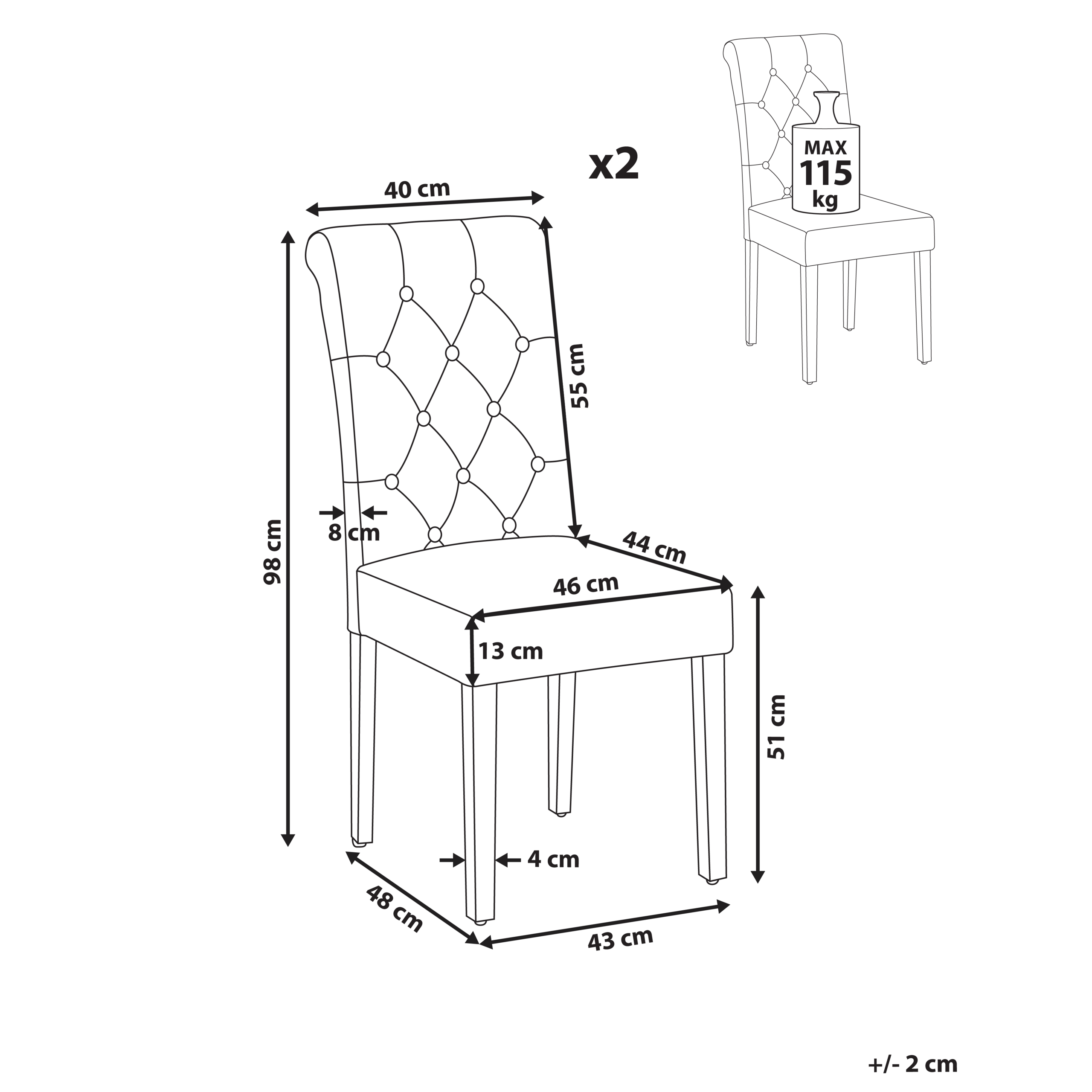 Ominaisuudet: Korkea selkänoja ja kiinteä istuin, Vakaat jalat maksimaalisen mukavuuden takaamiseksi, Klassinen muotoilu, Nappikoristelu, Täysin verhoiltu, Jaloissa tapit lattian suojaamiseen