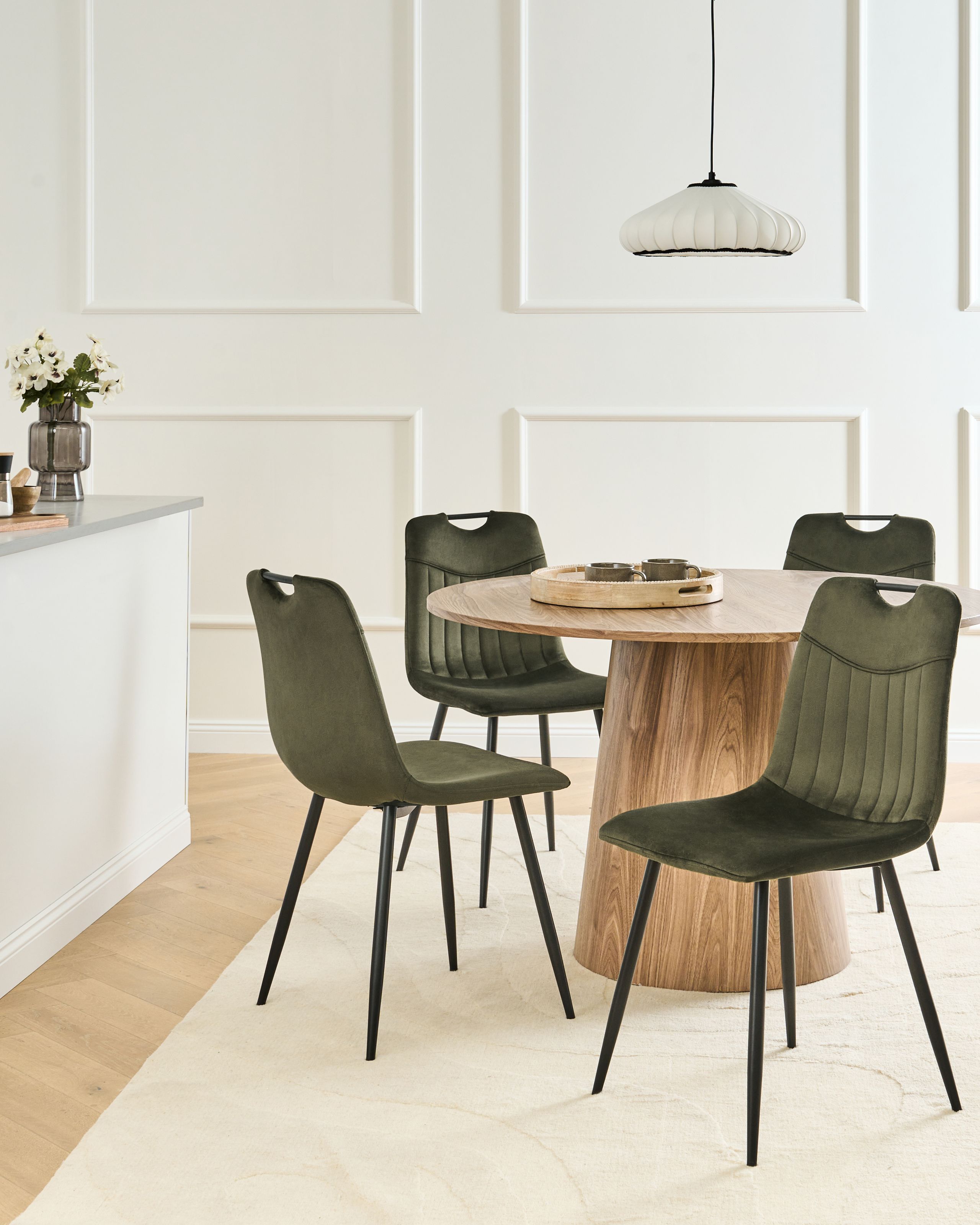 Glamour-tyyliset verhoillut tuolit. Näissä ruokatuoleissa yhdistyvät mukavuus, toiminnallisuus ja ajaton glamour-tyyli. Tuolien selkänojissa on kätevät kahvat, joten niitä on helppo siirtää tarvittaessa. Pehmeä samettiverhoilu ja hienostunut tikkaus tuovat ylellisyyttä, kun taas tukevat metallijalat takaavat kestävyyden. Monipuoliset ja tyylikkäät tuolit sopivat saumattomasti ruokailutiloihin tai olohuoneisiin eri sisustustyyleissä.