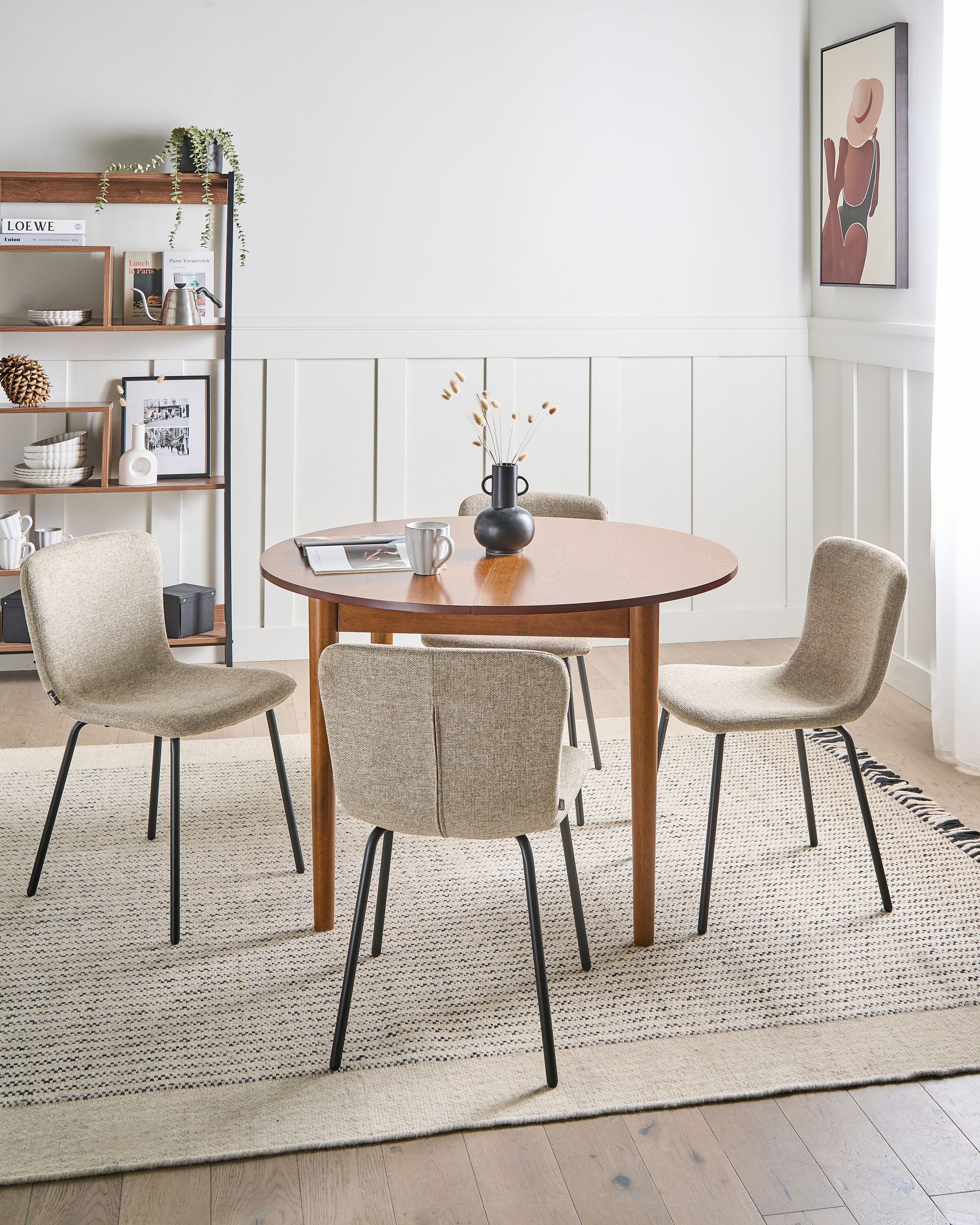 Minimalistiset keittiön tuolit ilman käsinojia. Tuo ruokailutilaan harmoniaa ja mukavuutta tällä nejän tuolin setillä. Kangasverhoillut istuimet ja pyöristetyt muodot tarjoavat sekä tukea että tyyliä, kun taas minimalistiset rungot pitävät muotoilun kevyenä ja nykyaikaisena. Täydelliset kokoontumisiin, olivatpa ne rentoja tai muodollisia.