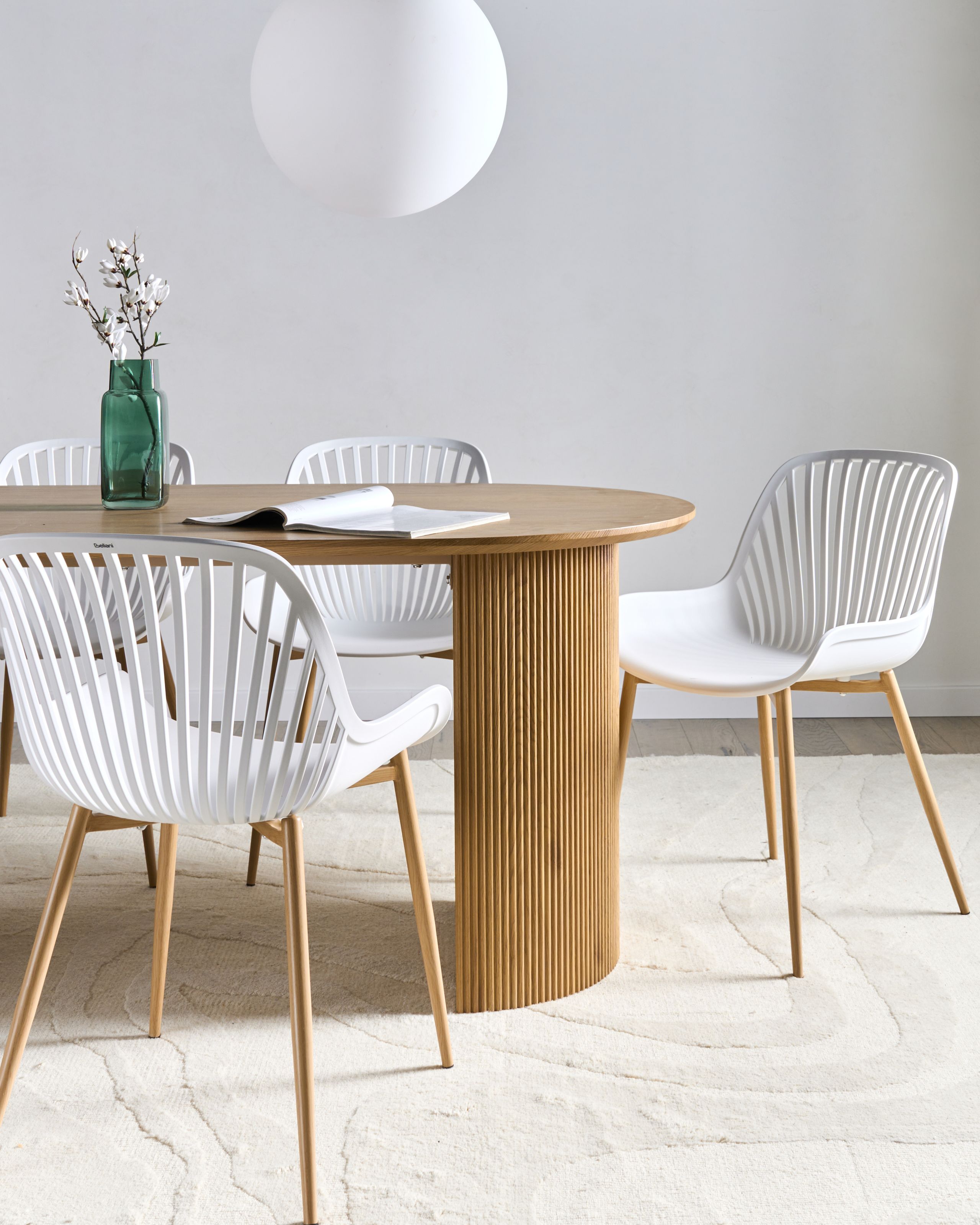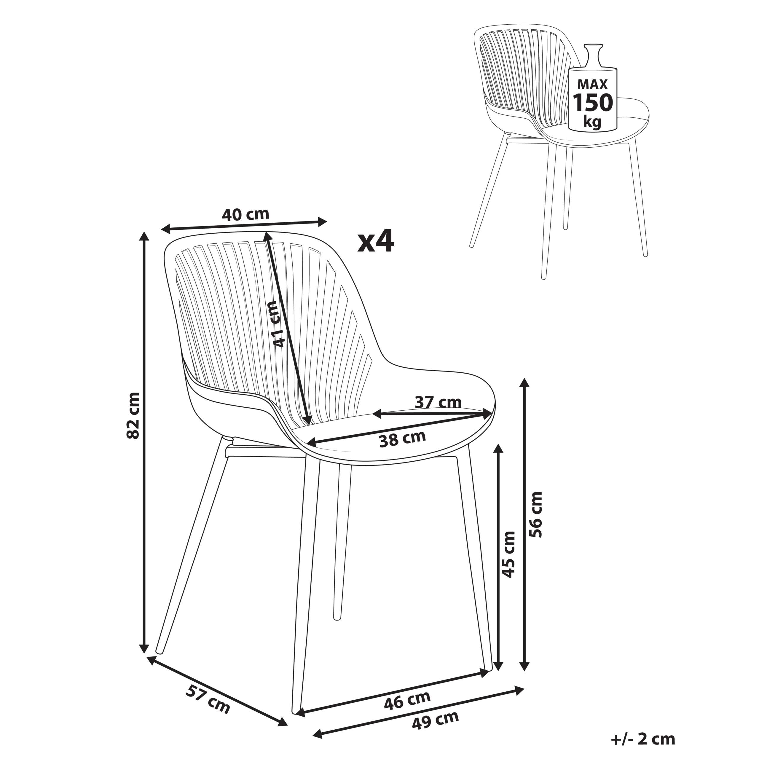 Tyylikäs tuolisetti puukuvioiduilla jaloilla. Tämä moderni neljän tuolin setti on kevyt mutta kestävä lisä jokaiseen ruokailutilaan tai keittiöön. Istuimet on valmistettu joustavasta synteettisestä materiaalista, joka tarjoaa mukavuutta ja on helppo ylläpitää. Sirot rautajalat on viimeistelty lämpösiirtotekniikalla toteutetulla puukuvioinnilla, joka antaa niille luonnollisen ilmeen. Neutraalin värimaailman ansiosta tuolit sopivat monenlaisiin sisustuksiin.