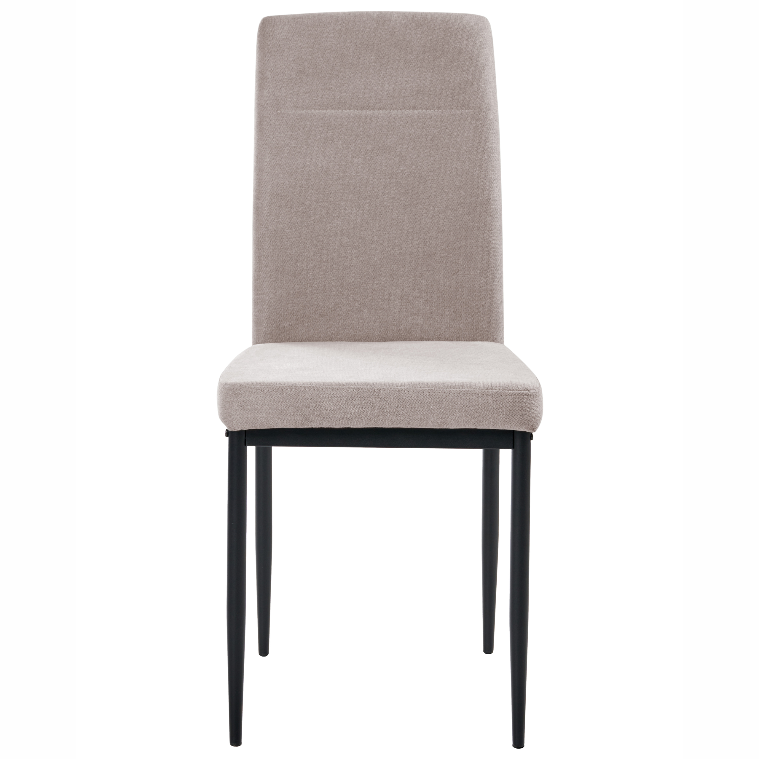 Elegantit käsinojattomat keittiön tuolit. Yksinkertaisella mutta elegantilla muotoilullaan nämä neljä ruokatuolia sopivat täydellisesti mihin tahansa moderniin ruokailutilaan. Niiden pehmeä, neutraalin sävyinen kangasverhoilu täydentää mustia rautajalkoja ja luo tyylikkään kontrastin. Mukavat ja käytännölliset tuolit ovat ihanteellinen valinta perheen ruokailuihin tai ystävien kanssa vietettäviin hetkiin.