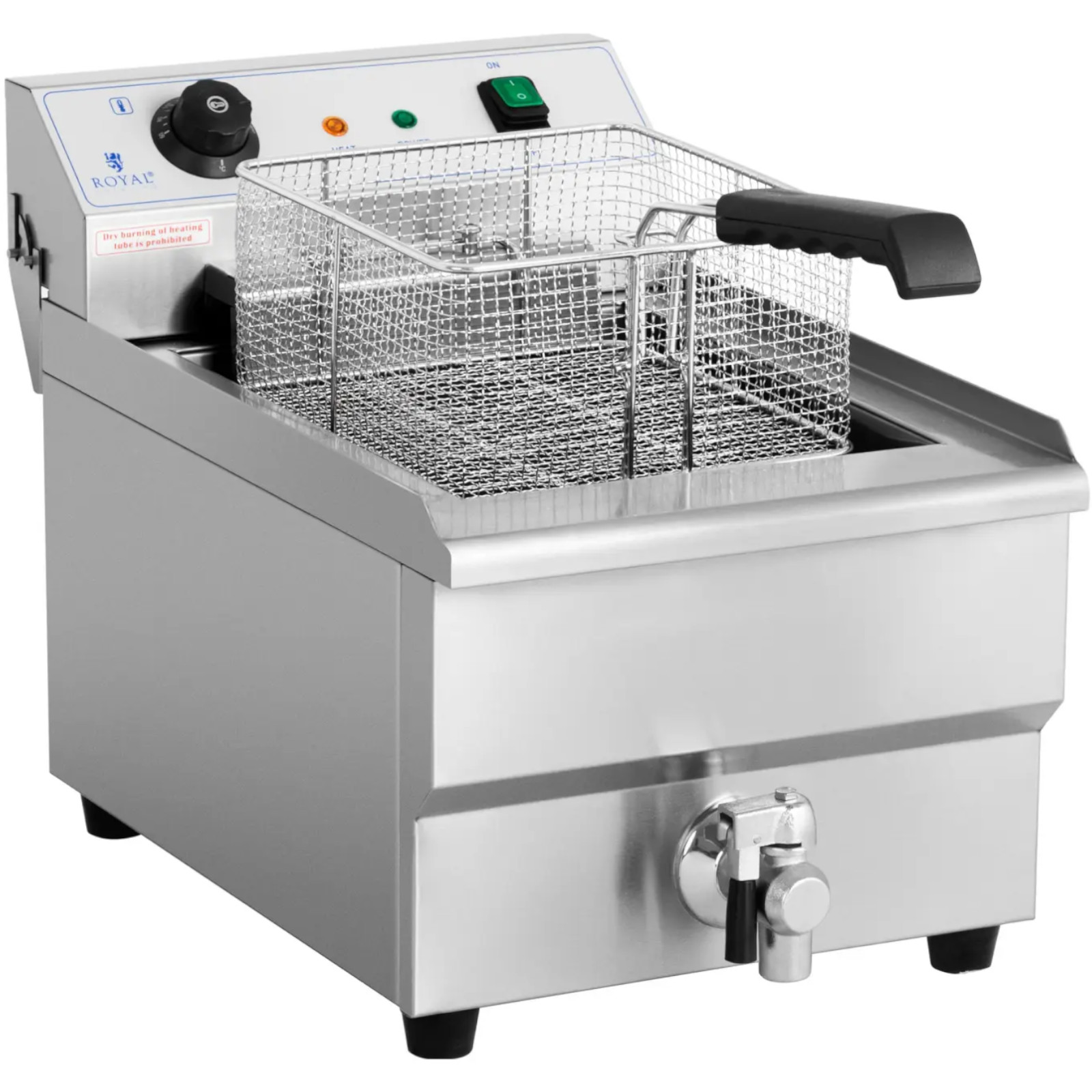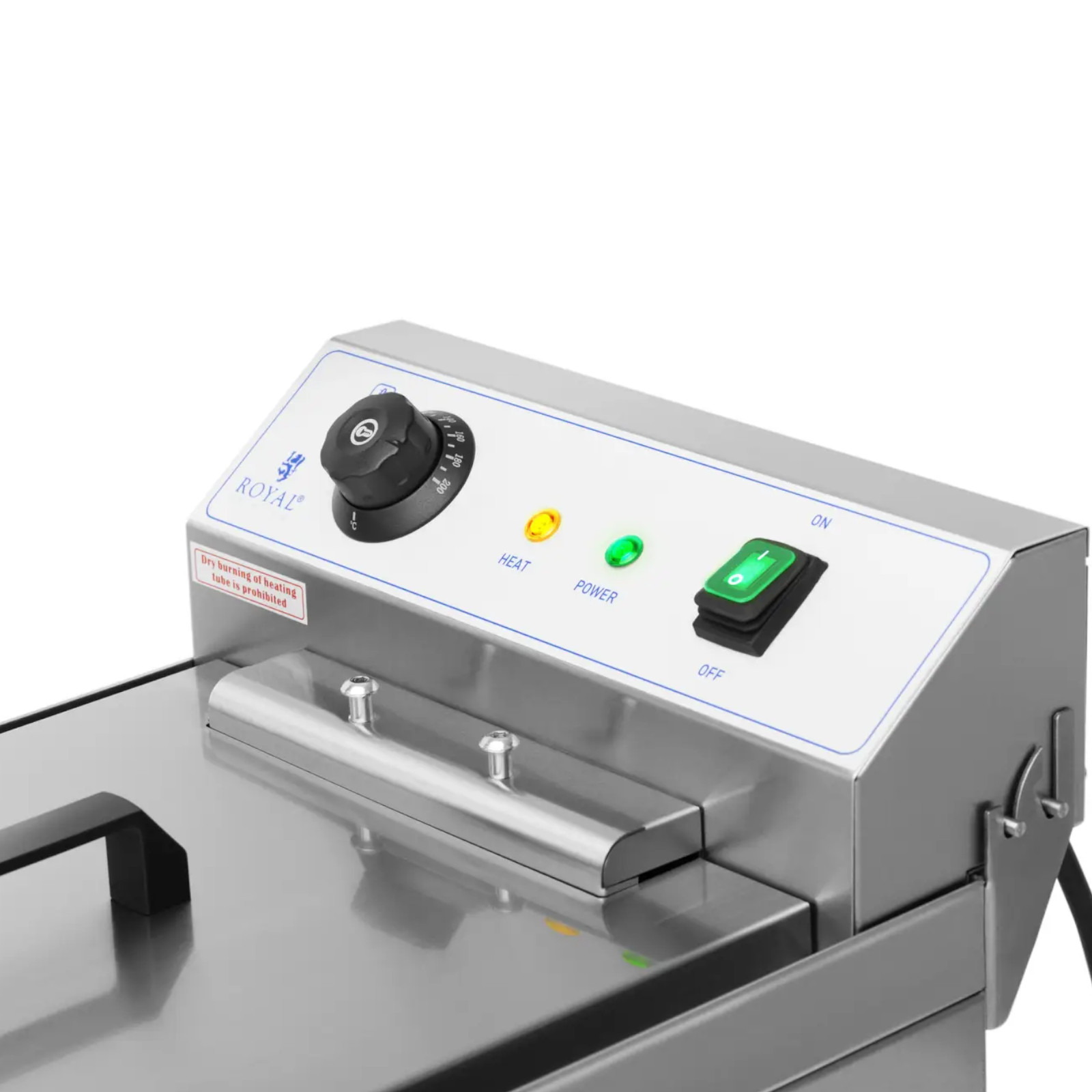 Royal Cateringin rasvakeitin on pitopalvelulaite nopeaan ja helppoon uppopaistamiseen. Se sopii erinomaisesti ravintoloihin, pikaruokapaikkoihin, välipalabaareihin, ruokarekkoihin, kauppoihin ja supermarketteihin. Sen avulla voit valmistaa esimerkiksi kanansiipiä tai rapeita ranskalaisia perunoita. Se sopii säännölliseen käyttöön pitopalvelussa. Lämpötilaa säädetään nupilla alueella 60-200 °C. Automaattinen termostaatti ylläpitää tätä lämpötilaa ja säästää energiaa. Ohjauspaneelin merkkivalot osoittavat, milloin uuni lämpenee ja milloin valittu lämpötila on saavutettu. 6000 W:n teho mahdollistaa korkean paistotehon erittäin lyhyessä ajassa (annoksen koosta riippumatta).