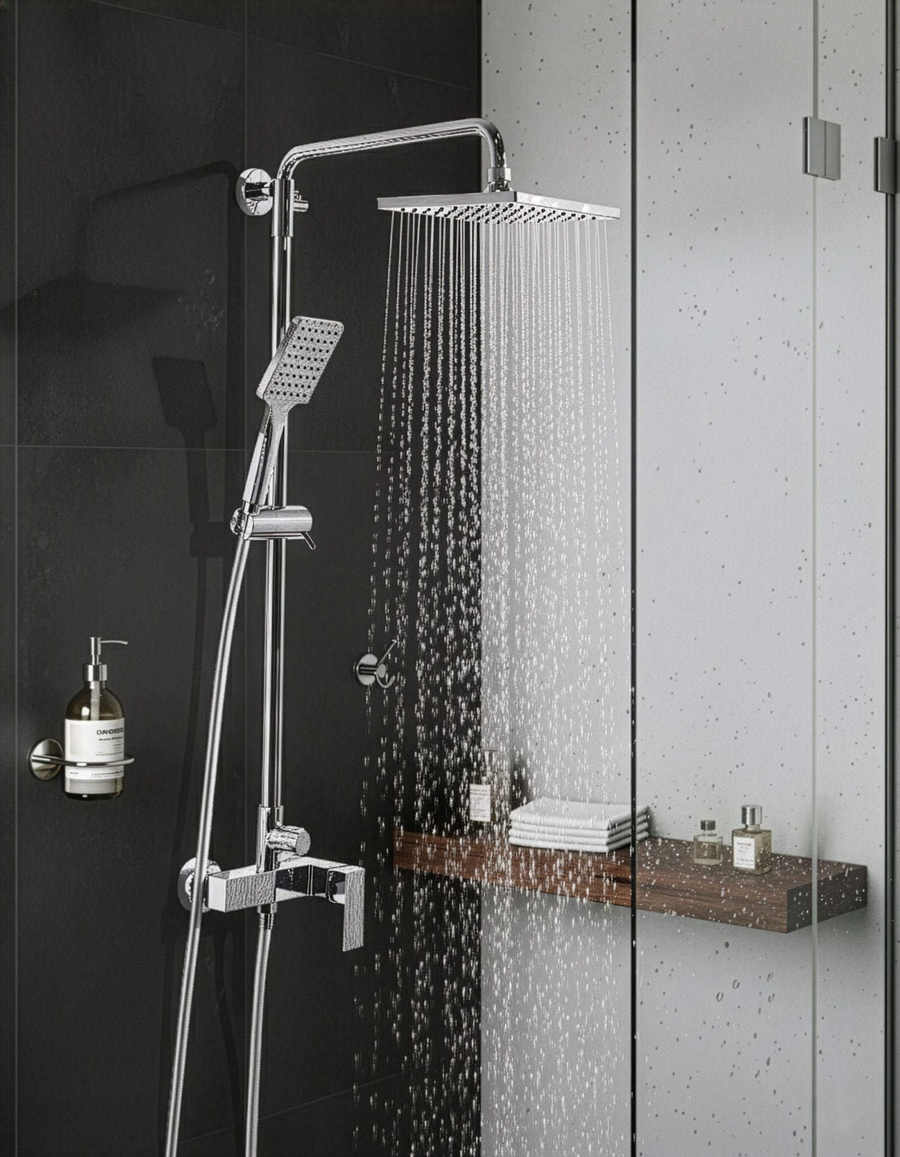 Korkeussäädettävä sadesuihku käsisuihkulla. Päivitä kylpyhuone tällä sadesuihkusetillä, jonka puhdas muotoilu täydentää vaivattomasti monenlaisia sisustuksia. Korkeussäädettävä suihkukisko mahdollistaa räätälöinnin tilan ja tarpeen mukaan optimaalisen mukavuuden ja saumattoman ulkonäön saavuttamiseksi. Kestävä messinkirunko takaa pitkäikäisen laadun. Virtauksen voimakkuuden ja lämpötilan säätely sekä sadesuihkun ja käsisuihkun välinen vaihto on nopeaa ja helppoa, jolloin suihkusta voi nauttia huoletta.