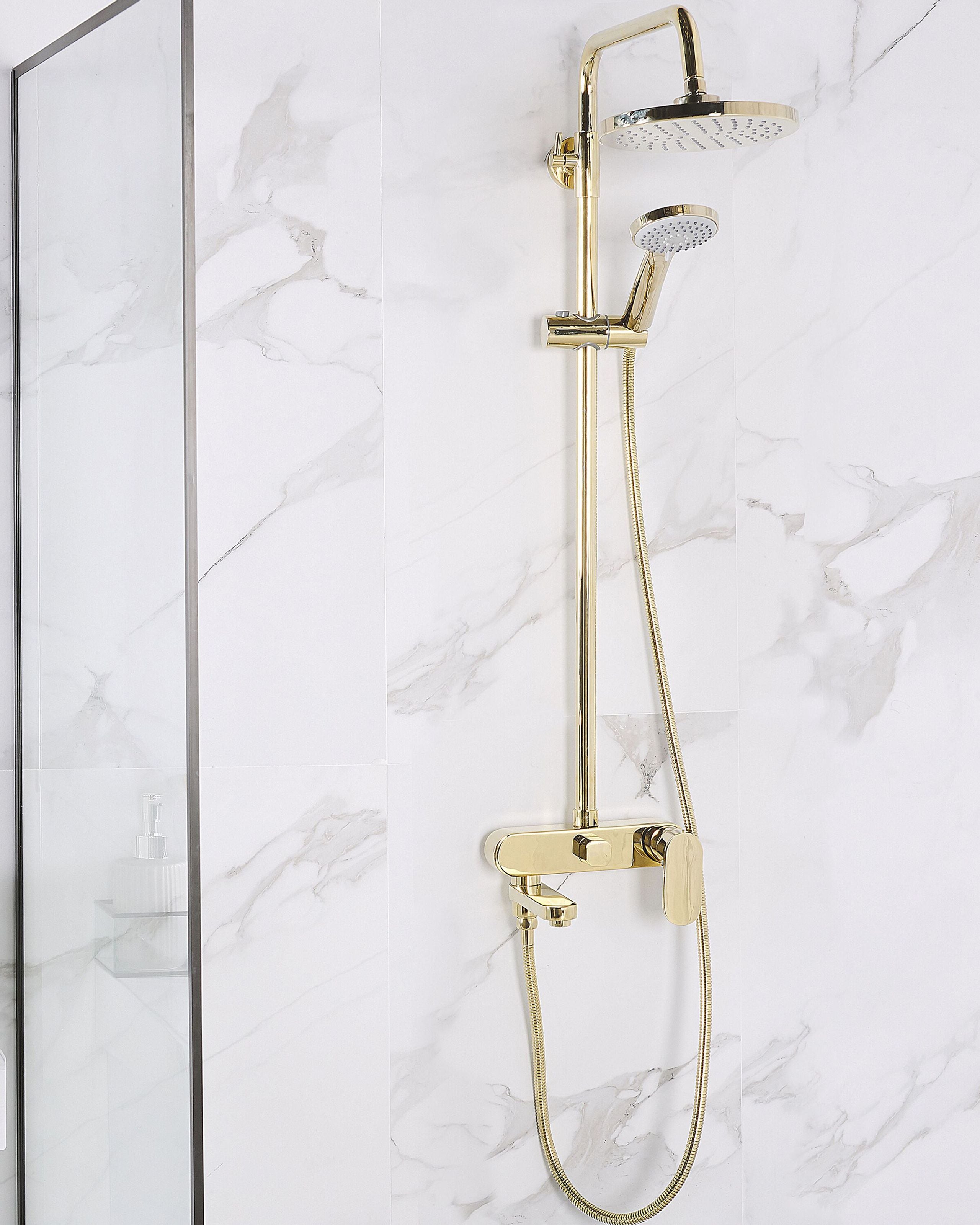 Sadesuihkusetti kiiltävällä viimeistelyllä. Tämä suihku on ehdoton valinta mukavuutta arvostavalle. Messingistä valmistettu suihku on kestävä ja kaunis ja sopii kaiken tyylisiin kylpyhuoneisiin. Suihkupää ja sadesuihku on valmistettu synteettisistä materiaaleista, joten ne ovat sekä kevyitä että kestäviä. Veden lämpötilaa ja painetta on helppo säätä yksivipuisella mekanismilla.
