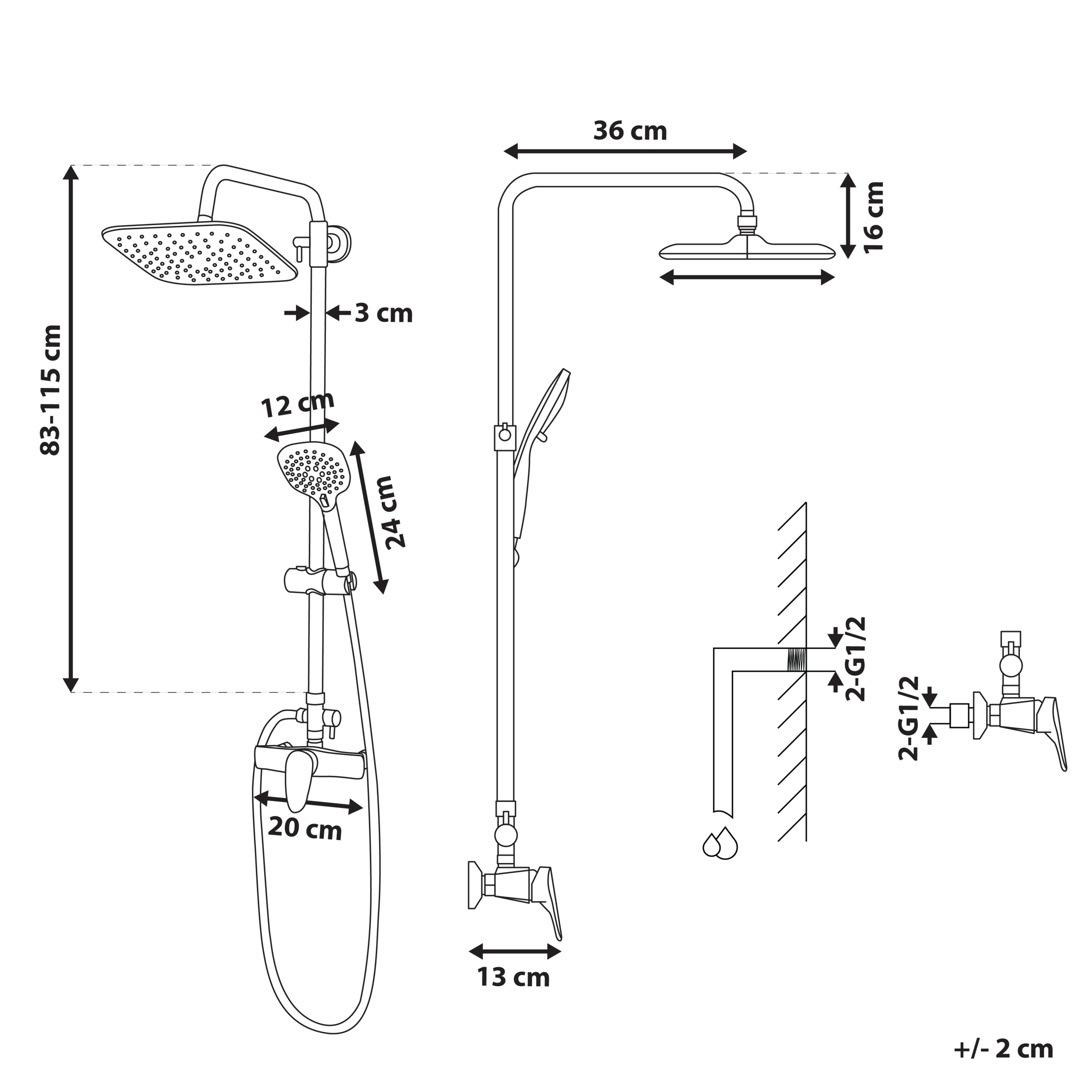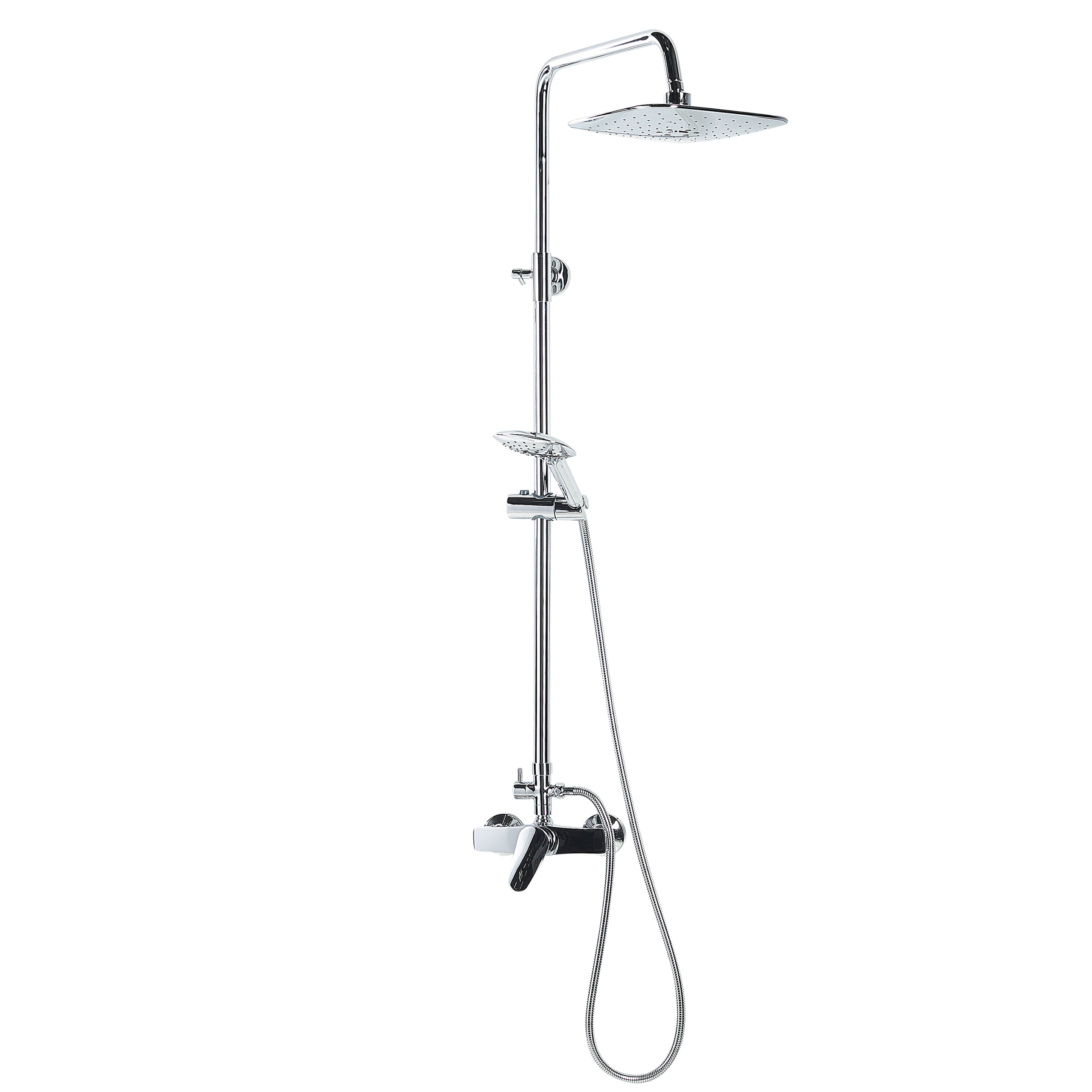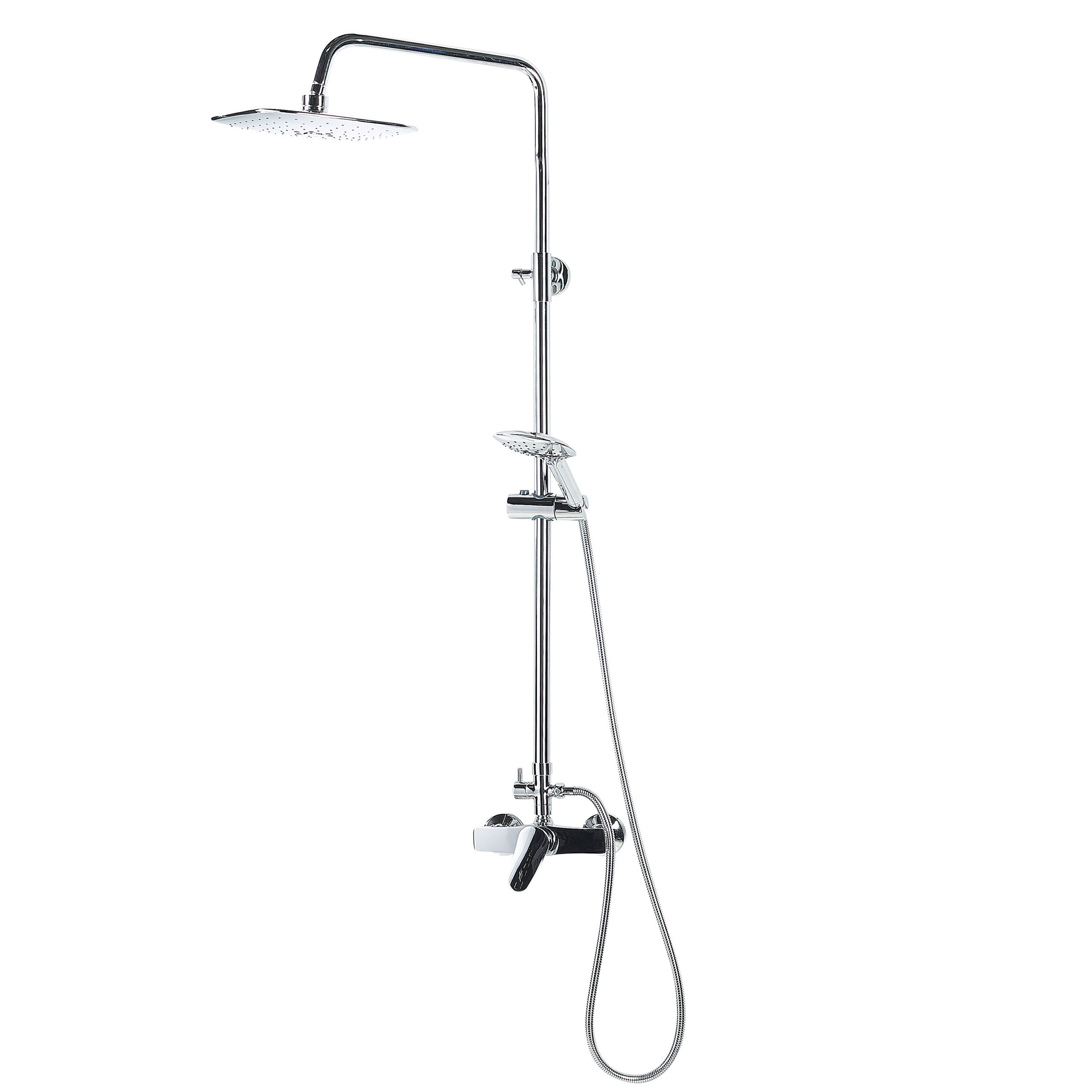 Käytännöllinen suihkupää. Tämä suihkusetti on monikäyttöinen ja tyylikäs varuste, joka kohottaa minkä tahansa kylpyhuoneen ilmettä modernilla muotoilullaan ja kiiltävällä viimeistelyllään. Leveät suihkupäät tarjoavat hyvän peittävyyden sekä auttavat rentoutumaan ja rauhoittumaan pitkän päivän jälkeen. Yläosaan sijoittuvaa sadesuihkua voidaan käännellä tarpeen mukaan, kun taas keskellä olevan suihkun korkeutta voidaan nostaa tai laskea, ja sitä voidaan käyttää kätevänä käsisuihkuna.