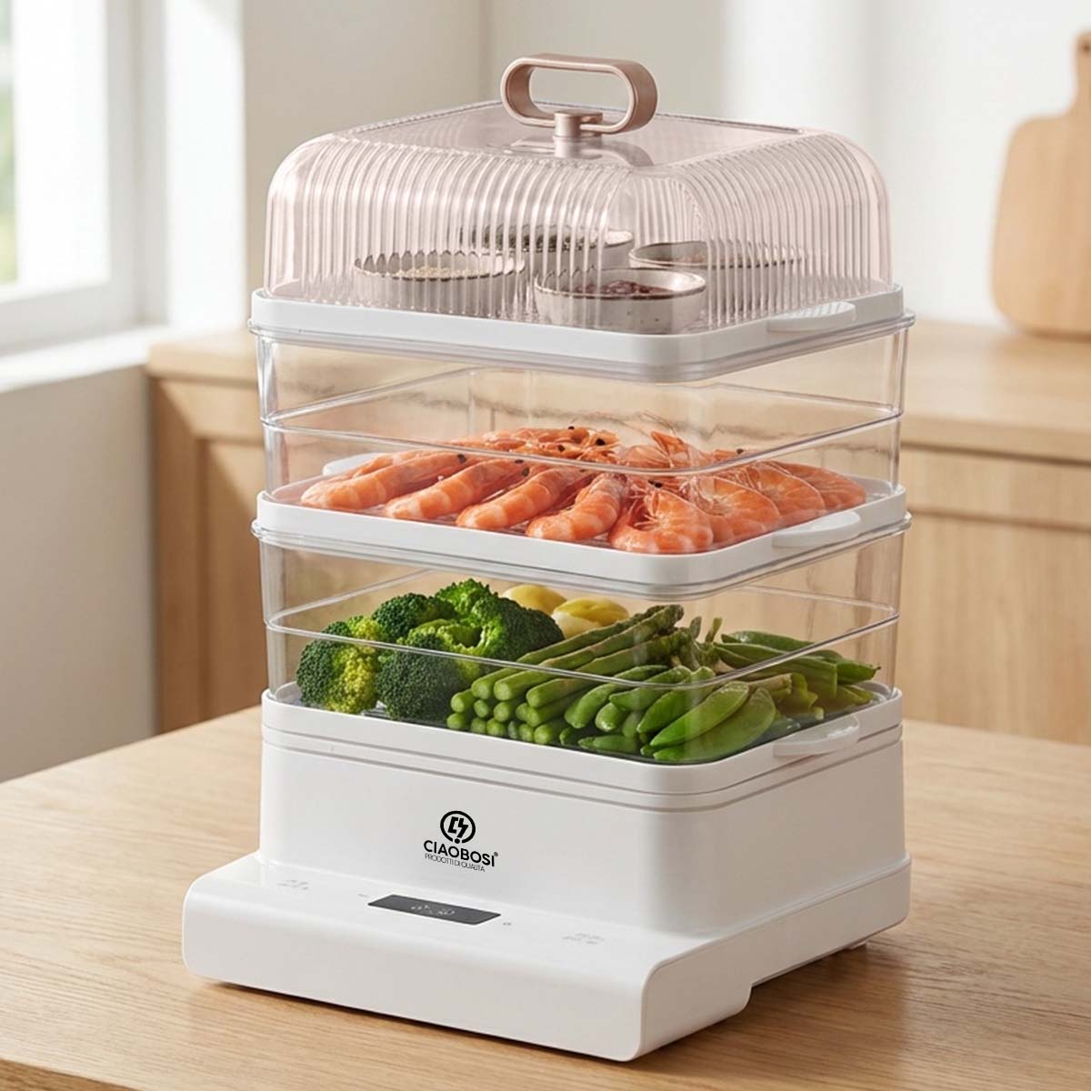 Monitoiminen sähköinen höyrykeitin nopeaan ja terveelliseen ruoanlaittoon. 800 W teho ja mikrohöyrytekniikka tasaiseen jakautumiseen makujen ja ravintoaineiden säilyttämiseksi. 3 pinottavaa tasoa, 1,0 L:n säiliö ja yli 10 L:n kokonaiskapasiteetti suurten annosten kypsennykseen. Ajastin ja 24 tunnin esiasetus, läpinäkyvä kansi kypsennyksen seurantaan, ihanteellinen vihanneksille, kalalle, riisille ja lihalle.
