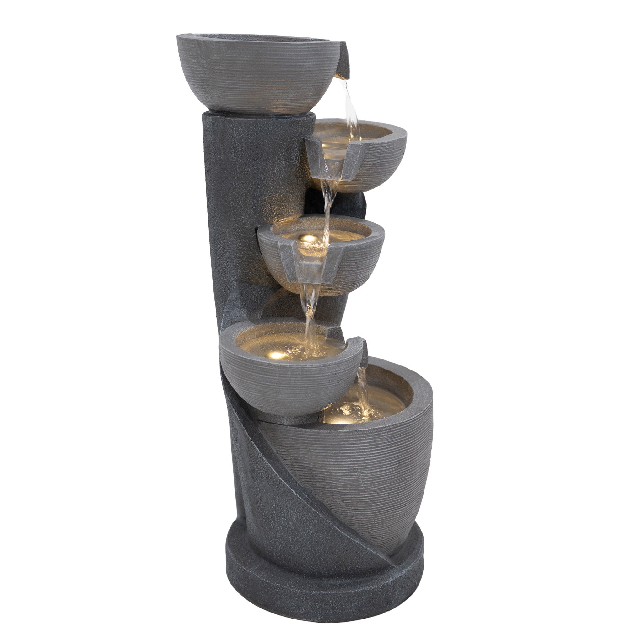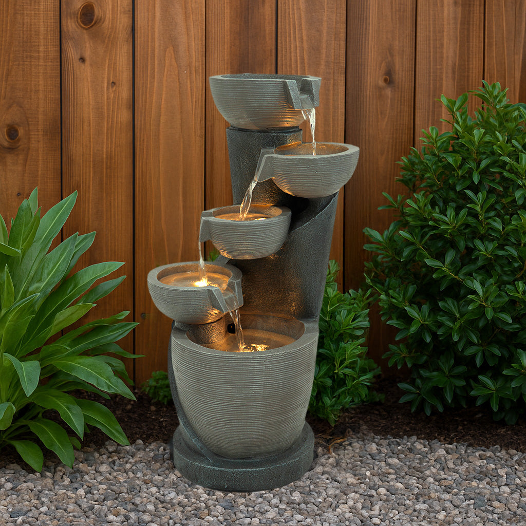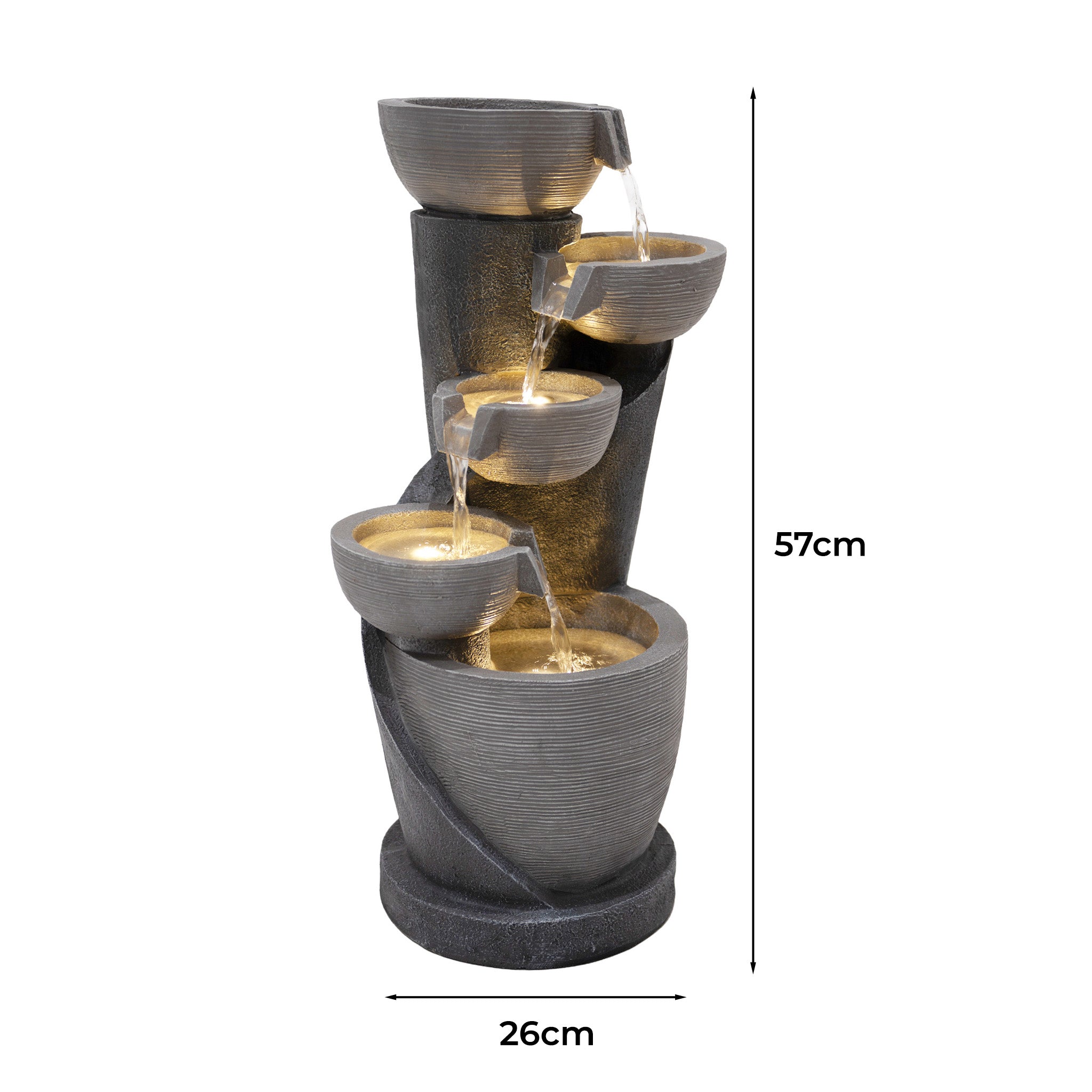 Yhdistämällä modernin tyylin virtaavan veden ajattomaan kauneuteen, tämä upea muotoilu sisältää siroa sarjaa kulhoja, jotka antavat veden virrata luonnollisesti ylhäältä alas, tarjoten sekä liikettä että rauhallisen äänimaailman ulkotilaasi.