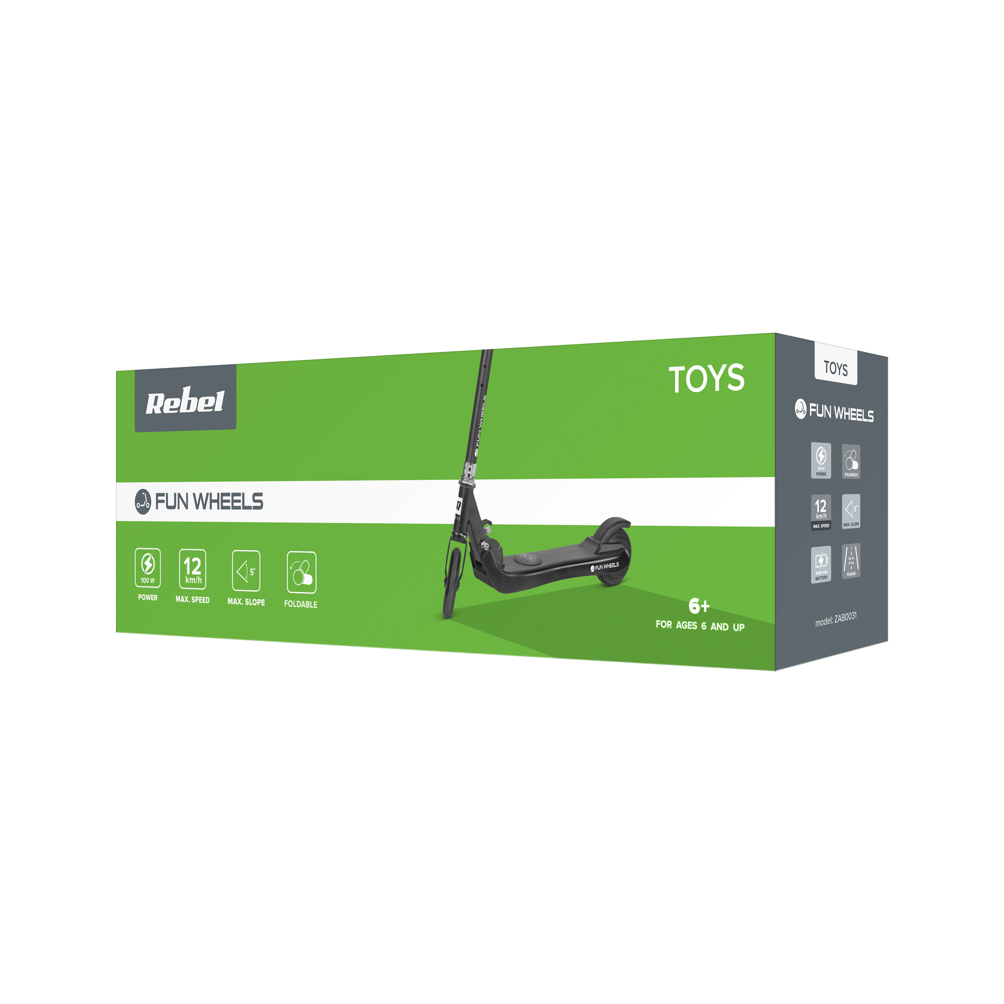Haaveileeko lapsesi sähköpotkulaudasta, mutta et ole vakuuttunut? Rebel Fun Wheels on täydellinen aloittelijan malli, joka sopii 6-vuotiaille ja sitä vanhemmille lapsille. Ajoneuvon enimmäisnopeus on 12 km/h. Tämä riittää tarjoamaan runsaasti ajohauskuutta ja turvallisuutta. On syytä huomata, että Fun Wheelsin enimmäiskuormituskapasiteetti on 50 kg, joten tämä potkulauta kestää pitkään – myös vanhemmille lapsille.