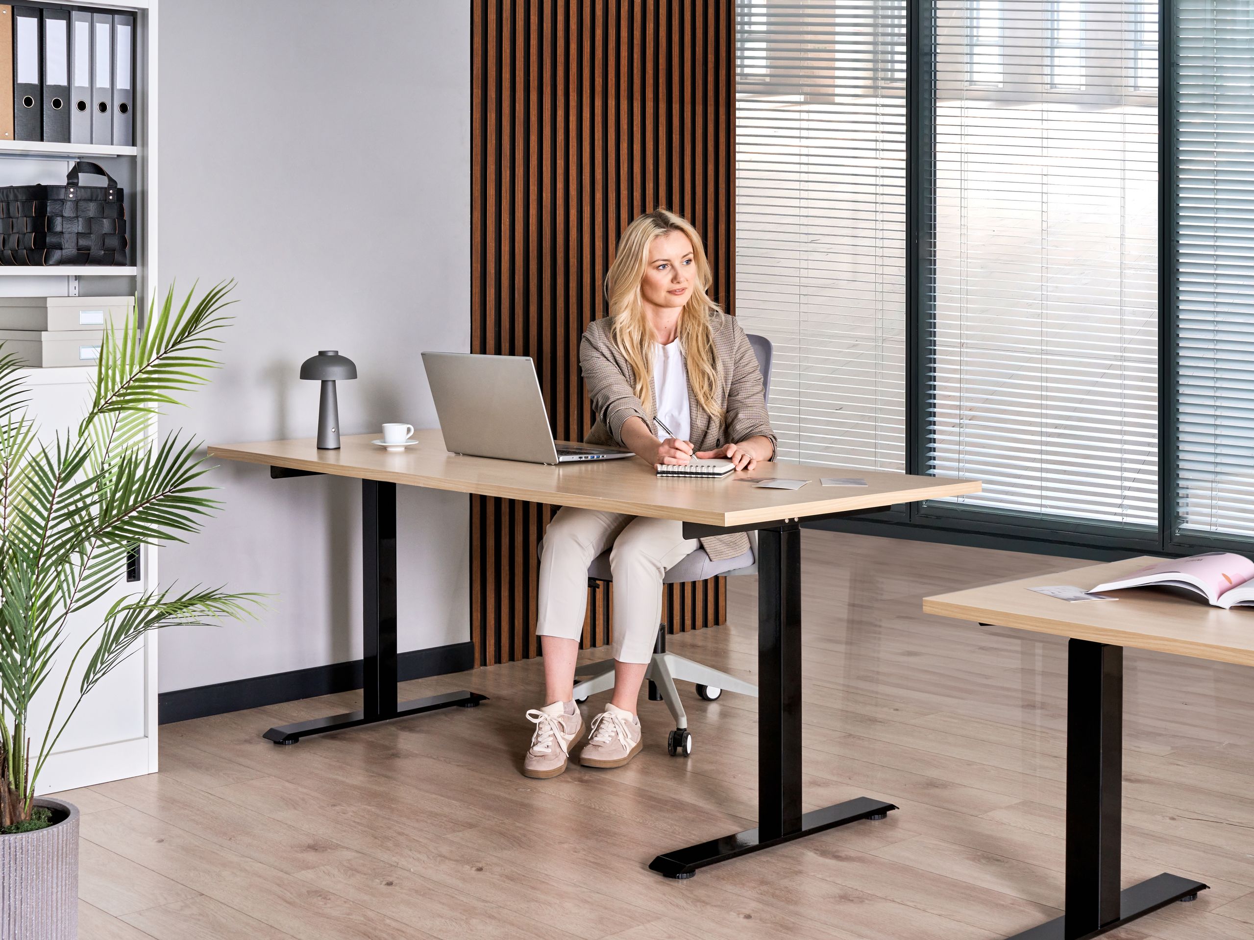 Ominaisuudet: Sähköinen korkeudensäätö, 3 henkilökohtaista korkeusasentoa voidaan tallentaa muistiin, Kaksoismoottori tarjoaa tasaisen korkeuden säädön ja alhaisen melun käytön aikana, Paksu pöytälevy laadukkaalla melamiinipinnoitteella, Korkea kantavuus, Tukevat jalat ihanteellisen vakauden takaamiseksi, USB-latauspistoke, Törmäyksenestotunnistin estää törmäämisen havaittuihin kohteisiin