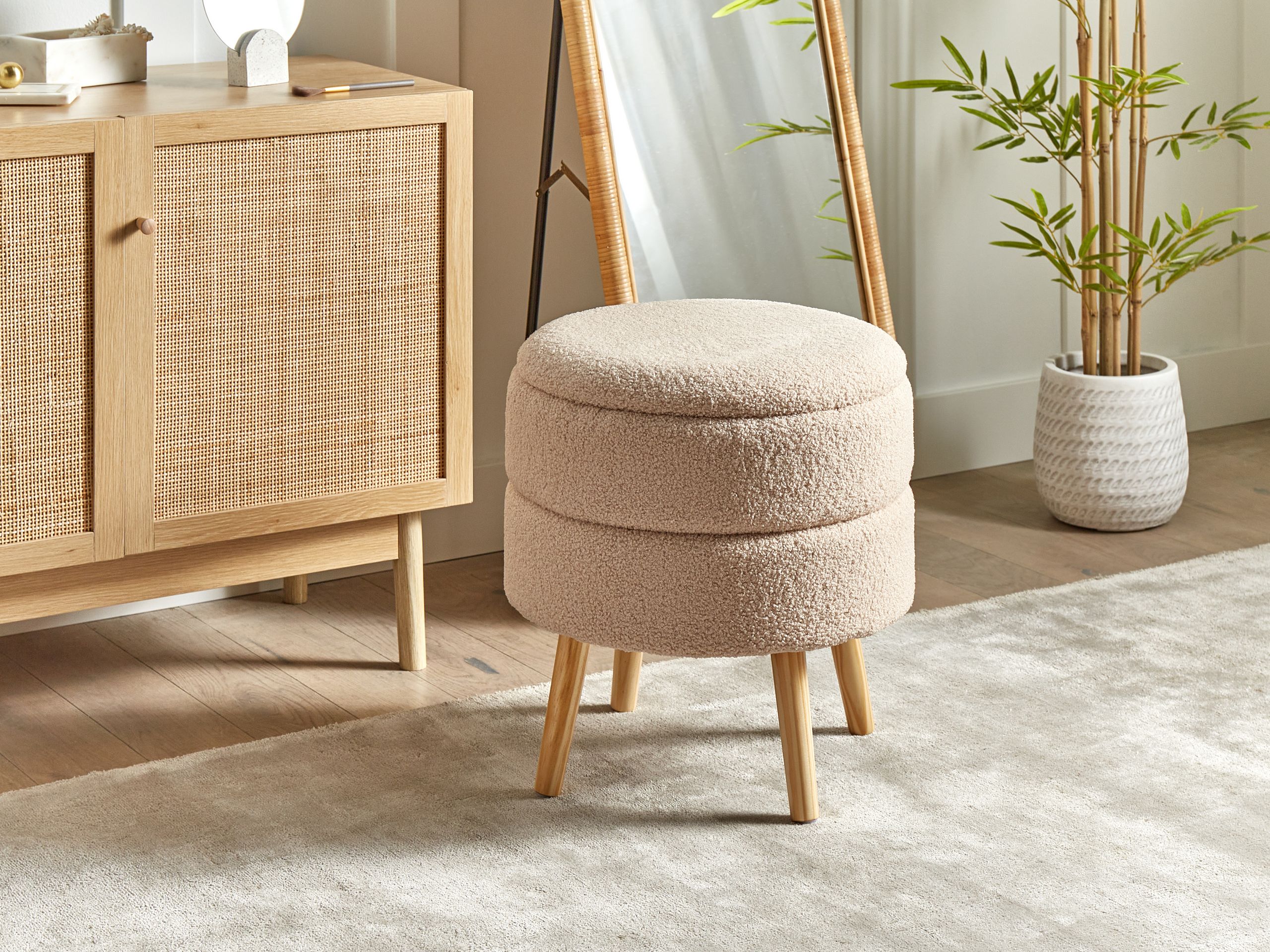 Moderni pyöreä jakkara puujaloilla. Tuo ripaus skandinaavista viehätystä sisustukseesi tällä modernilla jakkaralla. Pehmeän tuntuisella bukleekankaalla verhoiltu ja vankoilla mäntyjaloilla tuettu jakkara on täydellinen lisä olohuoneeseen tai makuuhuoneeseen. Istuimen alle kätkeytyvän säilytystilan ansiosta se on käytännöllinen lisä, jota voidaan käyttää niin ylimääräisenä istumapaikkana kuin mukavana jalkatukena.