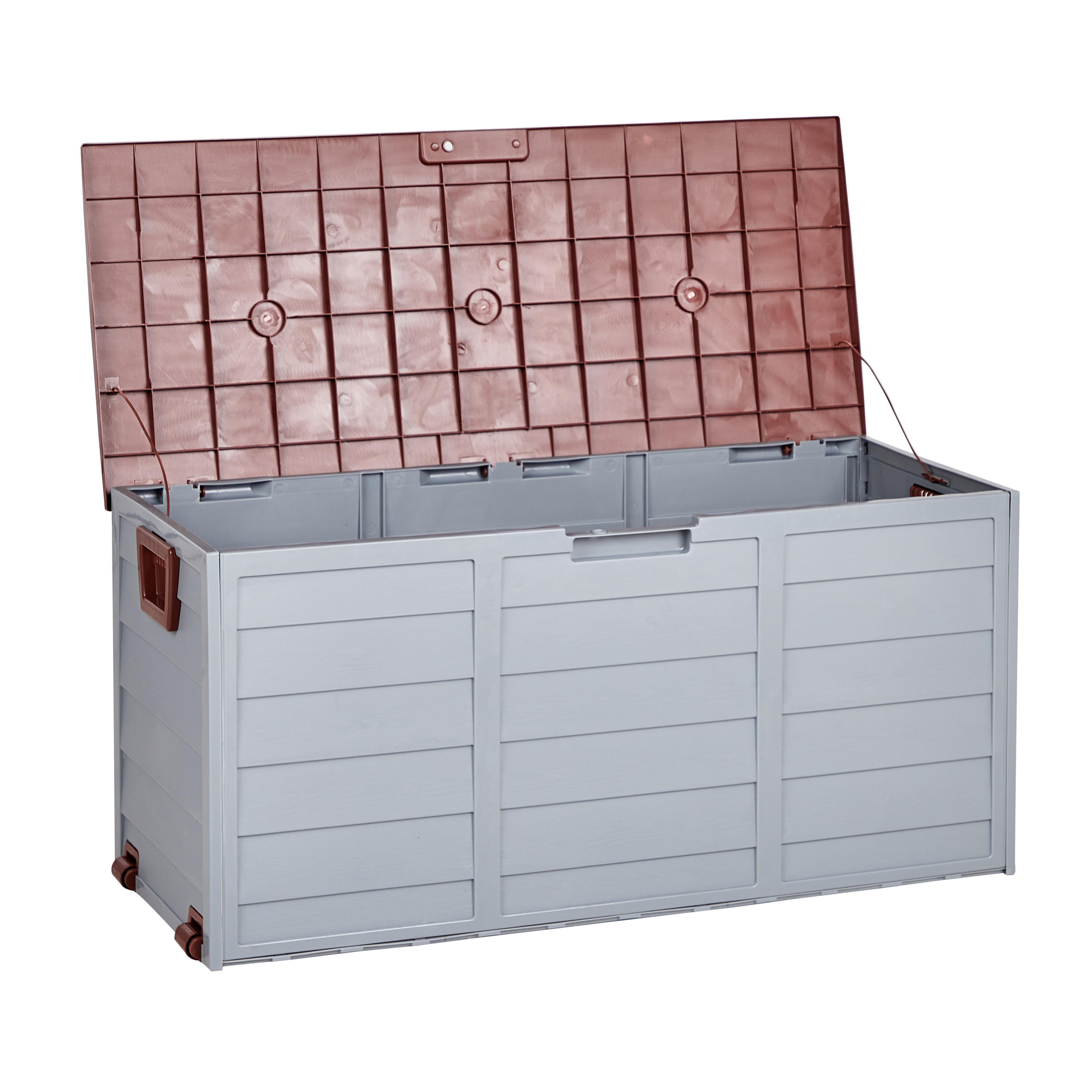 Tilava säilytyslaatikko. Tähän tilavaan, kannella varustettuun ulkosäilytyslaatikkoon mahtuvat niin puutarhan hoitotarvikkeet, työkalut, pehmusteet kuin lelutkin. Se on valmistettu kestävästä synteettisestä materiaalista, jonka ansiosta laatikko ei vaadi päivittäistä ylläpitoa kestääkseen useita vuosia. Lisäksi laatikossa on kahvat sekä sulavasti rullaavat pyörät, joten sitä on helppo siirtää paikasta toiseen. Säilytyslaatikko sopii moneen ulkotilaan tyylikkään mutta neutraalin ilmeensä ansiosta.