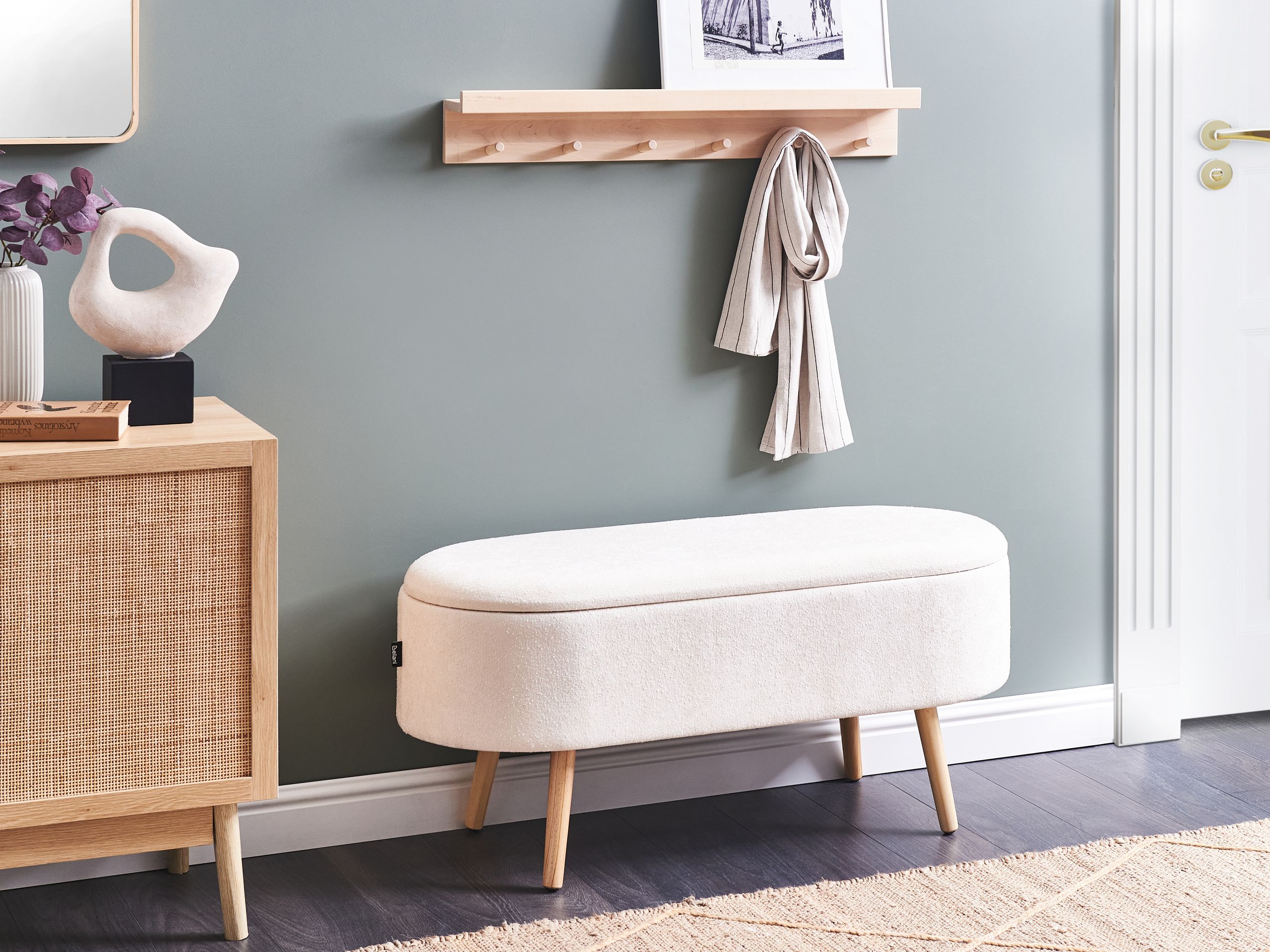 Skandinaavinen istuin säilytystilalla. Täydennä olohuonetta tällä modernilla ja monipuolisella penkillä. Se on verhoiltu pehmeällä luonnonvalkoisella chenillekankaalla, joka on sekä kestävää että helppohoitoista. Vaaleasta massiivimännystä valmistettujen jalkojen tukema penkki takaa vakauden ja tarjoaa samalla ylimääräistä säilytystilaa pienille tavaroille. Monikäyttöisen muotoilunsa ansiosta penkkiä voidaan käyttää myös lisäistuimena, mikä tekee siitä käytännöllisen lisän mihin tahansa huoneeseen.