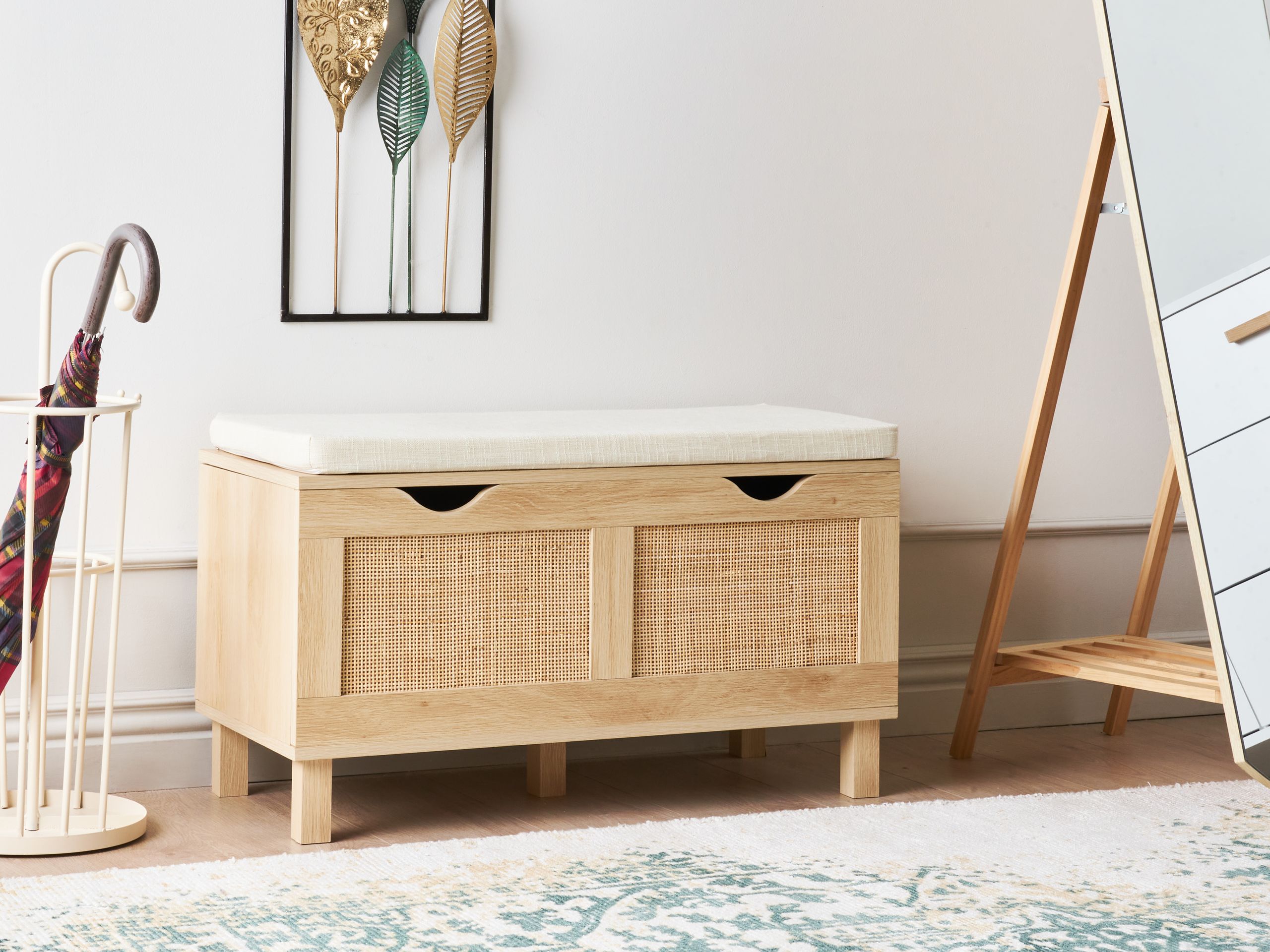 Boheemi penkki säilytystilalla. Tämä vaalean puun sävyinen säilytyspenkki yhdistää toiminnallisuuden ja luonnollisen viehätyksen, minkä ansiosta se on täydellinen eteiseen, makuuhuoneeseen tai olohuoneeseen. Penkissä on irrotettavalla ja konepestävällä päällisellä varustettu beige istuintyyny, joka takaa mukavan istumakokemuksen. Etuosassa on kaunis rottinkiverkko, joka lisää ripauksen boho-estetiikkaa ja lämpöä. Penkki tarjoaa huomaamatonta säilytystilaa torkkupeitoille, kengille tai muille välttämättömille tavaroille. Minimalistinen muotoilu tekee siitä tyylikkään lisän jokaiseen moderniin tai perinteiseen kotiin.