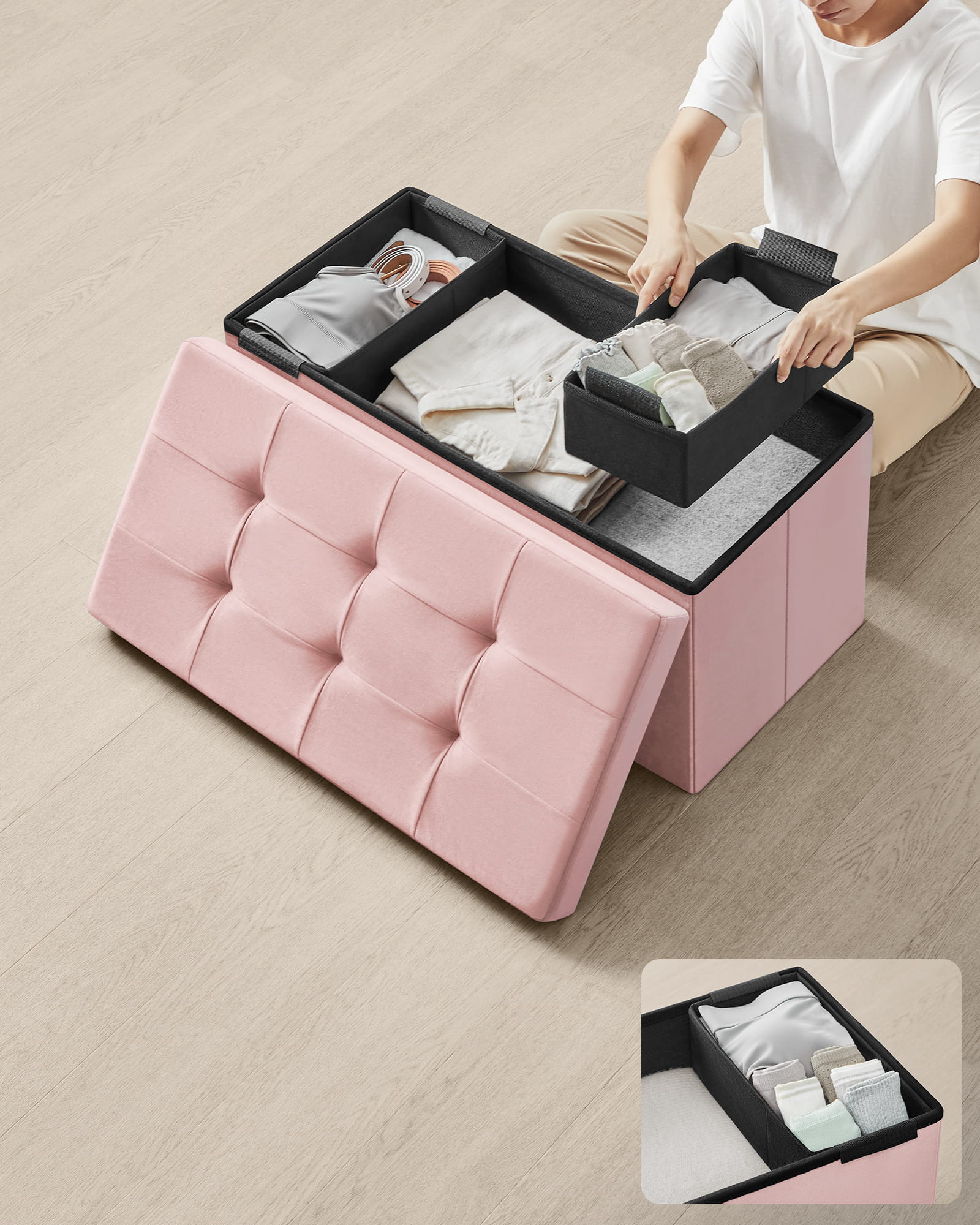 - Monikäyttöinen: istuin, säilytyslaatikko, jalkarahi, pöytä