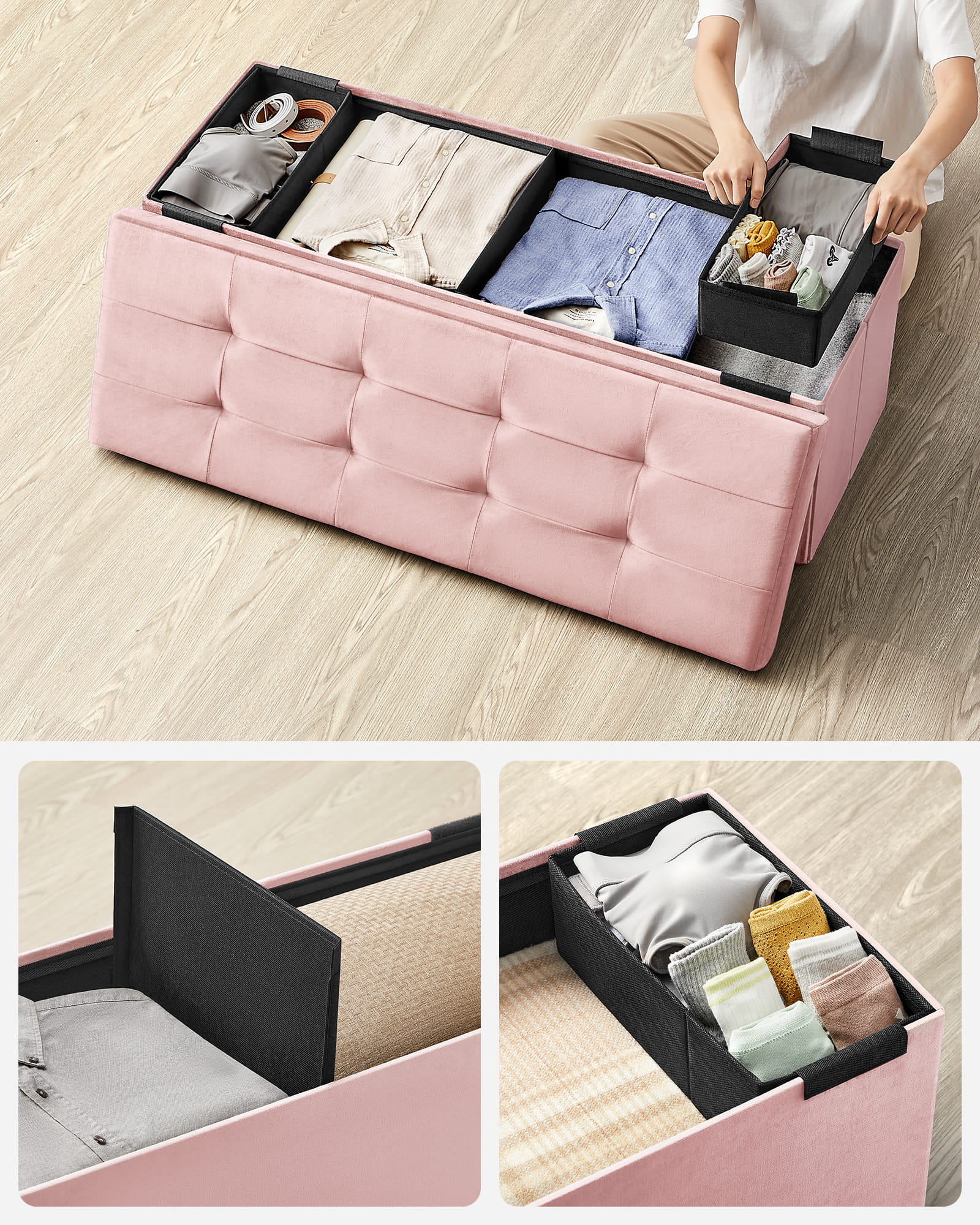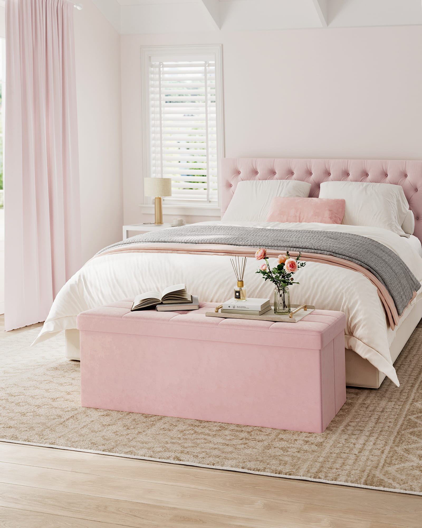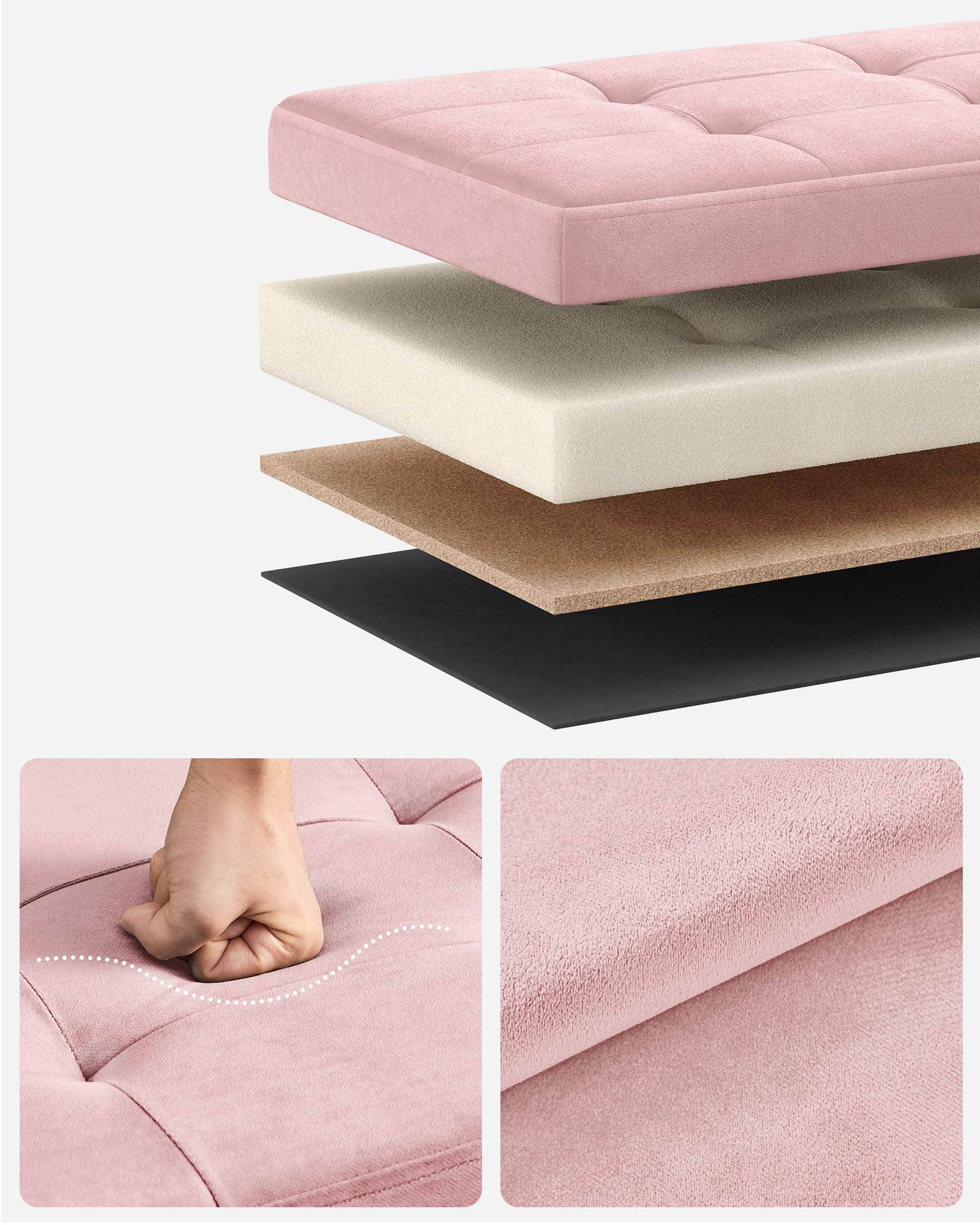 OSKARin pastellinpunainen säilytysrahi tuo modernia ilmettä ja käytännöllisyyttä eteiseen, käytävään, makuuhuoneeseen tai lastenhuoneeseen. Sen suorakaiteen muotoinen rakenne ja pehmeä samettiverhoilu tekevät siitä esteettisen ja monikäyttöisen lisän moneen sisustukseen. Rahi toimii istuimena, jalkarahina, säilytyspaikkana tai pöytänä.