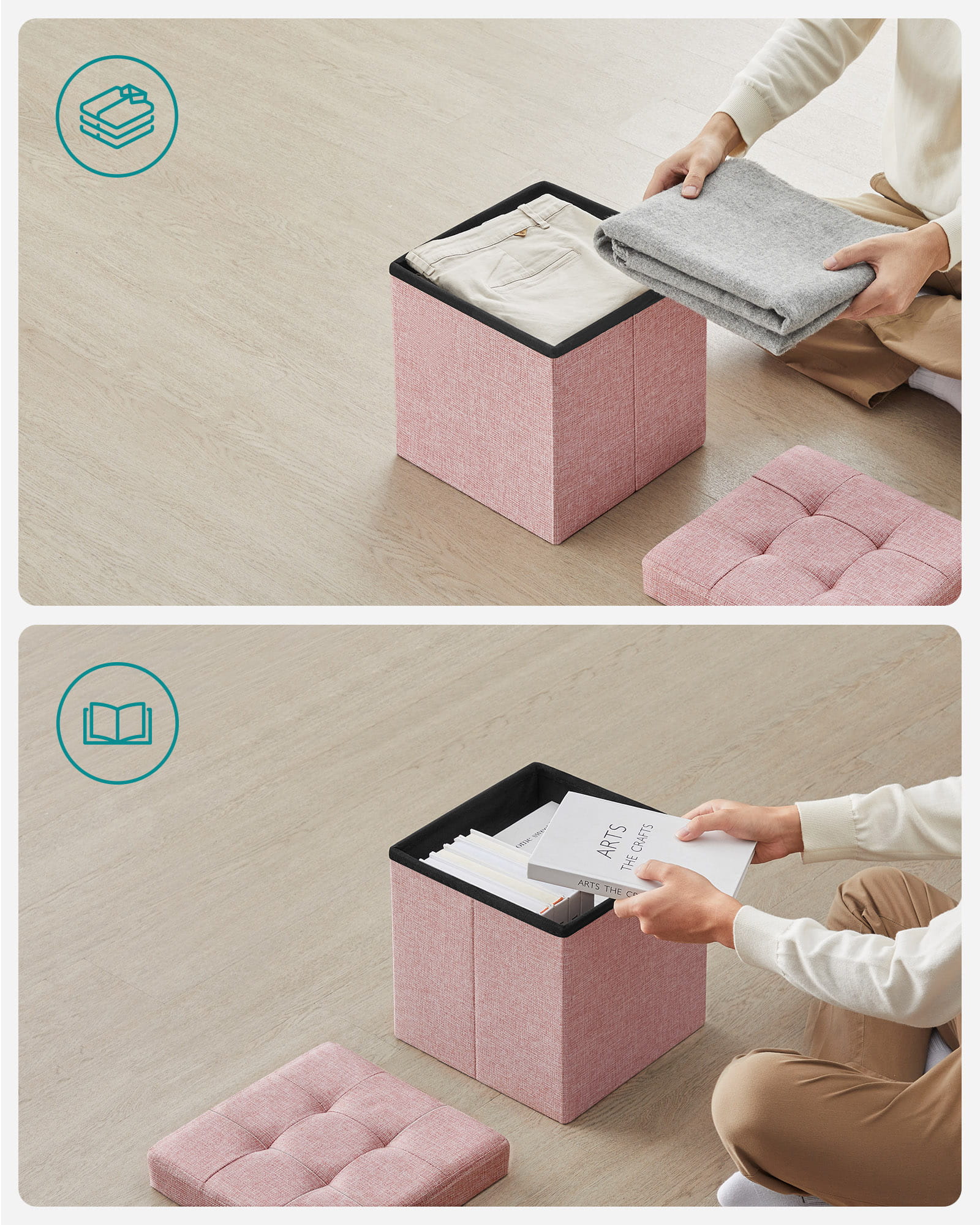 - Monikäyttöinen: istuin, säilytyslaatikko, jalkarahi, pöytä