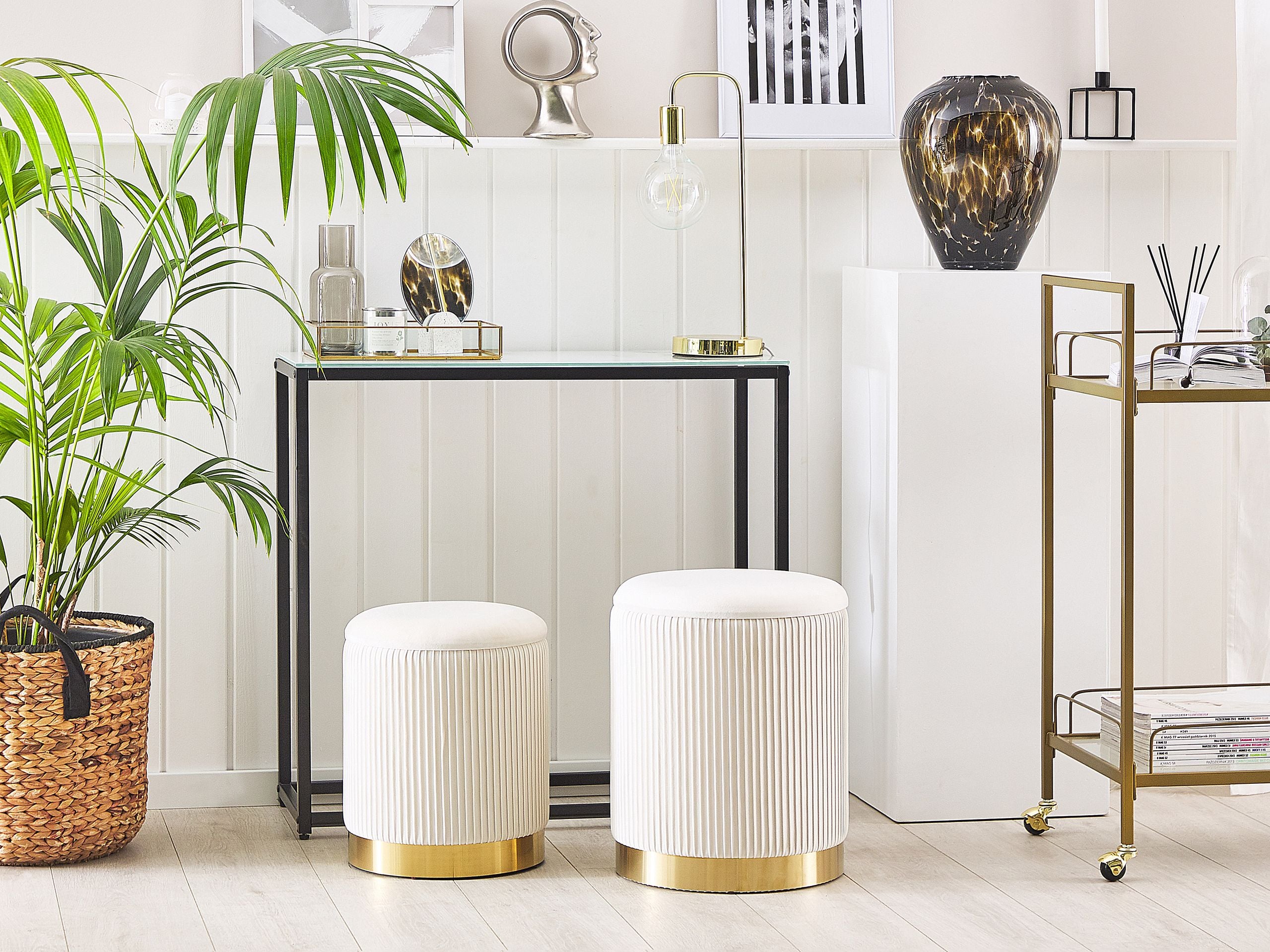 Glamour-tyylinen säilytystilallinen rahisetti. Tuo ripaus glamouria olohuoneeseesi tällä kahden pehmustetun rahin setillä. Molemmissa raheissa on tilava säilytystila, joka kätkeytyy istuimen kannen alle. Helppohoitoisen ja kestävän samettiverhoilun ansiosta ne kestävät useita vuosia. Pystysuuntaisen tikkauksen ja trendikkäiden värien – valkoisen ja kultaisen – näyttävä yhdistelmä saa rahit erottumaan edukseen, täydentäen mitä tahansa tilaa modernin elegantilla tunnelmalla.