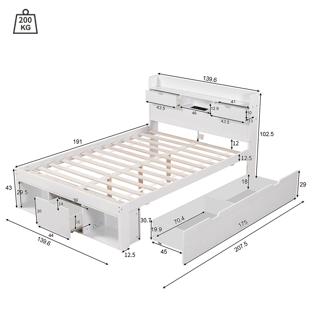 Säilytyssänky 135 x 190 cm, USB-portilla ja laatikoilla, valkoinen