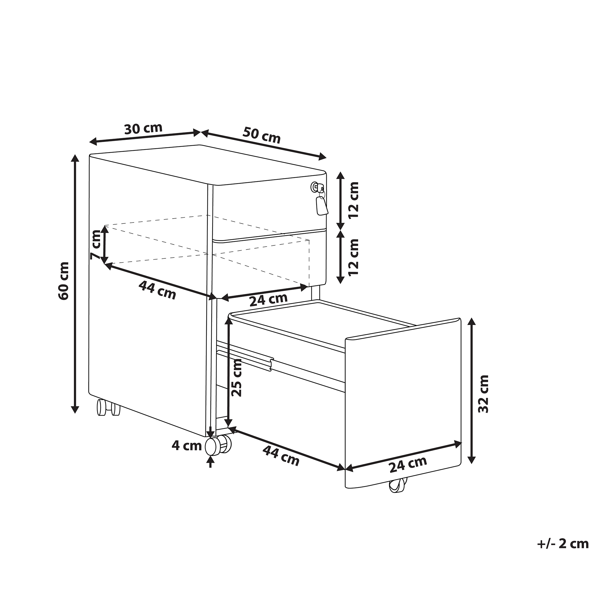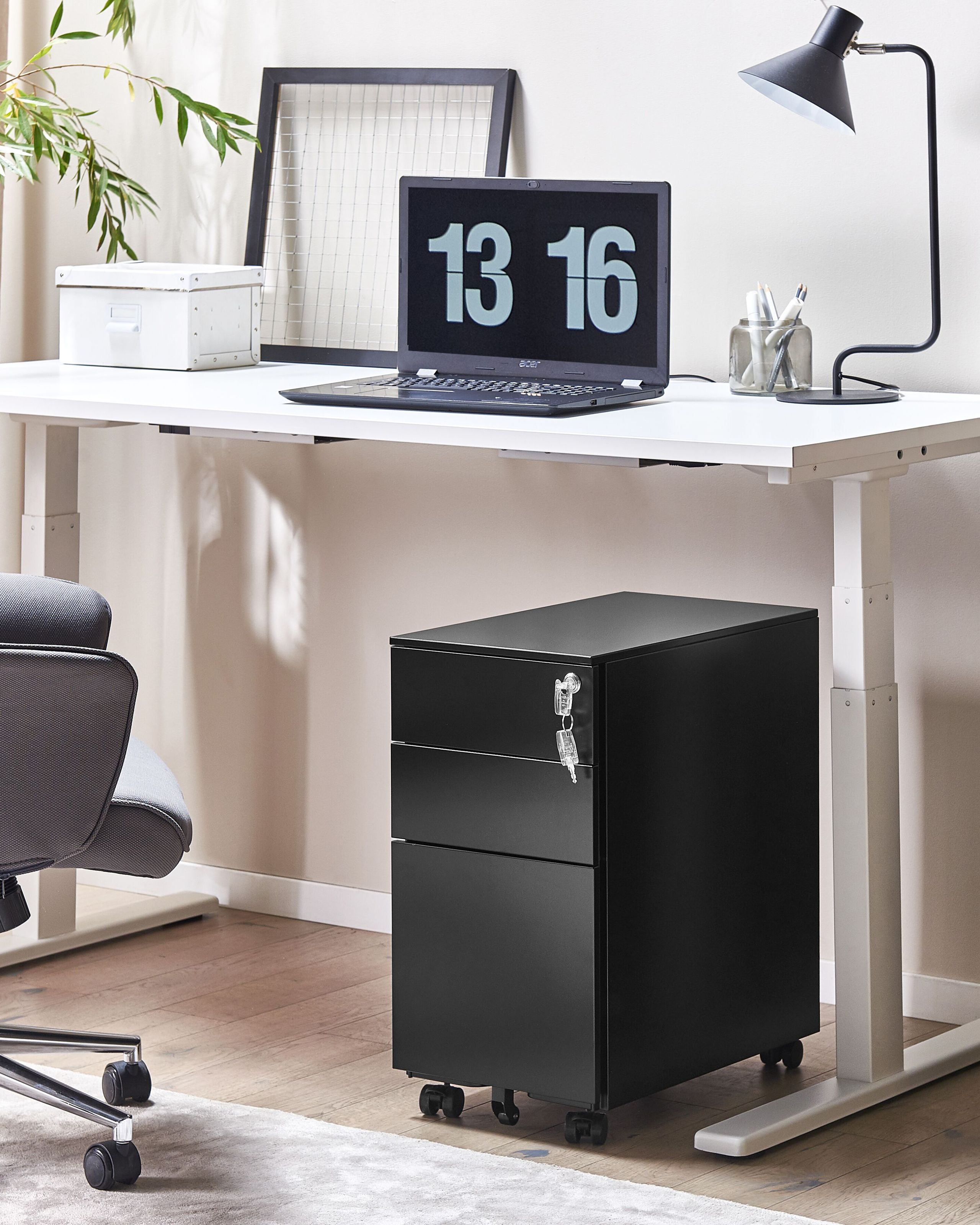 Industriaalinen toimistokaappi laatikoilla. Tämä moderni laatikosto tarjoaa täydellisen ratkaisun papereiden ja toimistotarvikkeiden säilyttämiseen. Kolme erillistä laatikkoa tarjoavat paljon säilytystilaa, ja ylin lukittava laatikko varmistaa turvallisen paikan arvotavaroiden säilömiseen. Laatikosto on valmistettu kestävästä teräksestä, minkä ansiosta se on vakaa ja vaatii vain vähän ylläpitoa. Sisäänrakennetut pyörät helpottavat liikuttamista, ja minimalistinen muotoilu sulautuu monenlaisiin sisustuksiin.