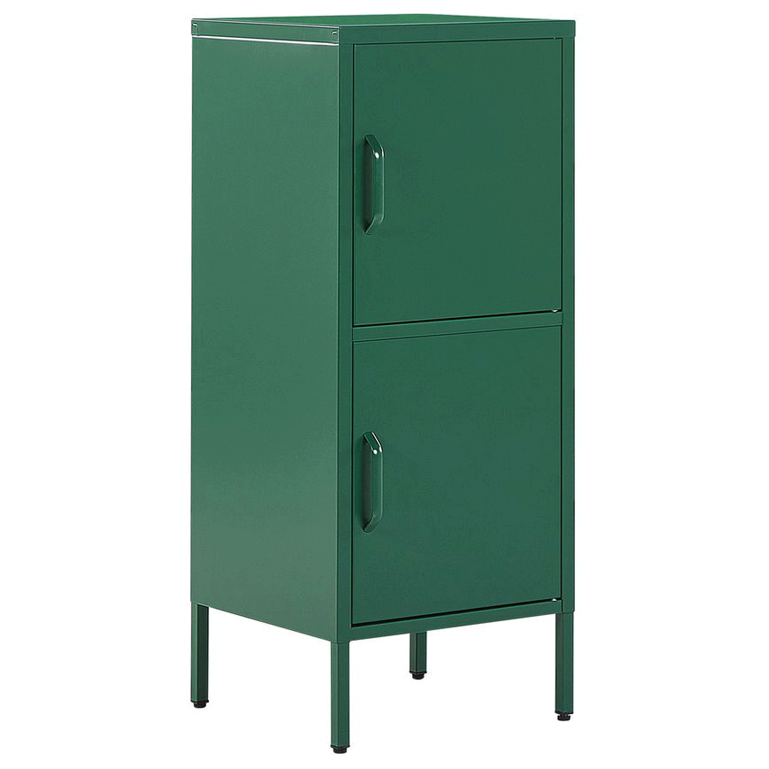 Industriaalinen kaappi hyllyillä. Täydellinen kaappi mihin tahansa kodin tilaan: työhuoneeseen, makuuhuoneeseen tai eteiseen. Pienen koon ansiosta se sopii ahtaisiinkin tiloihin. Teräksestä valmistettu vihreä kaappi on erittäin vakaa ja pinnoitteen ansiosta se kestää hyvin korroosiota. Kaapissa on kaksi ovea, joiden suojassa voit säilyttää asiakirjoja, kirjoja ja muita tärkeitä tavaroita.