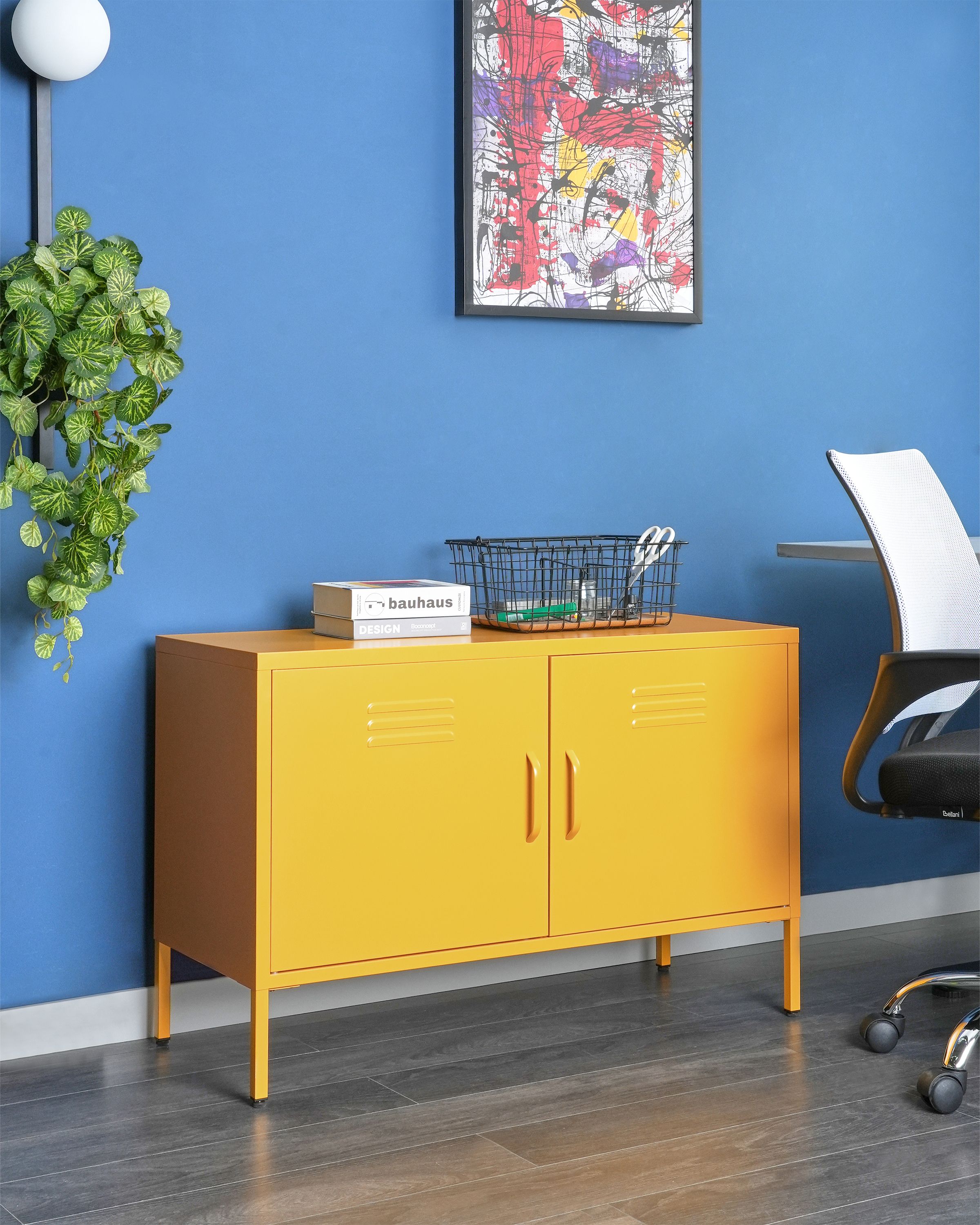 Industriaalinen toimistokaappi. Päivitä kodin sisustusta tällä teollisella, monikäyttöisellä kaapilla. Matalassa kaapissa on kaksi hyllyä, jotka kätkeytyvät ovien taakse ja tarjoavat paljon säilytystilaa erilaisille tavaroille. Kestävästä teräksestä valmistettu kaappi on helppohoitoinen ja kestää monia vuosia. Jaloissa sijaitsevat muovitapit suojaavat lattiaa naarmuilta. Mattaviimeistelty keltainen väri sopii loistavasti moniin eri sisustustyyleihin luoden samalla modernin tunnelman mihin tahansa tilaan.