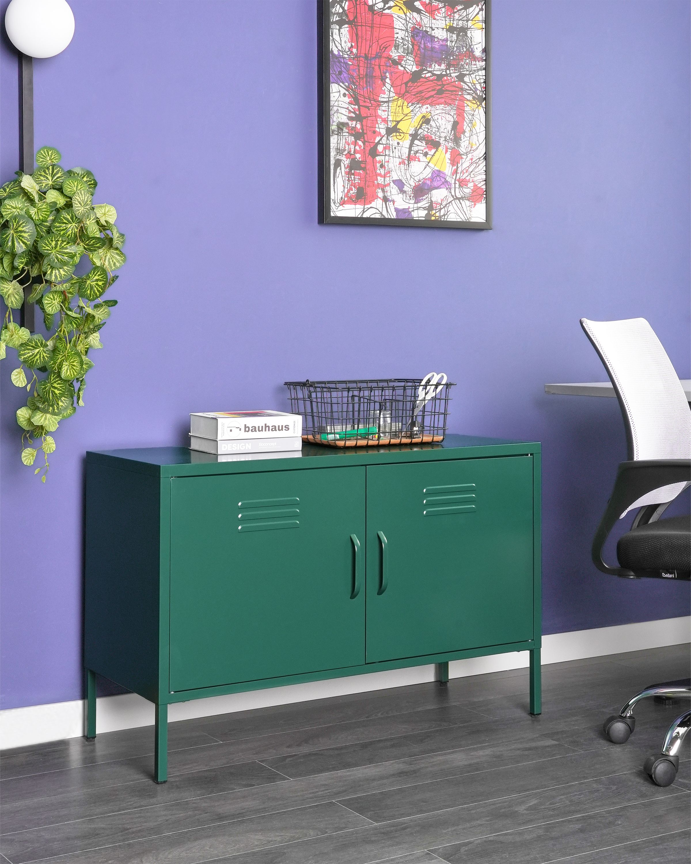 Industriaalinen toimistokaappi. Päivitä kodin sisustusta tällä teollisella, monikäyttöisellä kaapilla. Matalassa kaapissa on kaksi hyllyä, jotka kätkeytyvät ovien taakse ja tarjoavat paljon säilytystilaa erilaisille tavaroille. Kestävästä teräksestä valmistettu kaappi on helppohoitoinen ja kestää monia vuosia. Jaloissa sijaitsevat muovitapit suojaavat lattiaa naarmuilta. Mattaviimeistelty vihreä väri sopii loistavasti moniin eri sisustustyyleihin luoden samalla modernin tunnelman mihin tahansa tilaan.