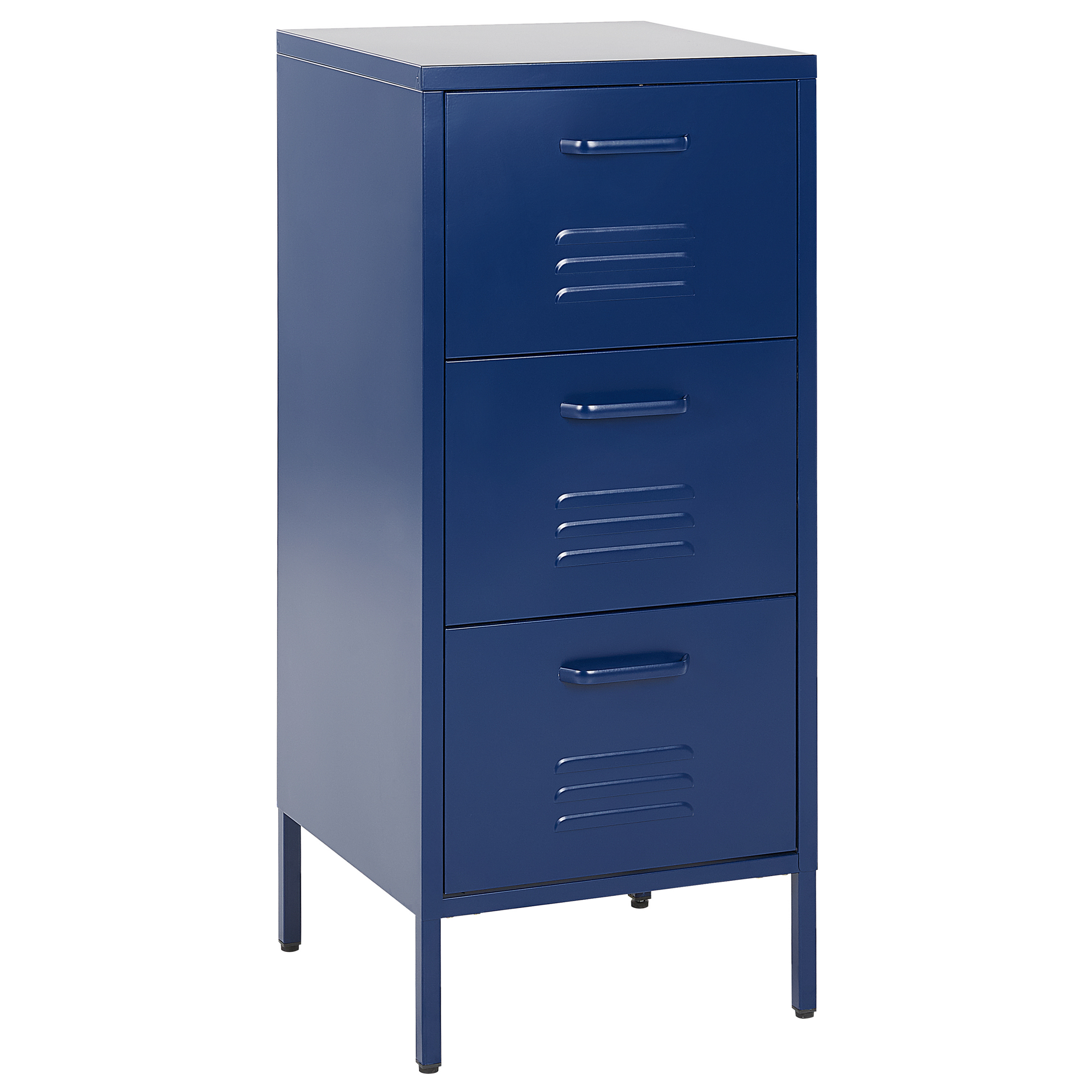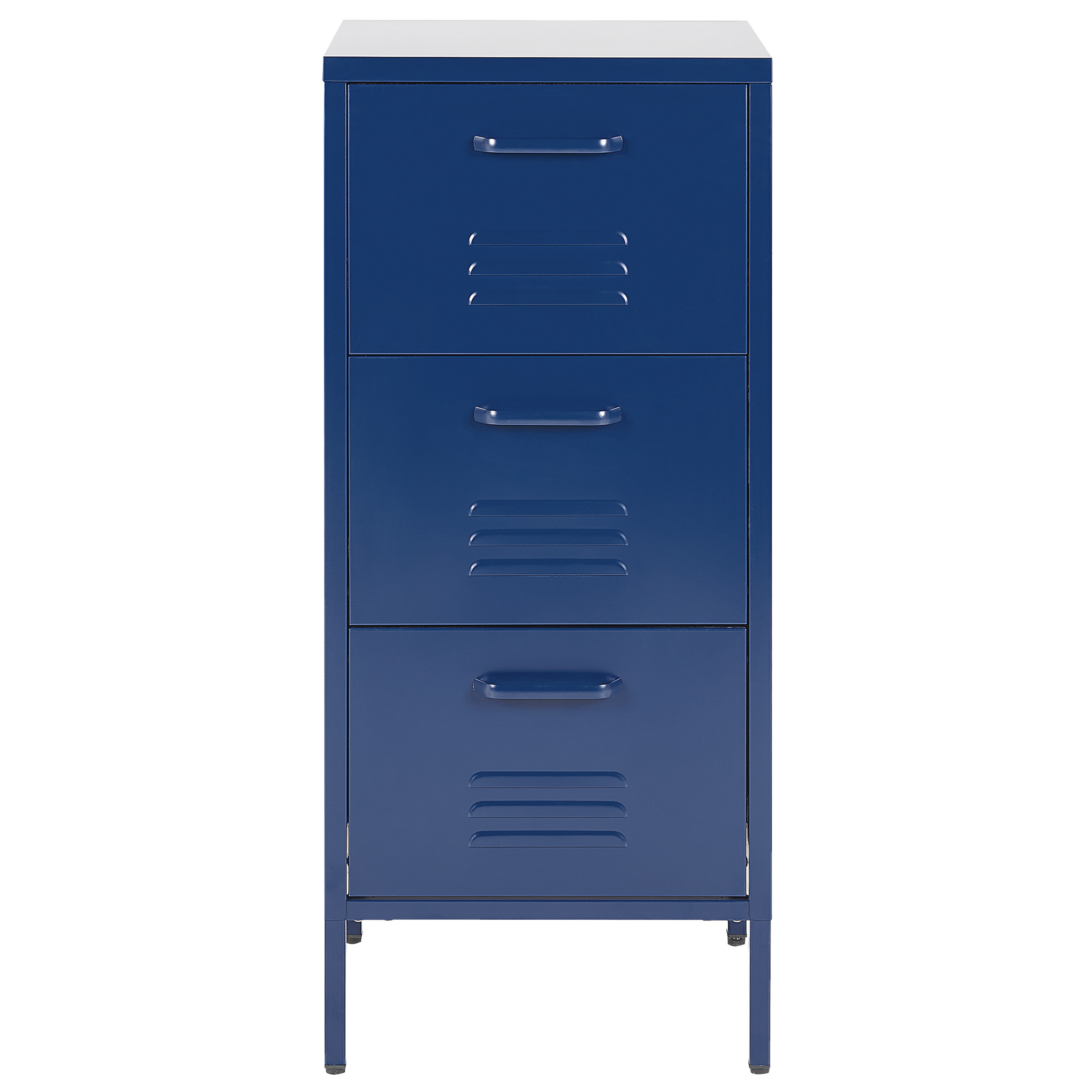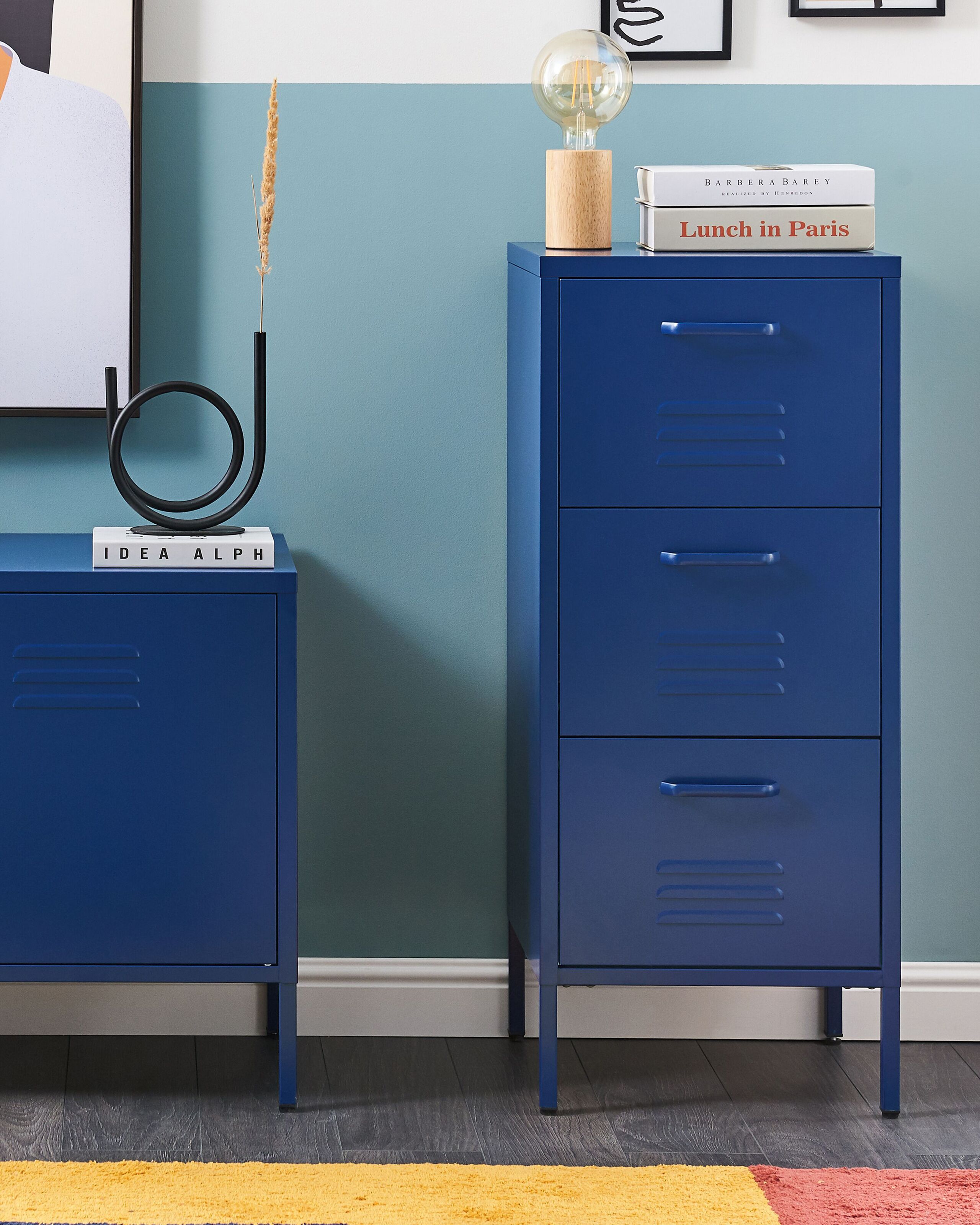 Industriaalinen laatikosto. Kapean muotoilun ansiosta tämä toimistokaappi mahtuu mihin tahansa tilaan ja auttaa säilytystilan maksimoimisessa. Laivastonsininen laatikosto on valmistettu teräksestä, joka tekee siitä vakaan sekä erittäin helppohoitoisen. Edessä olevat kapeat tuuletusaukot toimivat tyyliin sopivana aksenttina ja varmistavat riittävän ilmankierron. Laatikosto on loistava valinta kotitoimistoon, mutta sopii myös mihin tahansa persoonalliseen tai industriaaliseen sisustukseen.