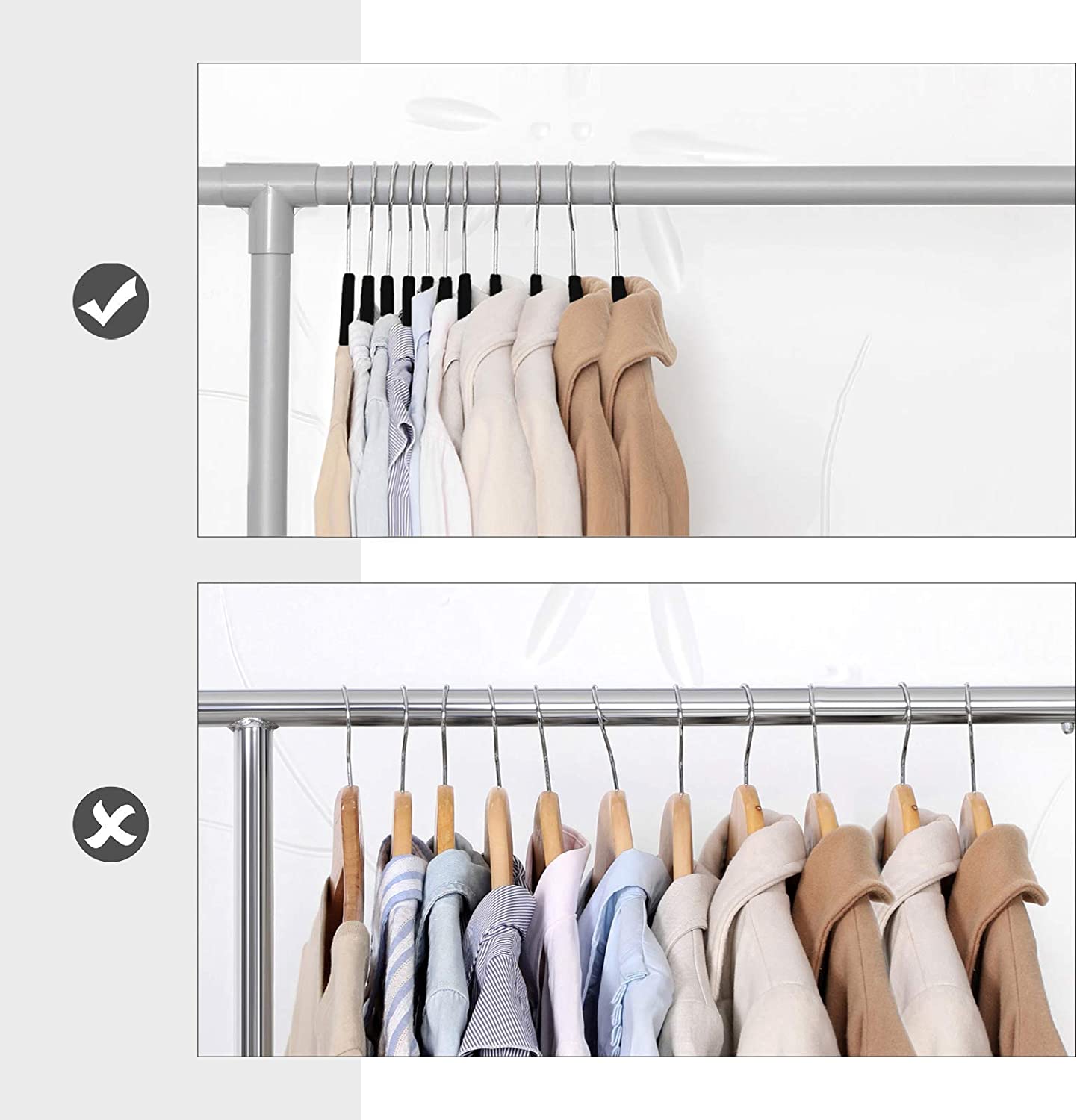 Näiden henkareiden lisäetuna on, että vaatteet eivät lipsu niistä eivätkä aiheuta ryppyjä herkkiin kankaisiin.