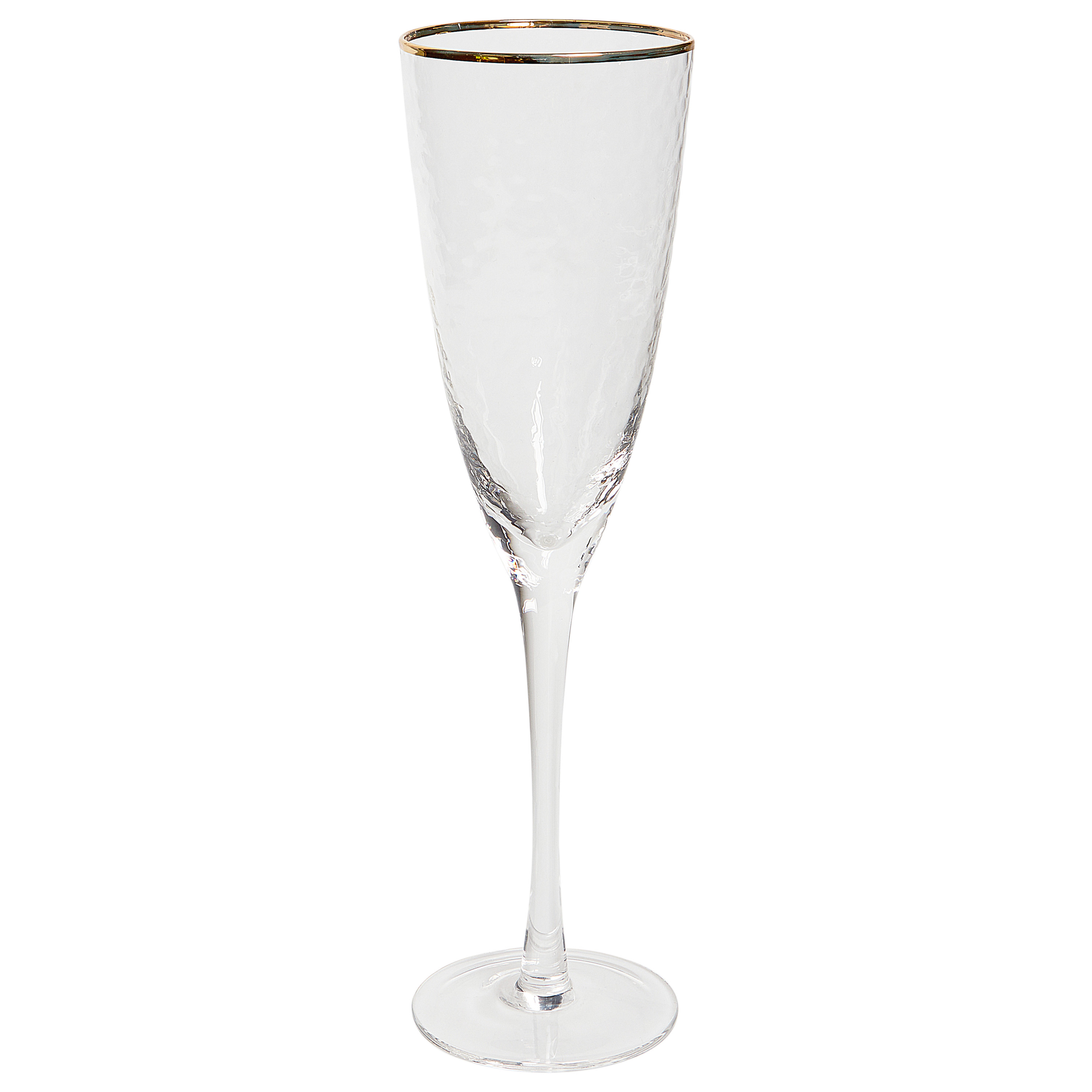 Käsinpuhalletut kultareunaiset kapeat samppanjalasit. Tämä elegantti, käsin puhallettujen samppanjalasien setti sopii niin arkeen kuin juhlaankin, tehden jokaisesta tilaisuudesta erityisen. Niissä on pitkä jalka, tyylikäs moukaroitu tekstuuri sekä hienostunut kultainen reunus, jotka antavat laseille vastustamattoman vintage-viehätyksen. Samppanjalasit sopivat täydellisesti kuohuvien tarjoiluun, antaen kupliville juomille todella näyttävän ilmeen.