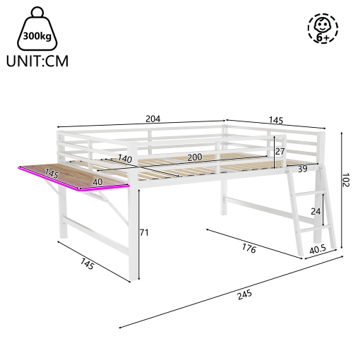 Sänky 140x200, parisänky, metallia, kaiteella, tikkailla, työpöydällä, LED, valkoinen, ilman mattoa