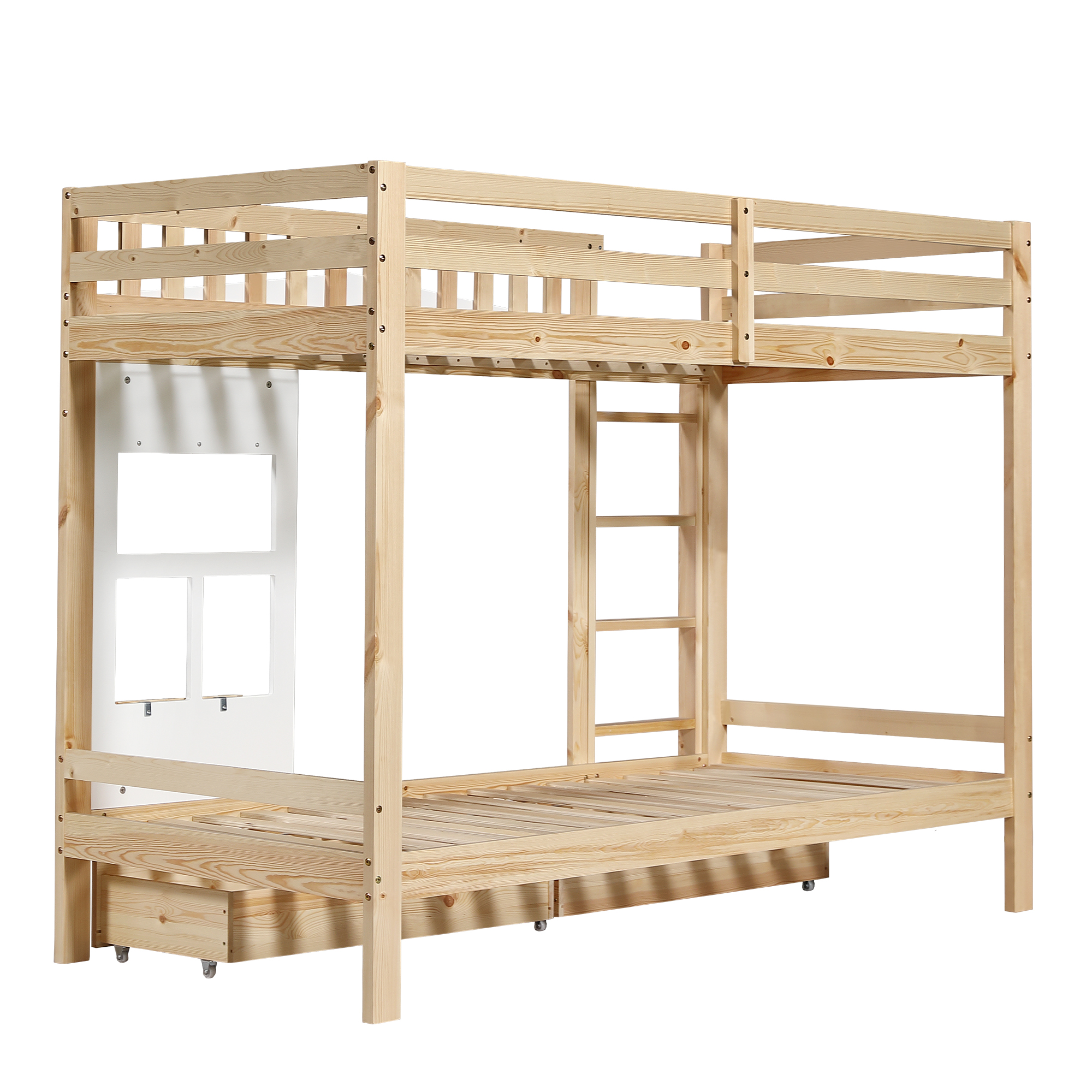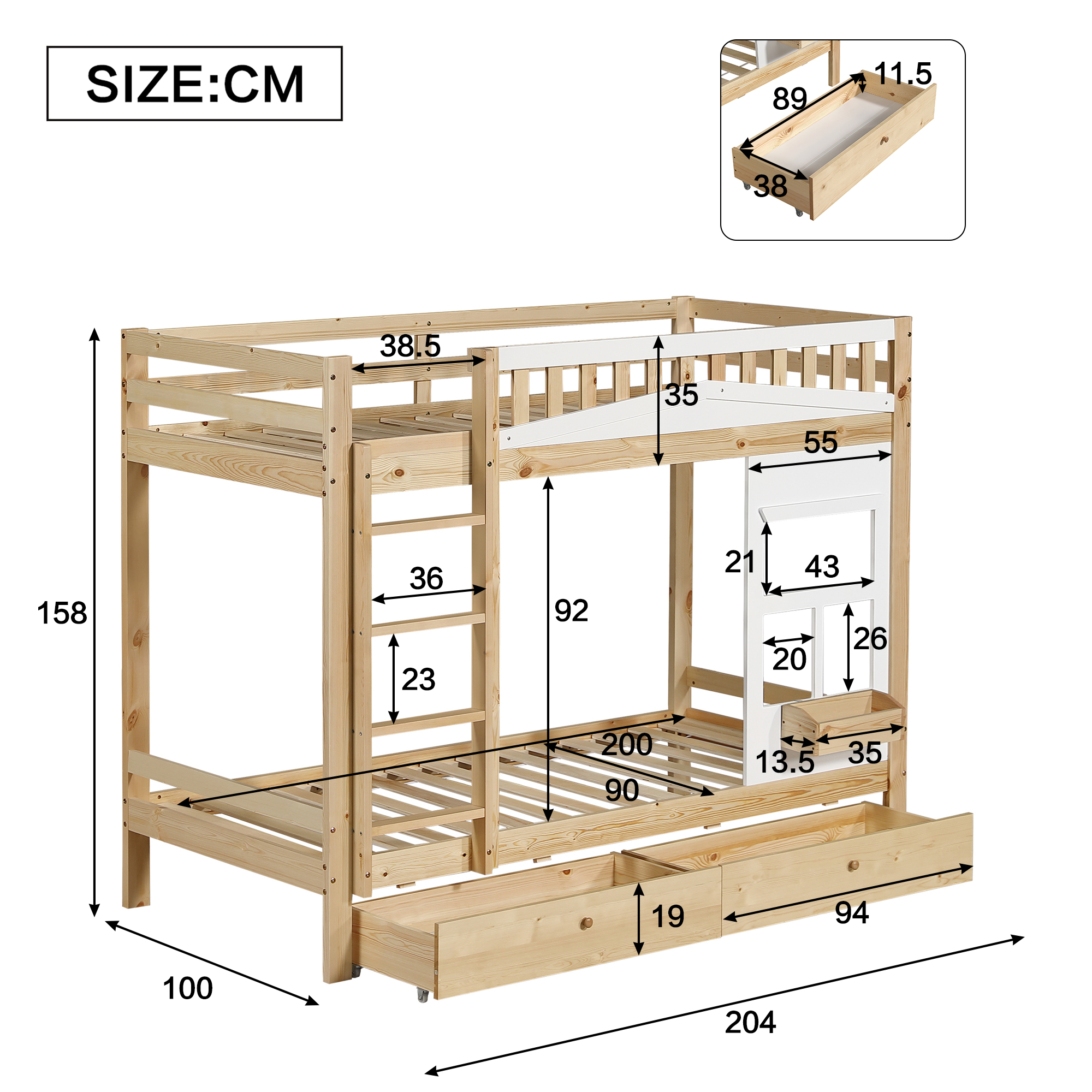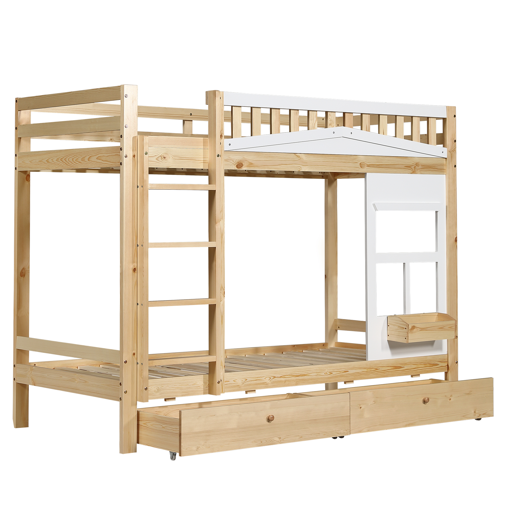 Sänky on valmistettu kestävästä männystä sekä pitkäikäisestä MDF- ja vanerilevystä, joten se pysyy vakaana käytössä vuodesta toiseen. Yläsängyn ikkunoiden muotoiset aukot toimivat sekä turvalaitoina että tuuletusaukkoina. Sängyn päädyssä on pieni säilytysrasia, johon voi asettaa koristeita tai leluja.