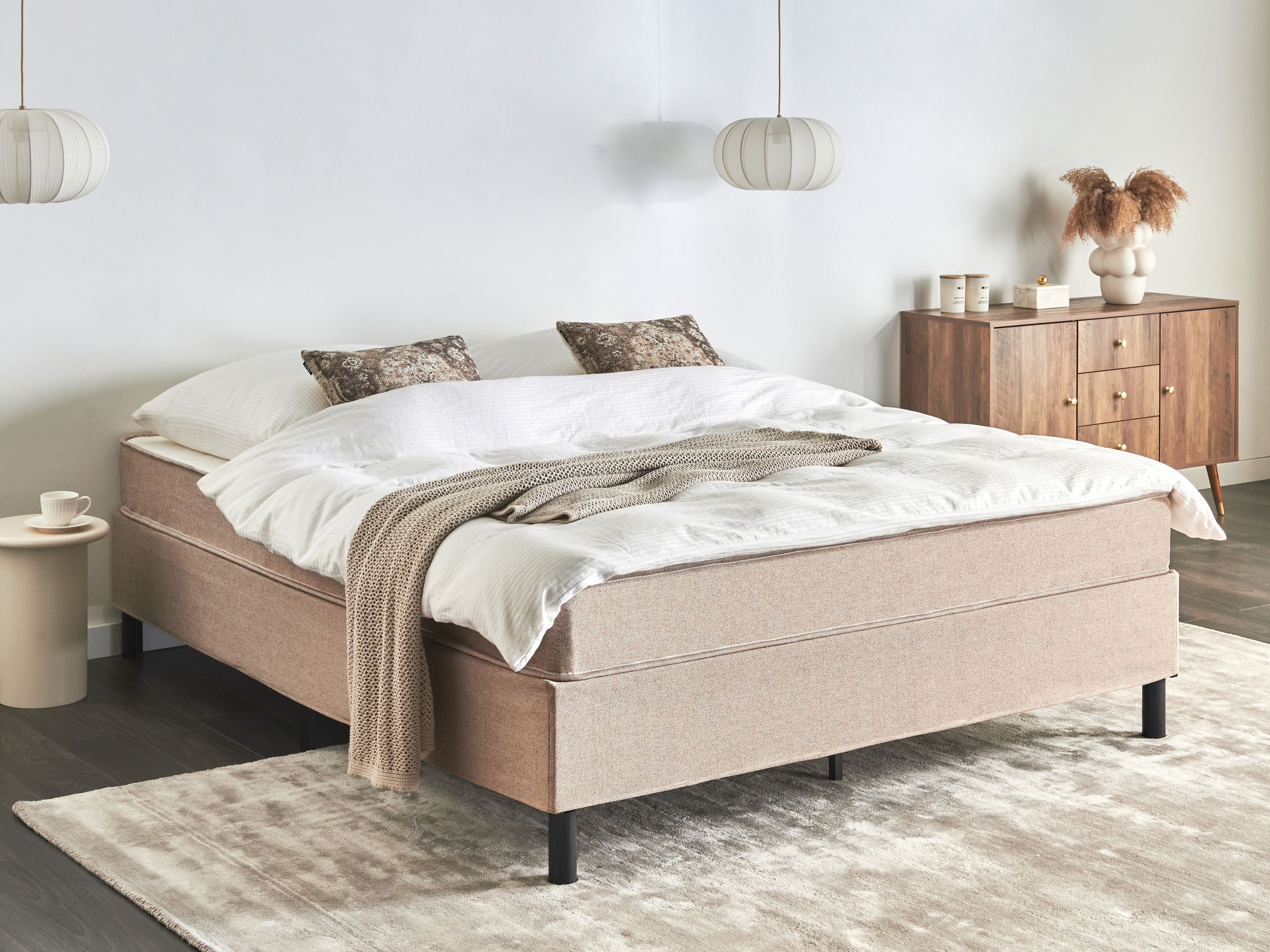 Moderni jenkkisänky ilman sängynpäätyä. Tämä moderni jenkkisänky täydentää vaivattomasti mitä tahansa sisustustyyliä hillityn beigen sävynsä ansiosta, mikä tekee siitä täydellisen lisän jokaiseen makuuhuoneeseen. Pehmeällä polyesterikankaalla verhoillun sängyn mukana tulee mukava pussijousitettu patja, joka varmistaa levolliset ja rauhalliset yöunet. Tukeva rautarunko sälepohjalla tarjoaa erinomaisen kehon tuen, ja korkealaatuiset jalat lisäävät ripauksen eleganssia sekä takaavat kestävyyden ja tukevuuden.