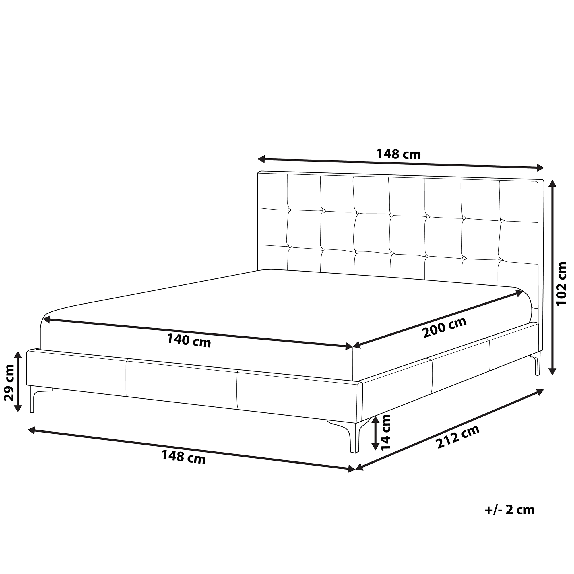 Tuftattu sängynrunko sälepohjalla. Modernien muotojen ja klassisten koristeiden ansiosta makuuhuoneesi saa tyylikkään ilmeen. Sen matala runko on verhoiltu pehmeällä keinonahalla, jota korostaa yksinkertaiset metalliset jalat. Pääty on pehmustettu paksusti, jotta voit nojata sitä vasten ja nauttia kirjan lukemisesta tai television katsomisesta. Nappituftaus antaa sängylle luksuksen henkeä, tehden siitä upean ja muodikkaan valinnan mihin tahansa sisustustyyliin.