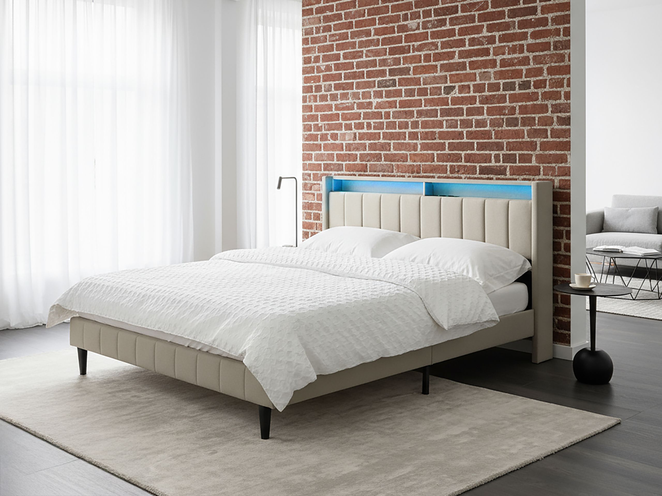 Moderni LED-sänky säilytystilalla ja USB-porteilla. Tämä pehmeällä polyesterikankaalla verhoiltu parisänky tarjoaa älykkään yhdistelmän mukavuutta, tyyliä ja toiminnallisuutta. Sängynpäädyssä on piilotettu säilytystila, joka pitää kirjat, laturit ja muut pikkutavarat käden ulottuvilla, sekä sisäänrakennetut USB-portit ja kaksoispistorasia, jotka helpottavat laitteiden latausta. RGB-LED-valo tarjoaa mahdollisuuden tunnelman säätämiseen – valitse neljästä valotilasta ja säädä väriä tai kirkkautta makusi mukaan kätevällä kaukosäätimellä. Tukeva runko varmistaa pitkäikäisen kestävyyden, kun taas kapeat jalat ja pystysuora tikkaus kohottavat selkeälinjaista, modernia ilmettä, minkä ansiosta sänky sulautuu monenlaisiin nykyaikaisiin makuuhuoneisiin.