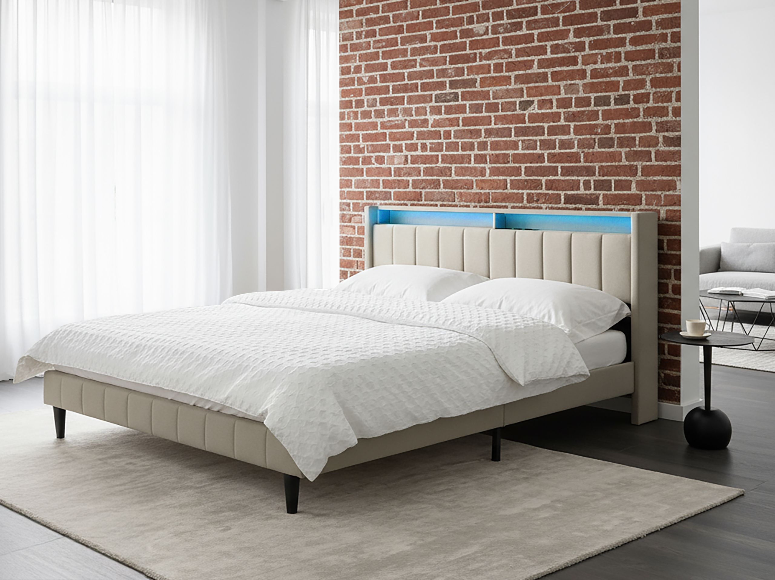 Moderni LED-sänky säilytystilalla ja USB-porteilla. Tämä pehmeällä polyesterikankaalla verhoiltu parisänky tarjoaa älykkään yhdistelmän mukavuutta, tyyliä ja toiminnallisuutta. Sängynpäädyssä on piilotettu säilytystila, joka pitää kirjat, laturit ja muut pikkutavarat käden ulottuvilla, sekä sisäänrakennetut USB-portit ja kaksoispistorasia, jotka helpottavat laitteiden latausta. RGB-LED-valo tarjoaa mahdollisuuden tunnelman säätämiseen – valitse neljästä valotilasta ja säädä väriä tai kirkkautta makusi mukaan kätevällä kaukosäätimellä. Tukeva runko varmistaa pitkäikäisen kestävyyden, kun taas kapeat jalat ja pystysuora tikkaus kohottavat selkeälinjaista, modernia ilmettä, minkä ansiosta sänky sulautuu monenlaisiin nykyaikaisiin makuuhuoneisiin.