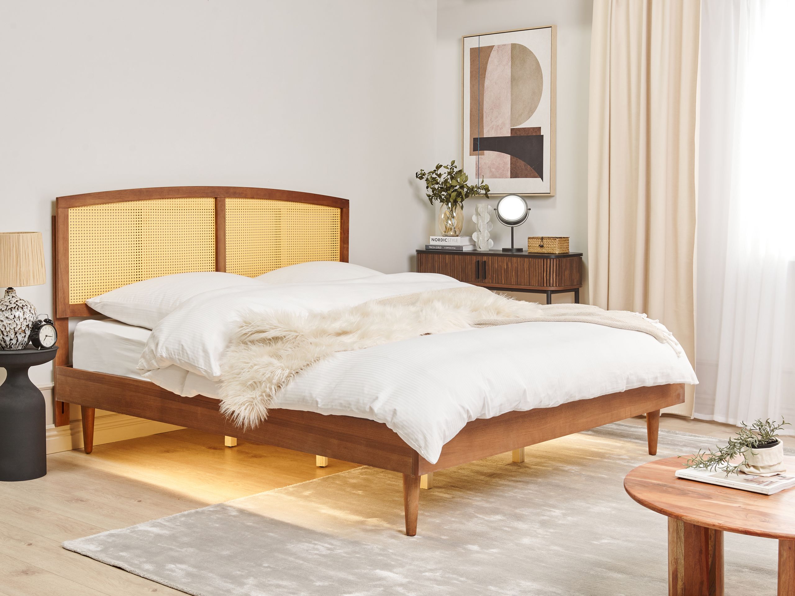 Rustiikkinen puinen sänky rottinkipunoksella. Tämä sängynrunko takaa hyvät yöunet ja uudistaa samalla makuuhuoneen ilmettä. Sänky on valmistettu laadukkaasta kumipuusta, minkä ansiosta se on erittäin kestävä, tukeva ja vähän huoltoa vaativa. Siinä on näyttävä sängynpääty, jota koristaa kaunis rottinkipunos. Lisäksi pääty on säädettävissä, joten voit nopeasti muuttaa sen korkeutta. Mukana tulevien LED-valojen avulla valaiset makuuhuoneen miellyttävällä ja tunnelmallisella valolla.