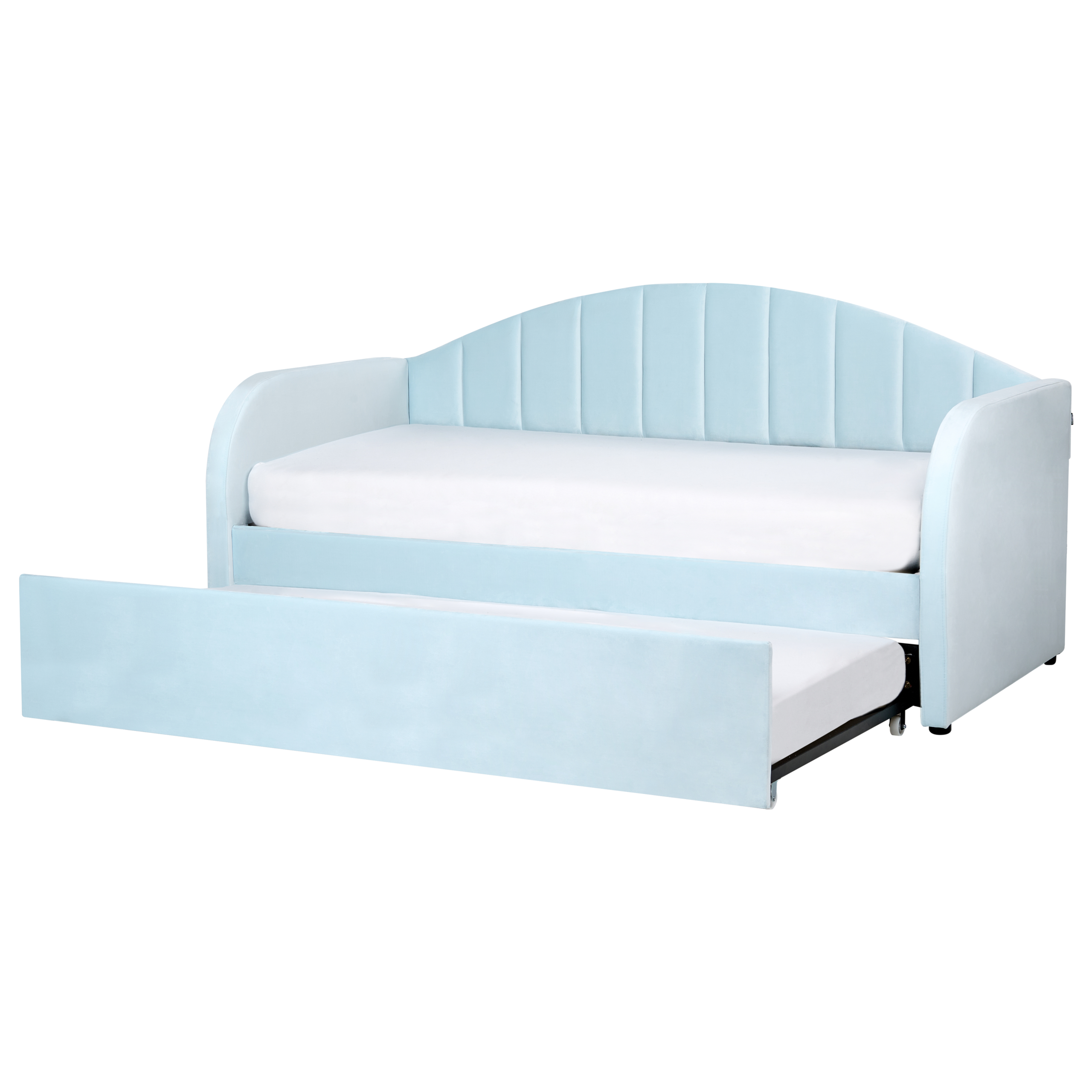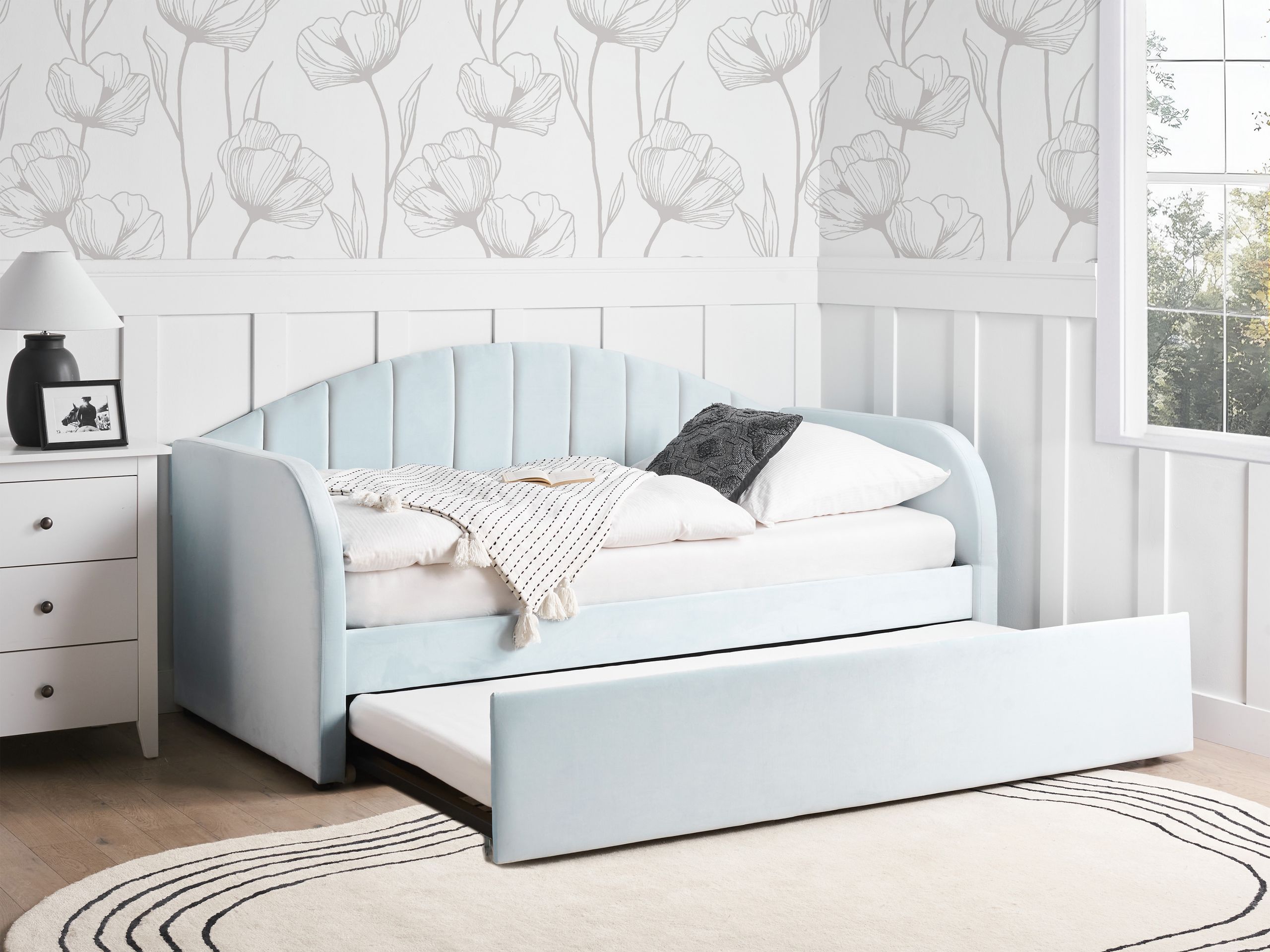 Verhoiltu päivävuode varavuoteella. Tämä monikäyttöinen sohvasänky on täydellinen lisä niin lastenhuoneisiin, pieniin asuntoihin kuin vierashuoneisiinkin. Hurmaava vaaleansininen samettiverhoilu, kaareva selkänoja sekä koristeelliset tikkaukset tekevät vuoteesta ajattoman lisän, joka sopii moniin sisustuksiin. Rungon sisälle kätkeytyvä lisävuode tarjoaa ylimääräistä nukkumatilaa. Kestävä runko, sälepohjat ja tukeva rakenne takaavat pitkäikäisyyden.