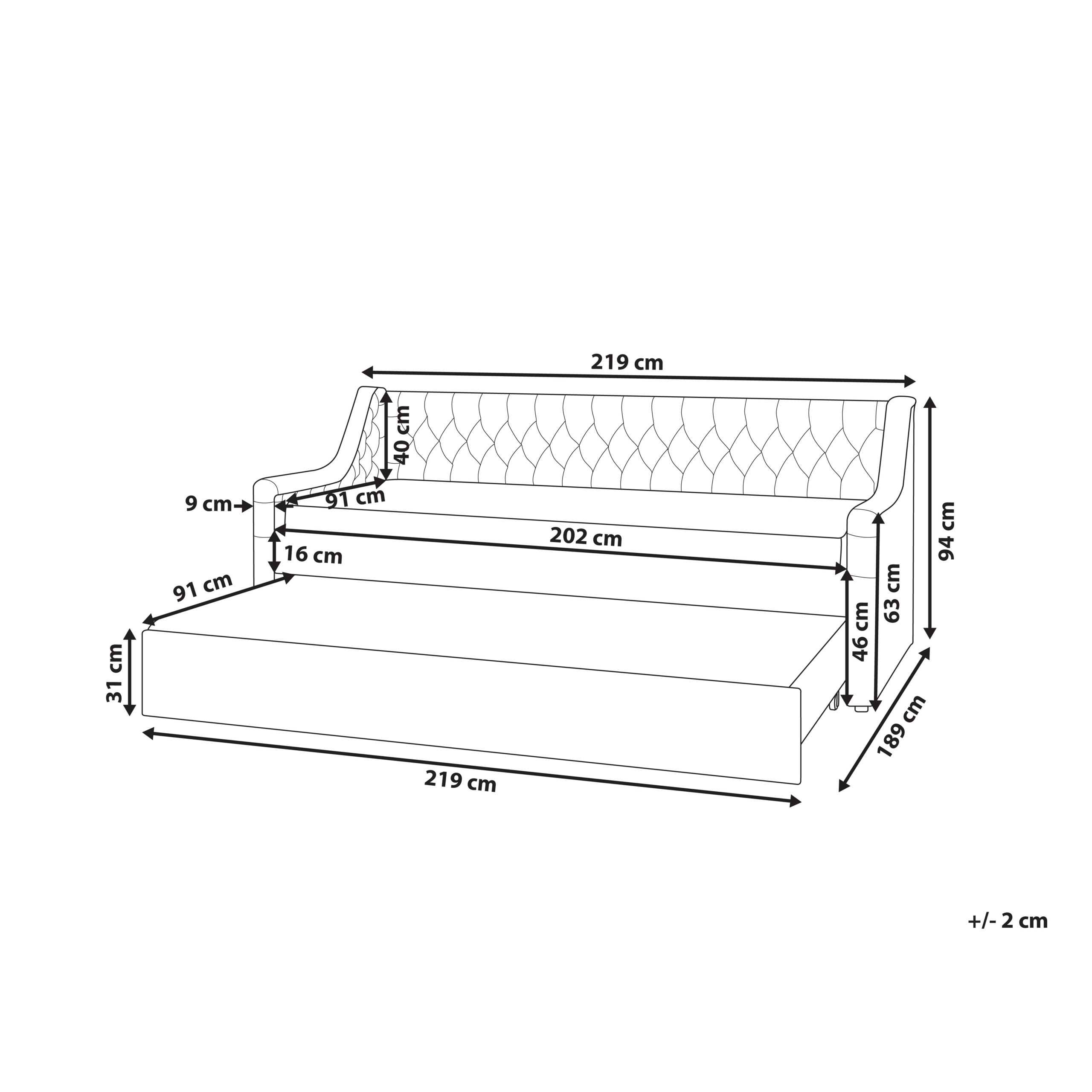 Verhoiltu peti ulosvedettävällä lisävuoteella. Tämä sohvasänky on loistava lisä huoneeseen kuin huoneeseen, aina glamour-tyylisistä perinteisiin tai retrotyylisiin. Sen vankka ja kestävä runko on verhoiltu miellyttävän tuntuisella sametilla, joka antaa vuoteelle hienostuneen elegantin ilmeen. Matalat käsinojat ja tikattu selkänoja korostavat sängyn klassista muotoilua. Vartaloa tukeva sälepohja tarjoaa laadukkaat ja häiriöttömät unet. Lisäksi vierasvuoteessa on ulosvedettävä lisävuode, joka on helppo vetää ulos tarpeen vaatiessa.