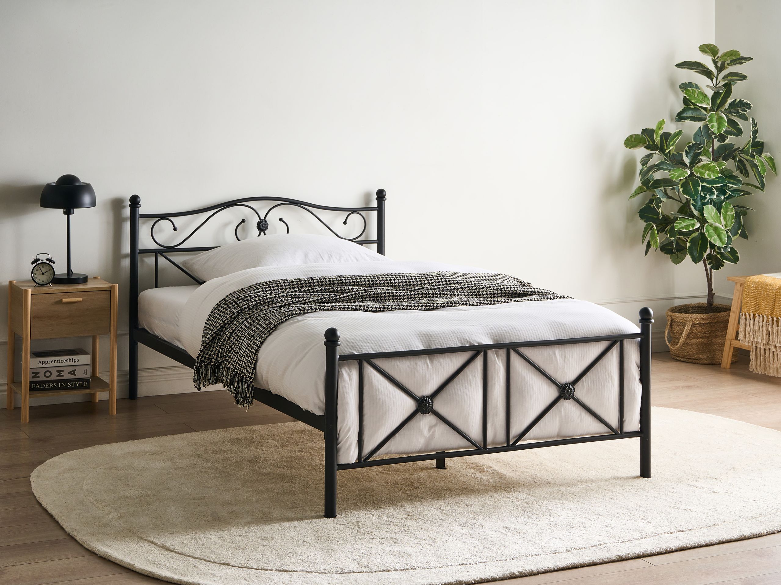 Romanttinen metallinen sängynrunko. Luo mukava nukkumispaikka tällä retrotyylin inspiroimalla sängynrungolla. Laadukkaasta teräksestä valmistettu ja klassisen mustaksi maalattu runko sulautuu vaivattomasti monenlaisiin värimaailmoihin ja sisustuksiin. Kestävästä poppelipuusta valmistettu joustava sälepohja tarjoaa erinomaisen tuen selälle. Koristeellinen jalkopää ja sängynpääty on viimeistelty kauniilla kuvioinnilla, joka tekee sängystä tyylikkään keskipisteen jokaiseen makuhuoneeseen.