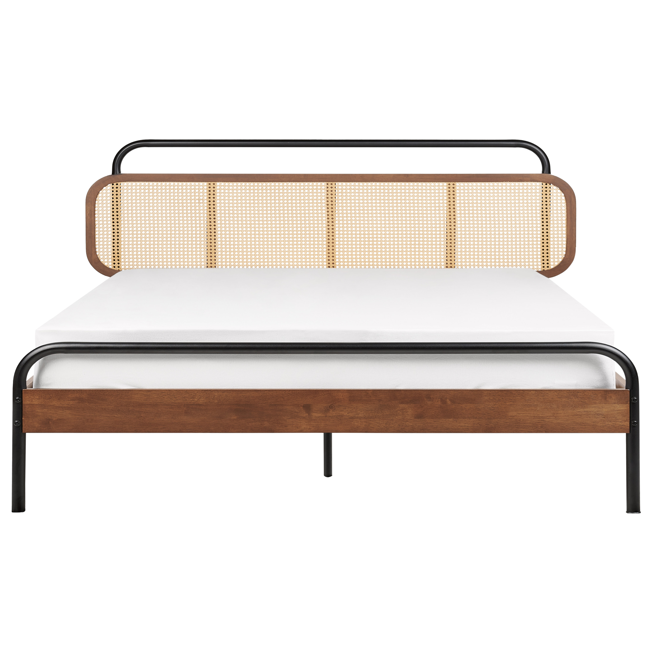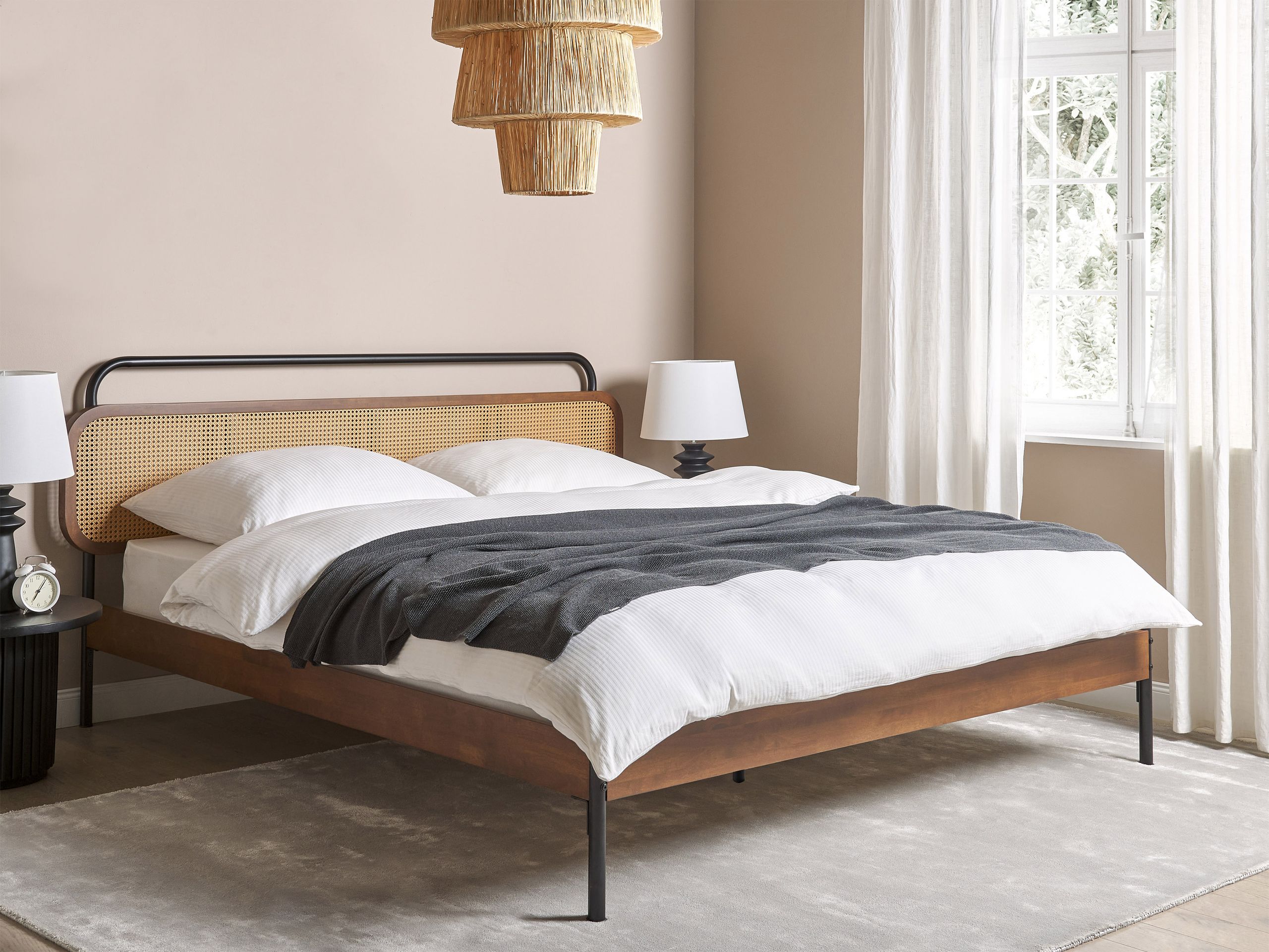 Retrotyylinen puusänky wieniläispunotulla päädyllä. Nauti levollisista yöunista ja herää virkeänä tässä parisängyssä, jonka sängynpääty on koristeltu hurmaavalla wieniläispunoksella. Tyyliä ja mukavuutta harmonisesti yhdistävä sänky takaa rauhalliset ja tyylikkäät unet. Runko on valmistettu tukevasta ja kestävästä kumipuusta, ja sitä täydentävät vankat mustat teräsjalat, jotka korostavat sängyn ajatonta muotoilua. Mukana tuleva sälepohja varmistaa parhaan mahdollisen tuen patjalle. Materiaaliensa ansiosta sänky on pitkäikäinen, ja se sulautuu vaivattomasti monenlaisiin sisustuksiin.