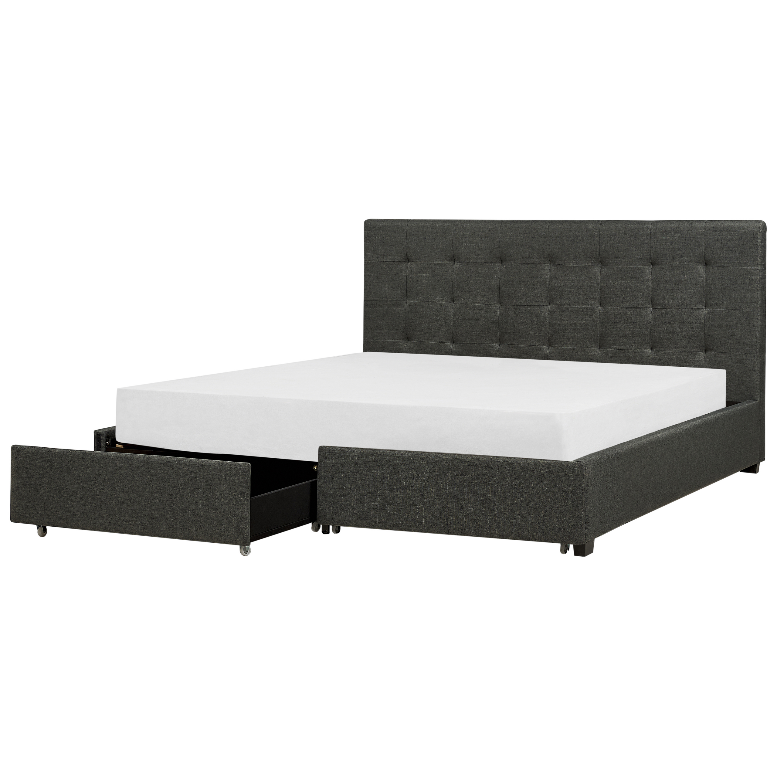 Moderni verhoiltu parivuode säilytystilalla. Tämä upeasti muotoiltu parisänky tarjoaa äärimmäisen mukavuuden. Paksusti pehmustetussa sängynpäädyssä on tyylikäs tuftaus, joka tuo ylellistä tunnelmaa mihin tahansa makuuhuoneeseen. Sänky on verhoiltu helppohoitoisella polyesterillä, jonka neutraali tummanharmaa väri saa sängyn sulautumaan täydellisesti nykyaikaisiin sisustuksiin. Vanerista valmistetussa rungossa on kaksi tilavaa, pyörillä varustettua laatikkoa, jotka tarjoavat riittävästi tilaa vuodevaatteille sekä lakanoille.
