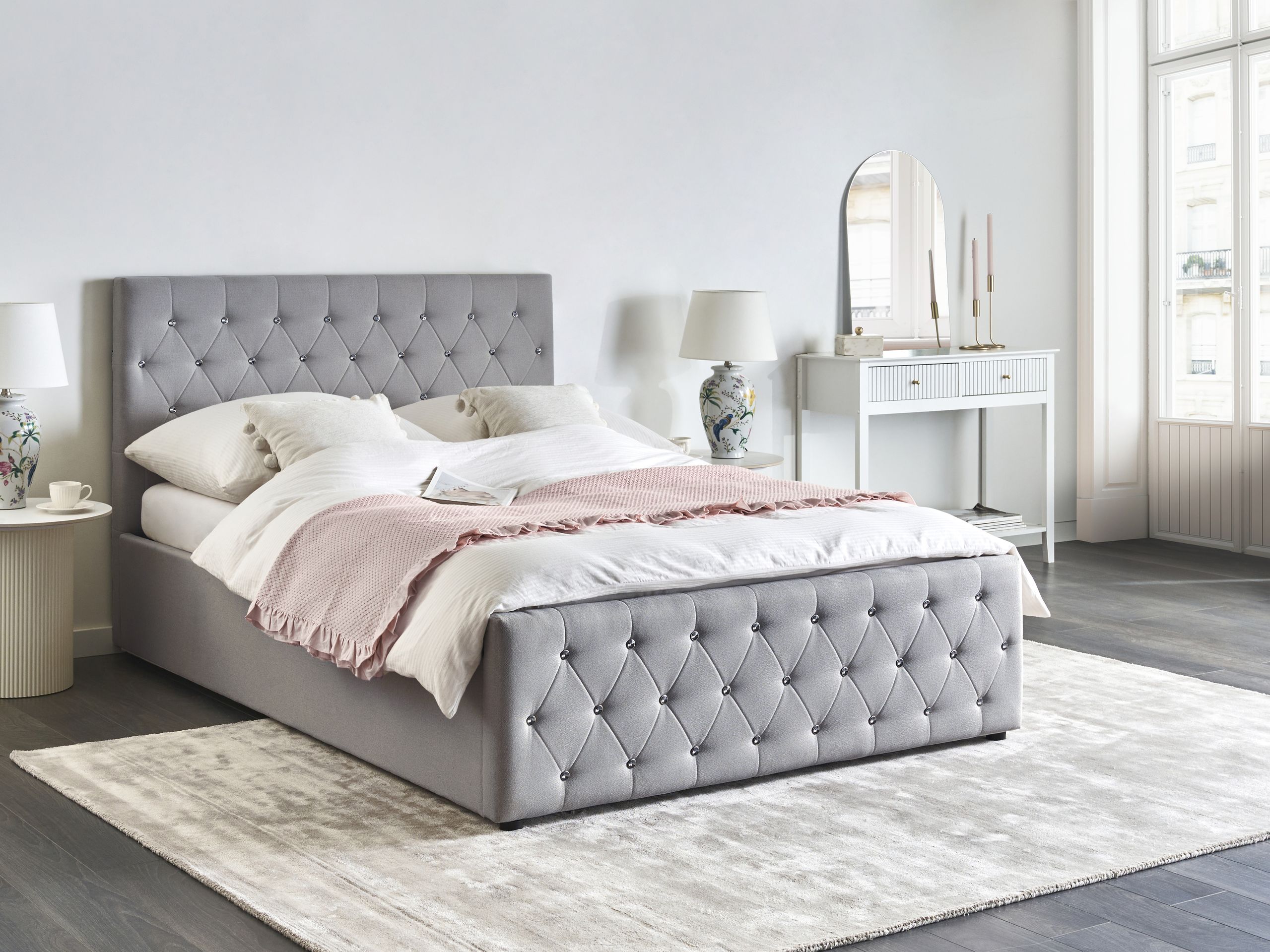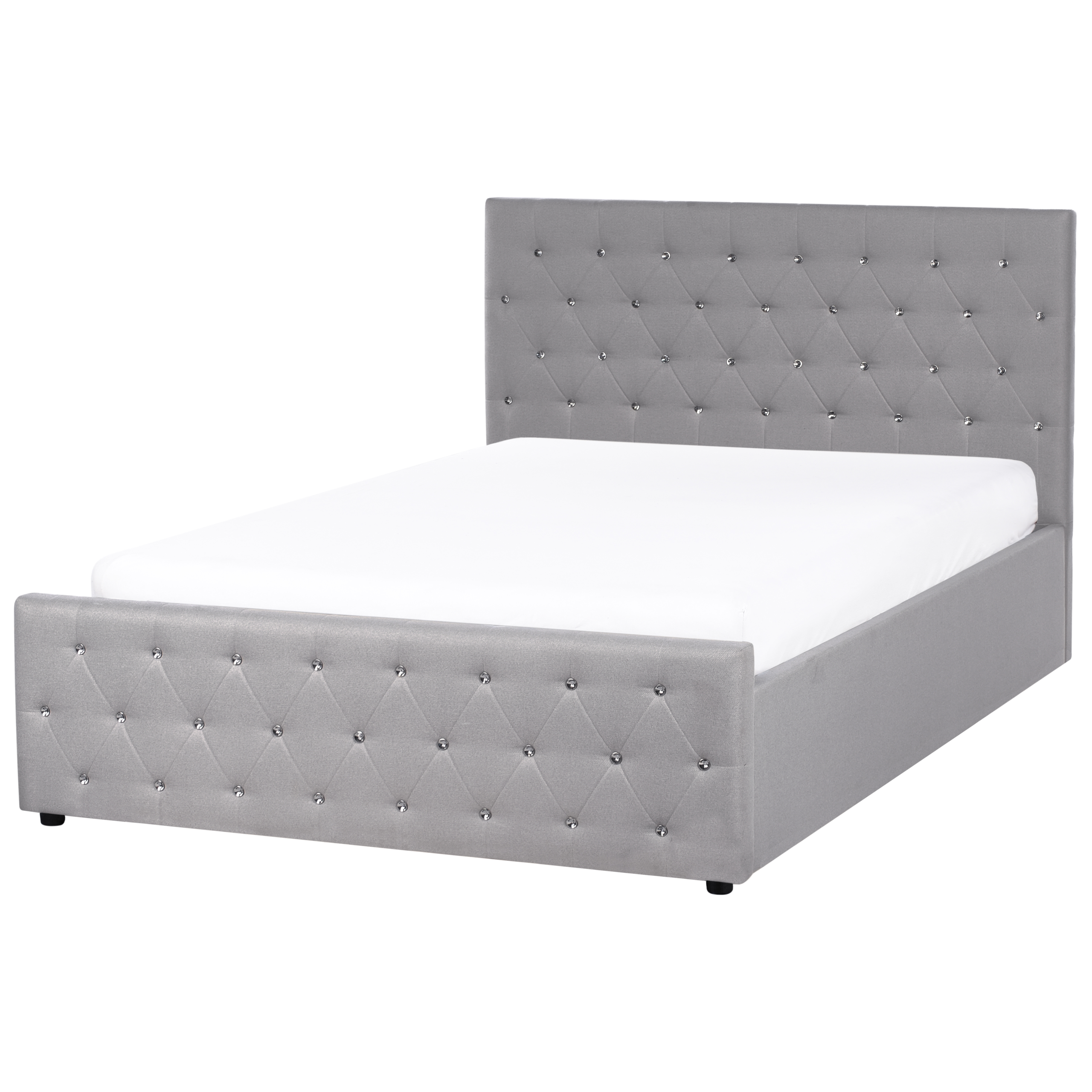 Ylellinen parisänky säilytystilalla. Tämä mukavuutta sekä tyylikästä ja hienostunutta ilmettä tarjoava parisänky on täydellinen valinta hyviä yöunia kaipaaville. Sen metallirunko on verhoiltu pehmeällä, hillityn sävyisellä polyesterikankaalla. Jalka- ja sängynpäädyssä olevat timanttitikkaukset, hienovaraiset tuftaukset ja kauniisti hohtavat tekokristallit tuovat sänkyyn ripauksen glamouria. Tukevan sälepohjan alle kätkeytyvään säilytystilaan mahtuvat vaivattomasti lakanat ja muut ylimääräiset vuodevaatteet.